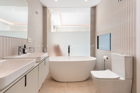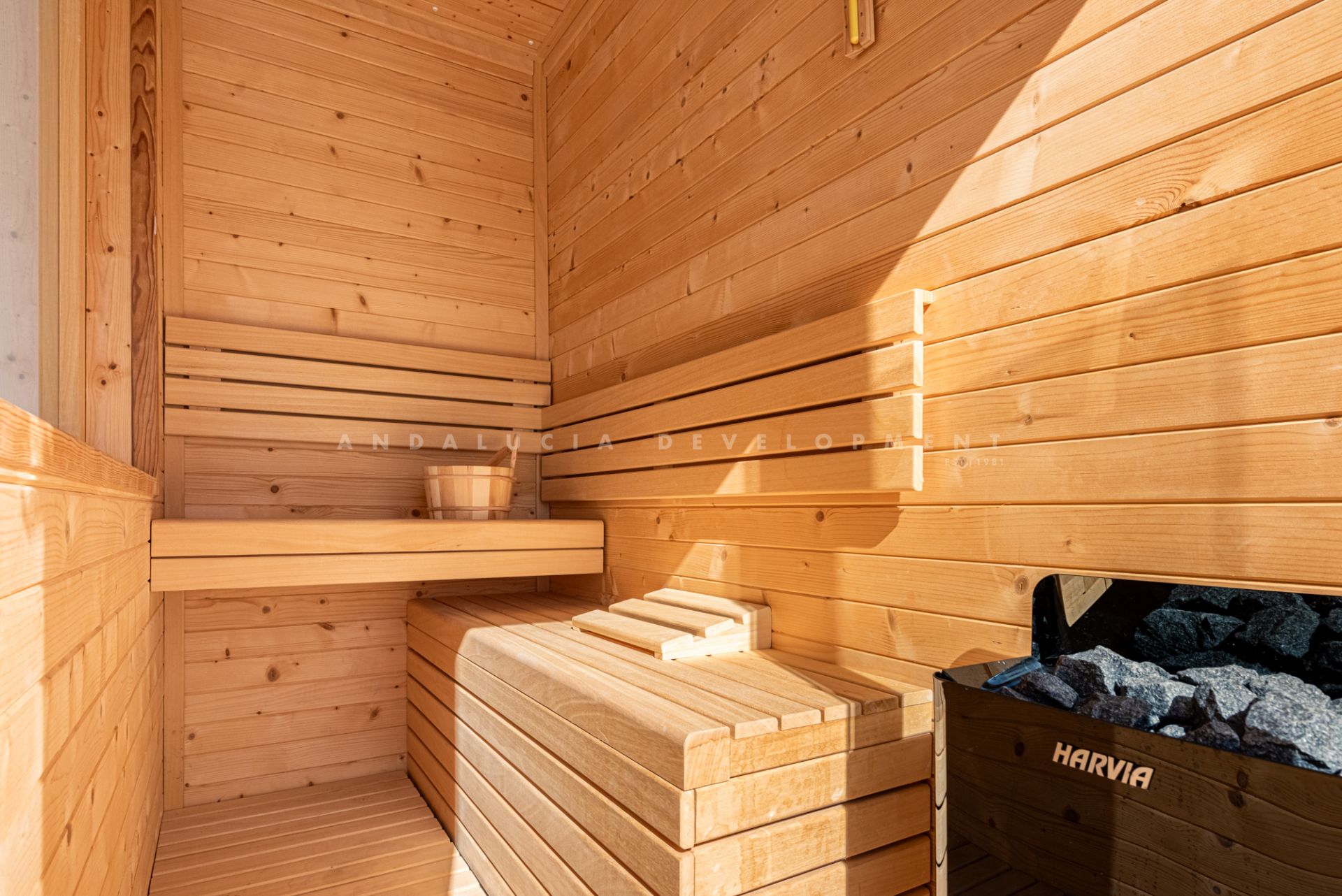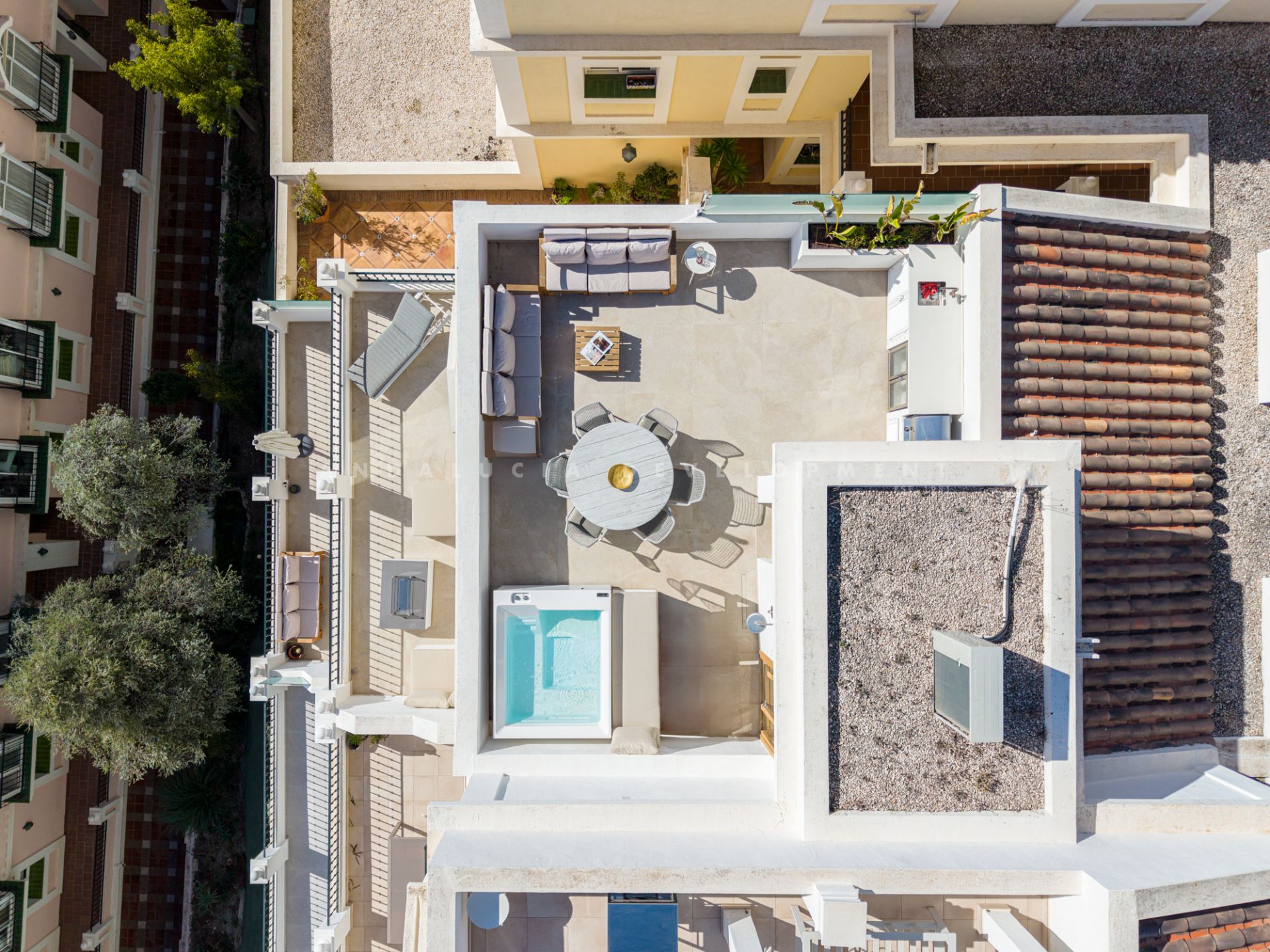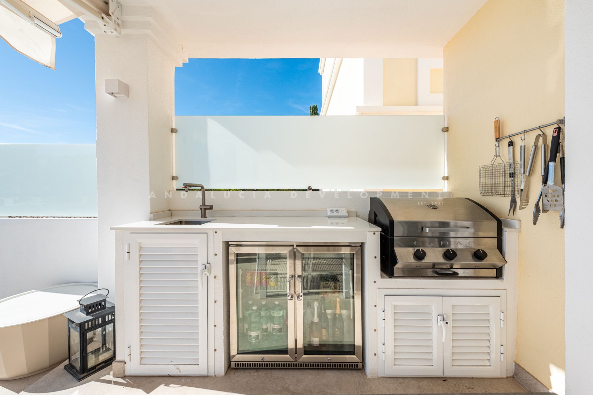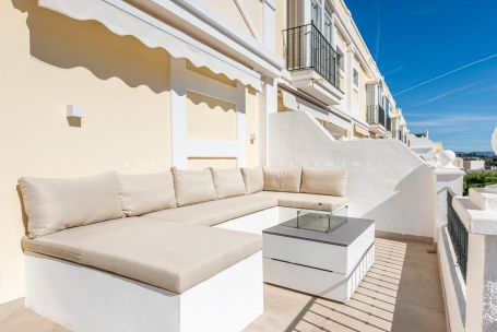 Discover the finest residence in Aloha Gardens, a beautifully reformed semi-detached home located in the heart of Nueva Andalucía, Marbella. Set within one of the area’s most sought-after urbanisations, this exceptional property blends contemporary luxury, panoramic views, and an unbeatable location just steps from restaurants, cafés, and padel and tennis courts, and only a few minutes’ drive from world-class golf courses including Los Naranjos, Aloha, and Las Brisas. The home offers 255 m² of built space plus generous terraces, distributed over three elegant floors with a total of 4 bedrooms and 3 bathrooms, all designed to make the most of its south-facing orientation and open terraces that enjoy sunshine from morning to evening. From the ground level onward, you can already enjoy beautiful sea views. On the ground floor, a bright open-plan layout welcomes you with a stylish living area seamlessly connected to a modern Miele-equipped kitchen. Large sliding doors open onto a spacious terrace featuring an outdoor kitchen and a comfortable lounge area—ideal for relaxing or entertaining. This level also includes a guest bedroom and a full bathroom. The first floor is dedicated to the main sleeping quarters. Here you’ll find the serene master bedroom with its en-suite bathroom and access to a private terrace furnished with a sofa, fireplace, and sunbed. Two additional guest bedrooms share a well-appointed bathroom, making this level perfect for family or visiting friends. Ascending to the third level, the magnificent rooftop solarium serves as the home’s crown jewel. This luxurious space offers a jacuzzi, a sauna, and a fully equipped outdoor kitchen, all set against panoramic views of Nueva Andalucía and the Mediterranean Sea, a spectacular backdrop for both daytime lounging and sunset gatherings. Additional features include Sonos speakers throughout the entire property, including all terraces, as well as two parking spaces, one private and one rented, with the option to extend if needed. The urbanisation itself is impeccably maintained and offers residents access to three beautiful communal swimming pools. Suitable as a permanent residence, a holiday home, or a high-performing rental property for both long- and short-term stays, this is widely considered the best unit in the entire Aloha Gardens development, a rare opportunity in one of Marbella’s most desirable neighbourhoods.