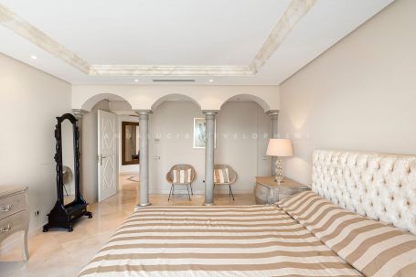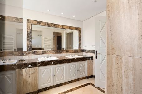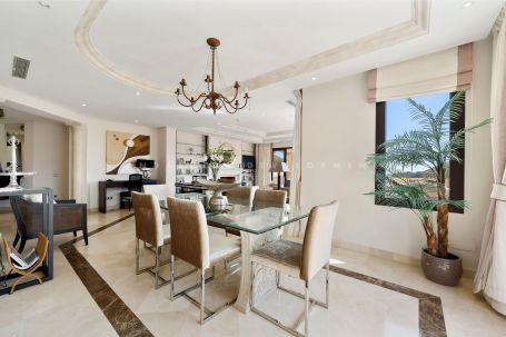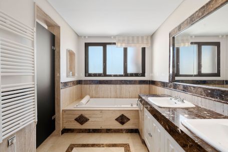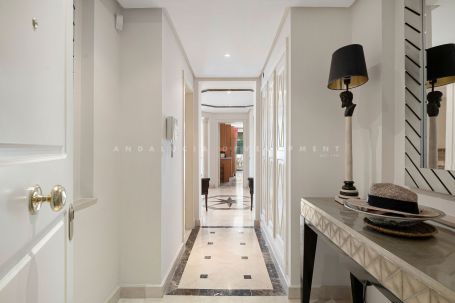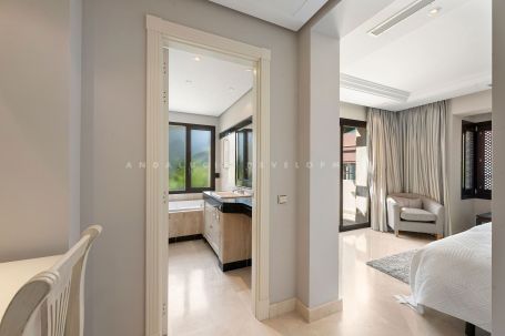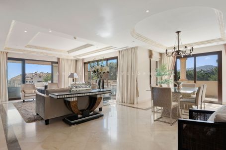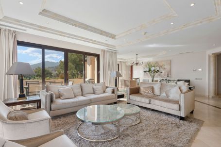 This luxurious three-bedroom middle floor apartment located within the exclusive gated community of Aloha Park in Nueva Andalucia offering 24-hour security and concierge services. This property has an excellent flow throughout and has a south-west orientation with views of both the Mediterranean Sea & mountains. The accommodation comprises an impressive entrance hall, a guest toilet, fully fitted kitchen and laundry room, large living area with fireplace/dining room both with direct access to the wrap-around covered & uncovered terrace with various seated areas ideal for entertaining. All three bedrooms are ensuite and the master bedroom features walk-in closet and access to the terrace.