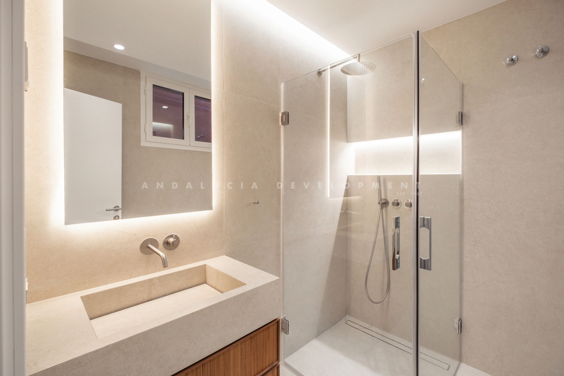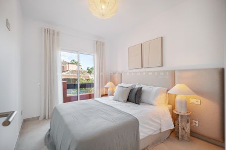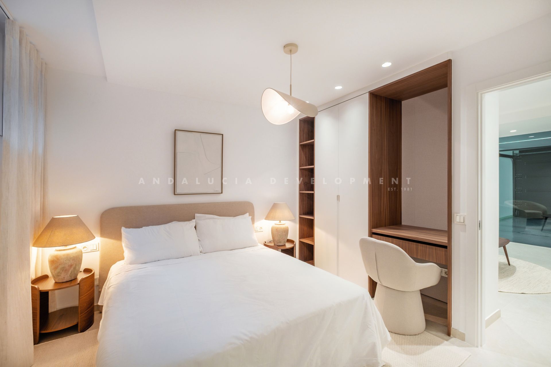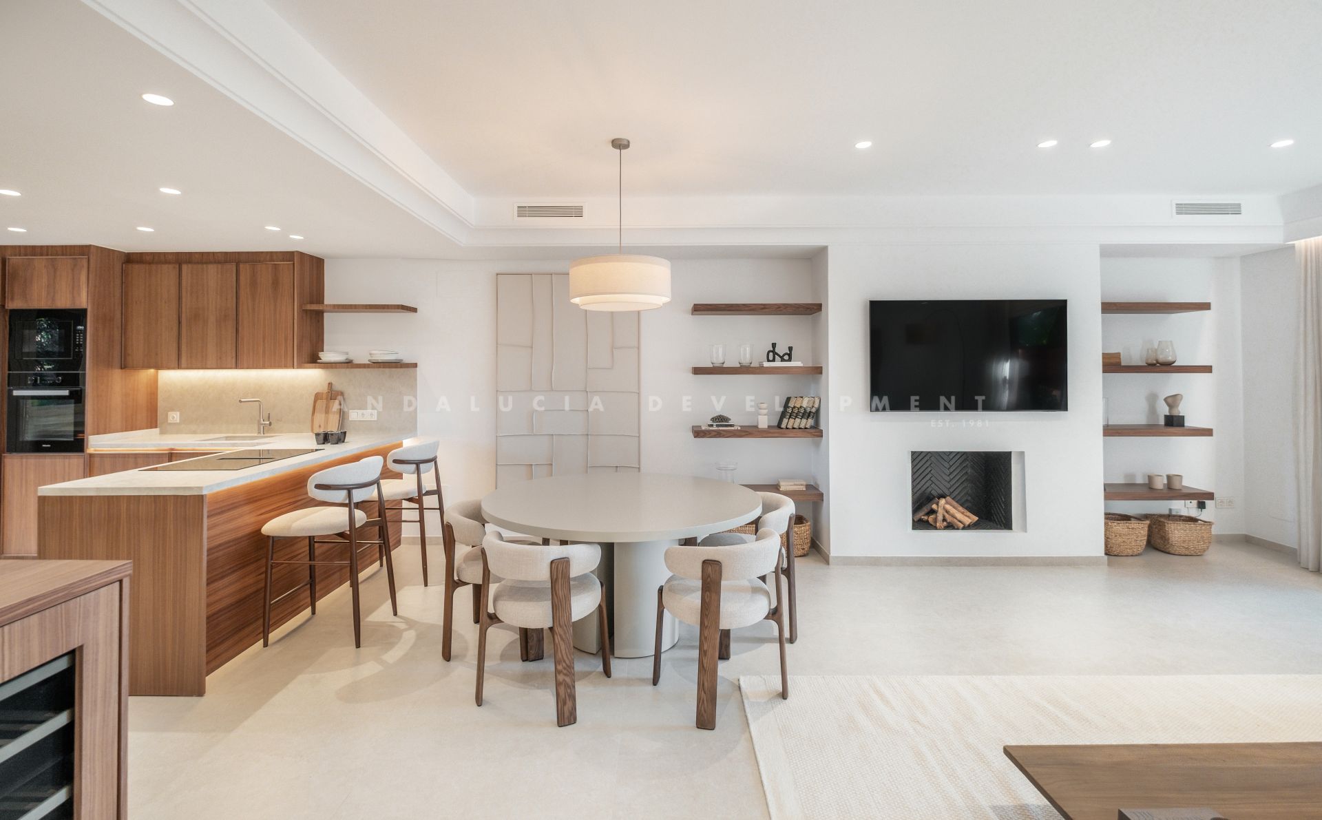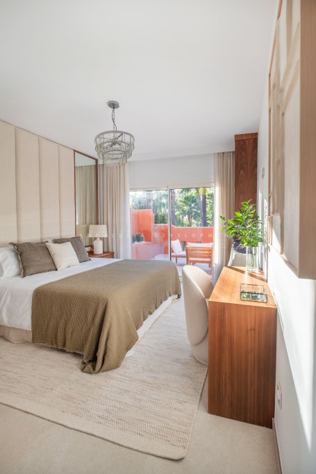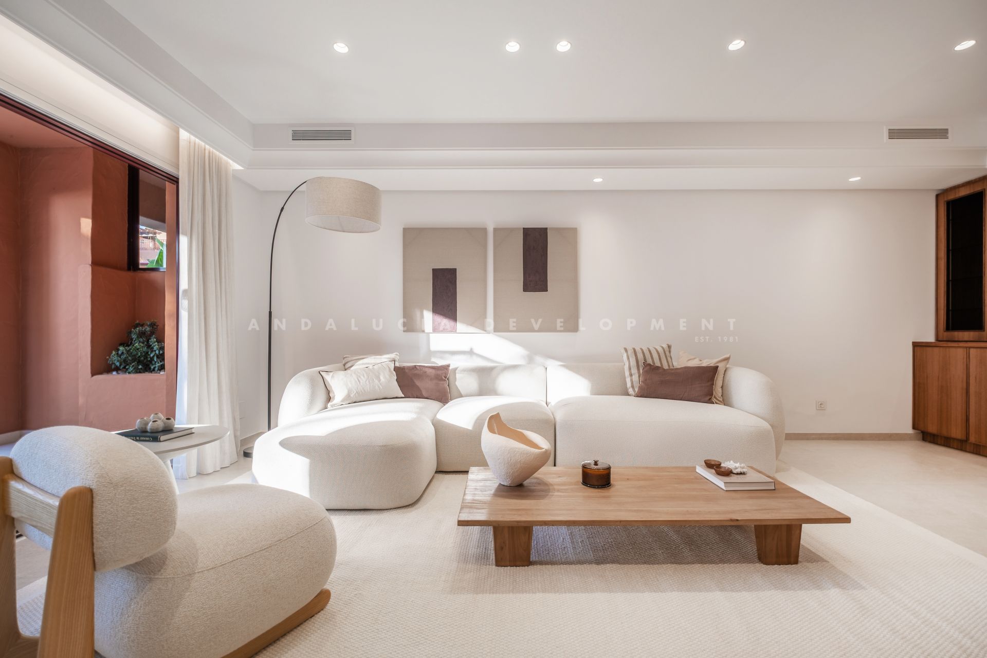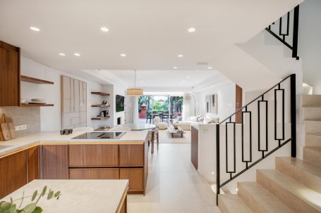 This newly renovated luxury home on Marbella’s Golden Mile is a beautifully reimagined 4-bedroom residence, fully renovated in 2025 with bespoke carpentry, a custom-designed kitchen with Miele appliances, and elegant contemporary finishes throughout. Located in one of the most exclusive gated communities on the Golden Mile, the property offers an exceptional standard of modern Mediterranean living. Every room is equipped with Airzone climate control and the bathrooms feature underfloor heating, ensuring year-round comfort. The entrance level sets the tone with a sophisticated open-plan layout where the designer kitchen seamlessly connects to the dining and living areas. Large sliding doors open onto the west-facing private garden, creating a natural flow between indoor and outdoor spaces—perfect for both relaxed daily living and entertaining. A guest toilet is also conveniently located on this floor. The first floor is dedicated to the bedroom suites, offering three bright and comfortable bedrooms and two modern bathrooms. The master suite includes a stylish en-suite with both a walk-in shower and a bathtub, as well as access to a generous private terrace overlooking the pool and lush communal gardens. The remaining bedrooms share a beautifully finished bathroom, making this level ideal for families or guests. Above, the rooftop solarium provides an exceptional retreat with a built-in BBQ area, outdoor dining space, and an inviting lounge area. An outdoor shower adds further convenience, and the space enjoys garden/pool and mountain views, making it the perfect setting for sunbathing, entertaining, or unwinding on warm evenings. The basement level brings valuable flexibility to the home. It features a fourth bedroom with an en-suite bathroom, a dedicated laundry room, and a spacious playroom or lounge that can easily be adapted into a private gym, cinema, or additional TV room. Direct access to the private garage adds comfort and security, and the installation is prepped for electric vehicle charging. Set within a secure, meticulously maintained urbanisation, this townhouse enjoys an unbeatable location. Forum is just a 8 -minute walk away and Puente Romano can be reached in around 10 minutes on foot, giving residents effortless access to world-class restaurants, beach clubs, tennis facilities, and the vibrant lifestyle of Marbella’s Golden Mile. Offering a perfect blend of luxury, convenience, and contemporary design, this townhouse stands out as an exceptional permanent residence or a premium investment in one of Marbella’s most sought-after enclaves.