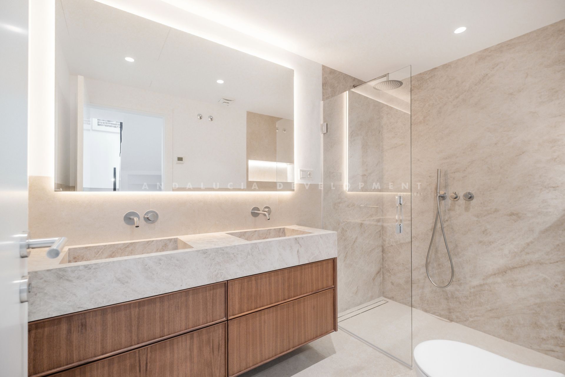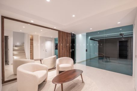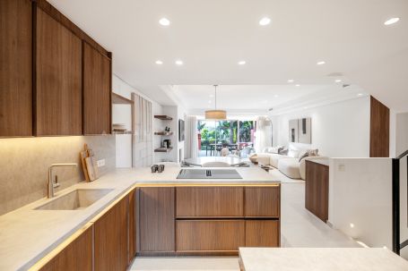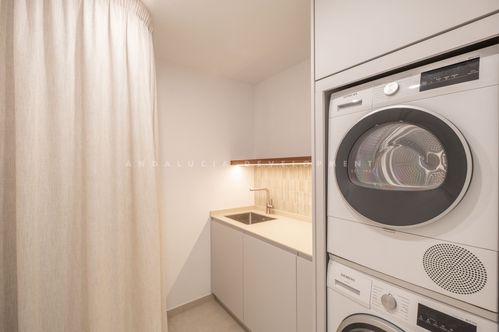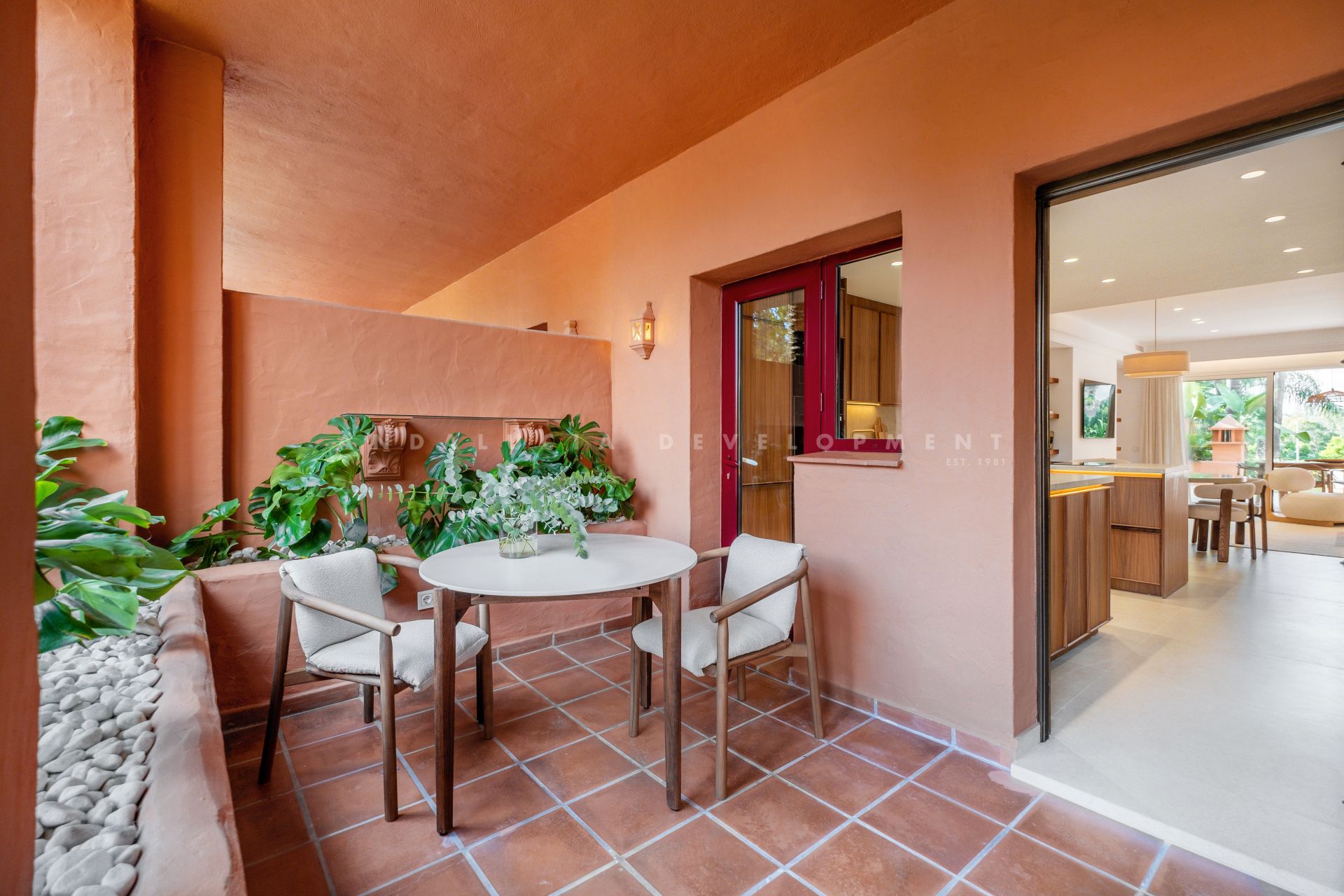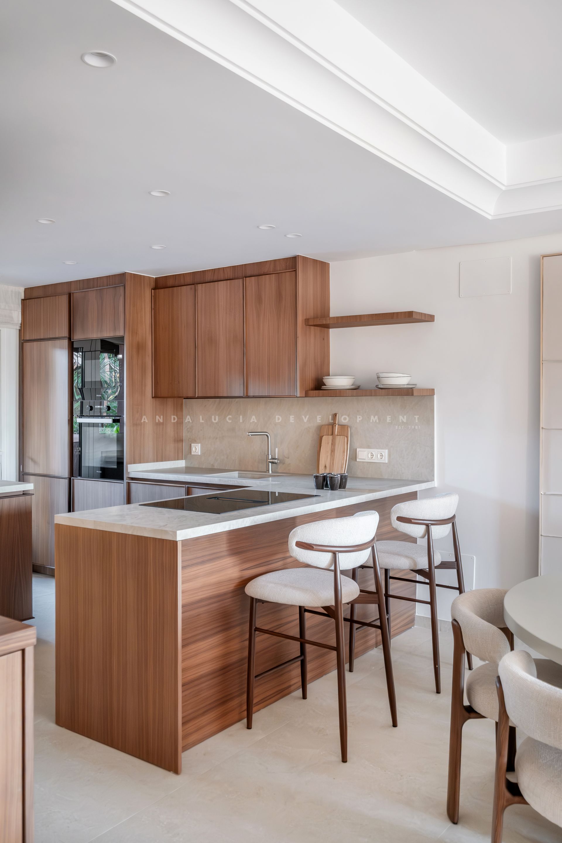This newly renovated luxury home on Marbella’s Golden Mile is a beautifully reimagined 4-bedroom residence, fully renovated in 2025 with bespoke carpentry, a custom-designed kitchen with Miele appliances, and elegant contemporary finishes throughout. Located in one of the most exclusive gated communities on the Golden Mile, the property offers an exceptional standard of modern Mediterranean living. Every room is equipped with Airzone climate control and the bathrooms feature underfloor heating, ensuring year-round comfort. The entrance level sets the tone with a sophisticated open-plan layout where the designer kitchen seamlessly connects to the dining and living areas. Large sliding doors open onto the west-facing private garden, creating a natural flow between indoor and outdoor spaces—perfect for both relaxed daily living and entertaining. A guest toilet is also conveniently located on this floor. The first floor is dedicated to the bedroom suites, offering three bright and comfortable bedrooms and two modern bathrooms. The master suite includes a stylish en-suite with both a walk-in shower and a bathtub, as well as access to a generous private terrace overlooking the pool and lush communal gardens. The remaining bedrooms share a beautifully finished bathroom, making this level ideal for families or guests. Above, the rooftop solarium provides an exceptional retreat with a built-in BBQ area, outdoor dining space, and an inviting lounge area. An outdoor shower adds further convenience, and the space enjoys garden/pool and mountain views, making it the perfect setting for sunbathing, entertaining, or unwinding on warm evenings. The basement level brings valuable flexibility to the home. It features a fourth bedroom with an en-suite bathroom, a dedicated laundry room, and a spacious playroom or lounge that can easily be adapted into a private gym, cinema, or additional TV room. Direct access to the private garage adds comfort and security, and the installation is prepped for electric vehicle charging. Set within a secure, meticulously maintained urbanisation, this townhouse enjoys an unbeatable location. Forum is just a 8 -minute walk away and Puente Romano can be reached in around 10 minutes on foot, giving residents effortless access to world-class restaurants, beach clubs, tennis facilities, and the vibrant lifestyle of Marbella’s Golden Mile. Offering a perfect blend of luxury, convenience, and contemporary design, this townhouse stands out as an exceptional permanent residence or a premium investment in one of Marbella’s most sought-after enclaves.