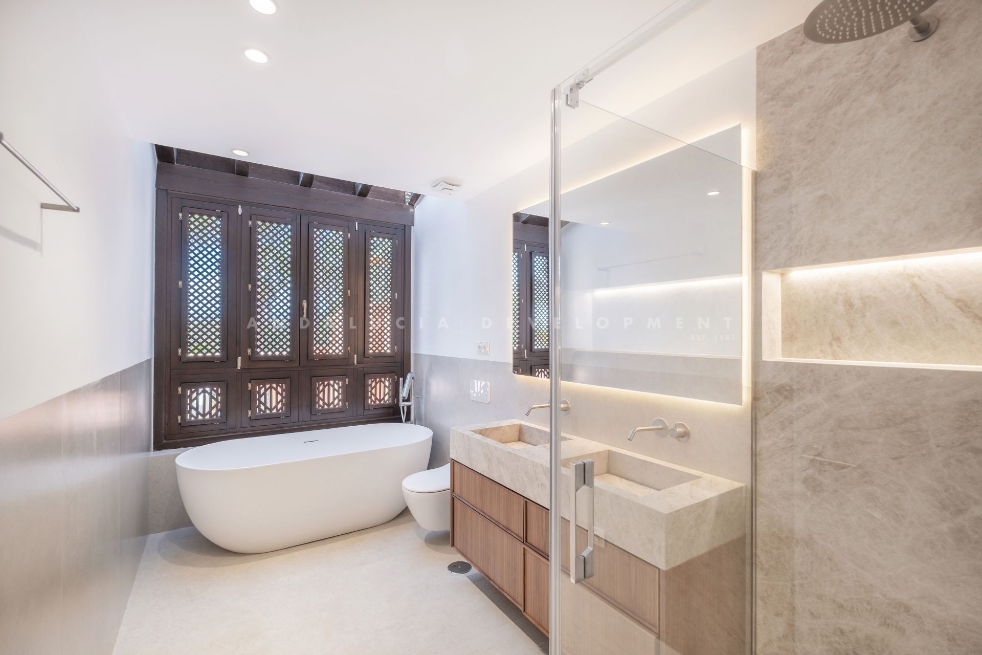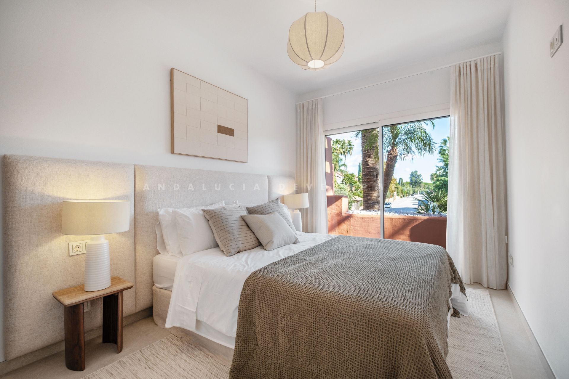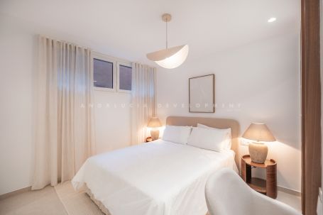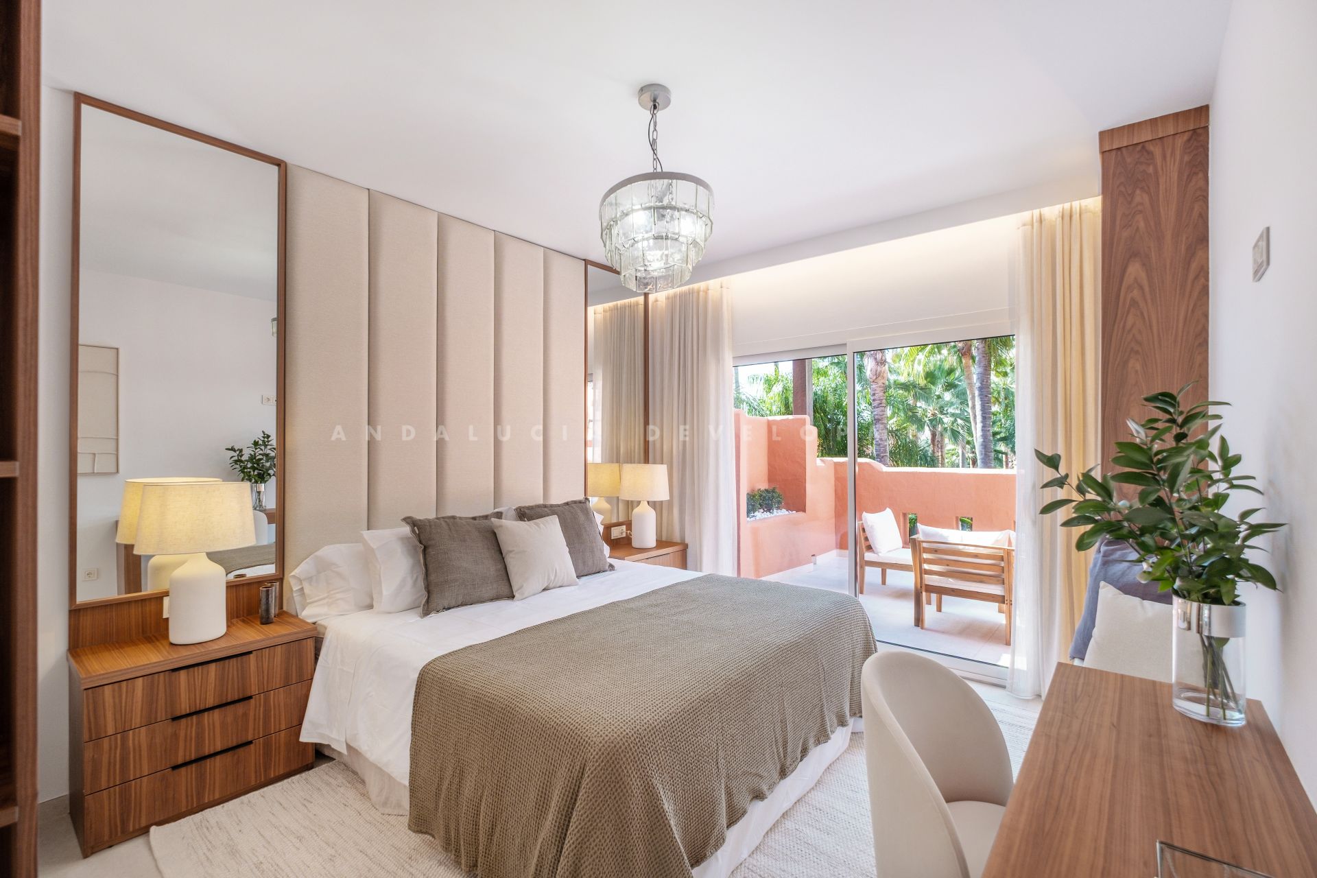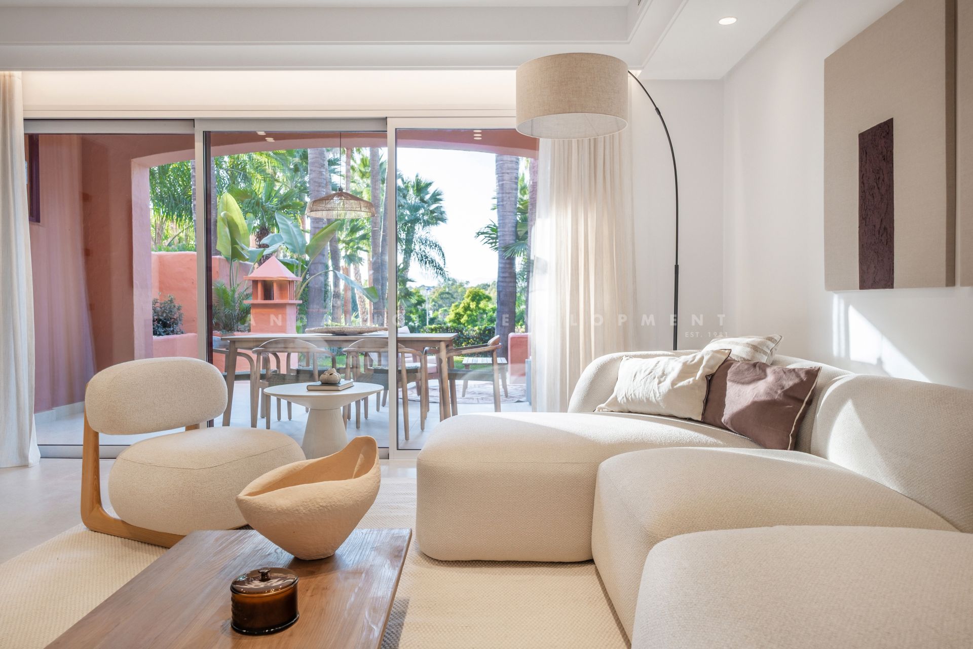 This newly renovated luxury home on Marbella’s Golden Mile is a beautifully reimagined 4-bedroom residence, fully renovated in 2025 with bespoke carpentry, a custom-designed kitchen with Miele appliances, and elegant contemporary finishes throughout. Located in one of the most exclusive gated communities on the Golden Mile, the property offers an exceptional standard of modern Mediterranean living. Every room is equipped with Airzone climate control and the bathrooms feature underfloor heating, ensuring year-round comfort. The entrance level sets the tone with a sophisticated open-plan layout where the designer kitchen seamlessly connects to the dining and living areas. Large sliding doors open onto the west-facing private garden, creating a natural flow between indoor and outdoor spaces—perfect for both relaxed daily living and entertaining. A guest toilet is also conveniently located on this floor. The first floor is dedicated to the bedroom suites, offering three bright and comfortable bedrooms and two modern bathrooms. The master suite includes a stylish en-suite with both a walk-in shower and a bathtub, as well as access to a generous private terrace overlooking the pool and lush communal gardens. The remaining bedrooms share a beautifully finished bathroom, making this level ideal for families or guests. Above, the rooftop solarium provides an exceptional retreat with a built-in BBQ area, outdoor dining space, and an inviting lounge area. An outdoor shower adds further convenience, and the space enjoys garden/pool and mountain views, making it the perfect setting for sunbathing, entertaining, or unwinding on warm evenings. The basement level brings valuable flexibility to the home. It features a fourth bedroom with an en-suite bathroom, a dedicated laundry room, and a spacious playroom or lounge that can easily be adapted into a private gym, cinema, or additional TV room. Direct access to the private garage adds comfort and security, and the installation is prepped for electric vehicle charging. Set within a secure, meticulously maintained urbanisation, this townhouse enjoys an unbeatable location. Forum is just a 8 -minute walk away and Puente Romano can be reached in around 10 minutes on foot, giving residents effortless access to world-class restaurants, beach clubs, tennis facilities, and the vibrant lifestyle of Marbella’s Golden Mile. Offering a perfect blend of luxury, convenience, and contemporary design, this townhouse stands out as an exceptional permanent residence or a premium investment in one of Marbella’s most sought-after enclaves.