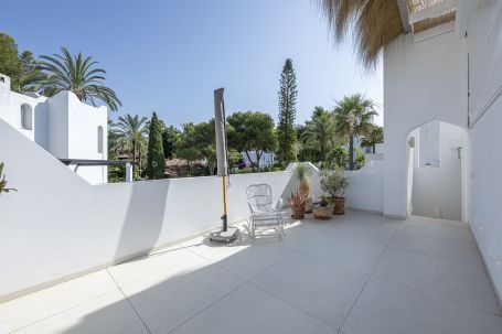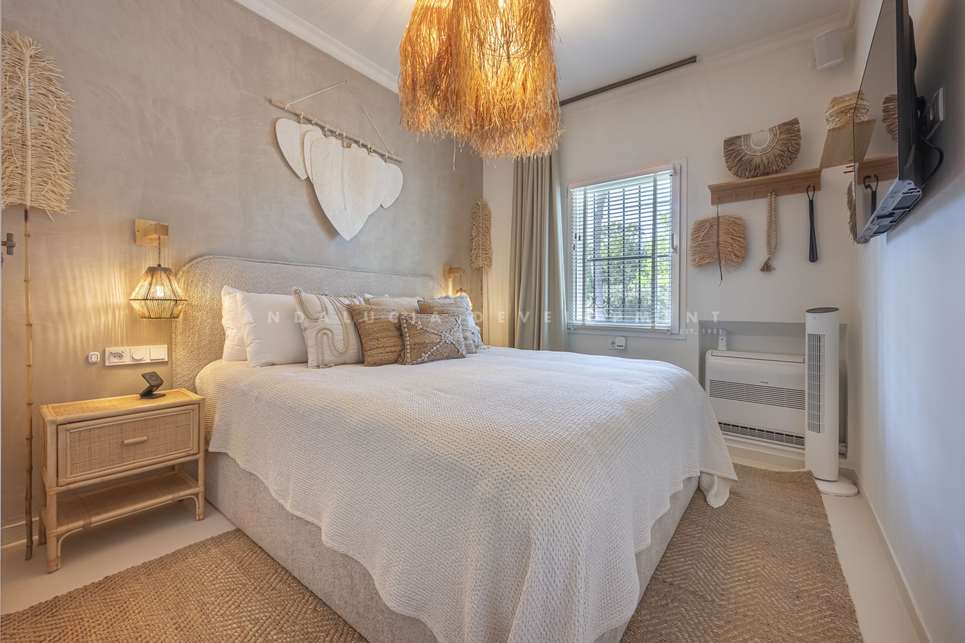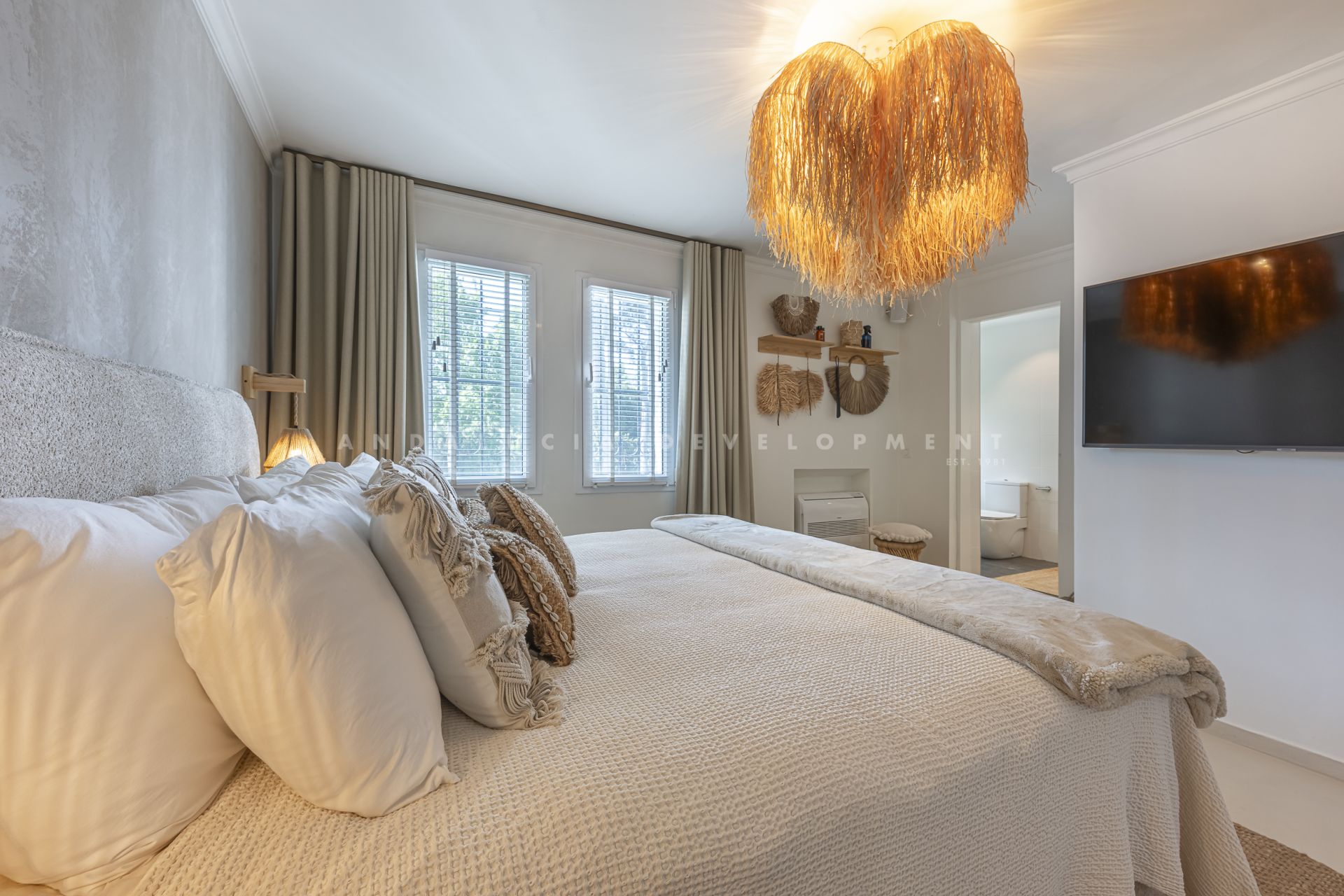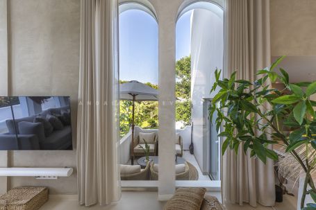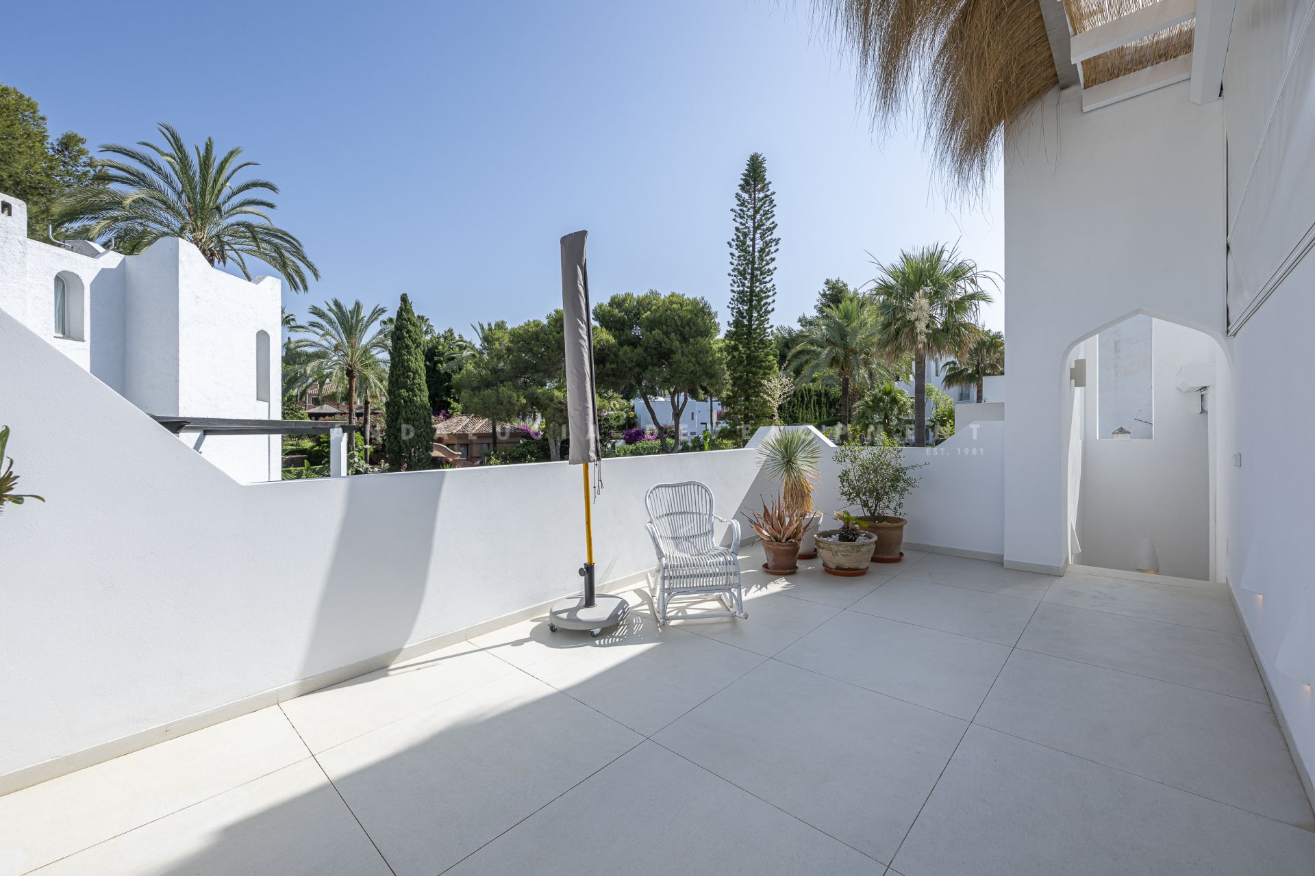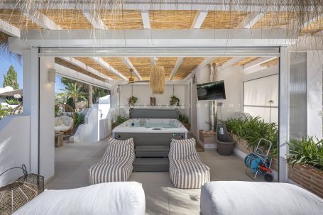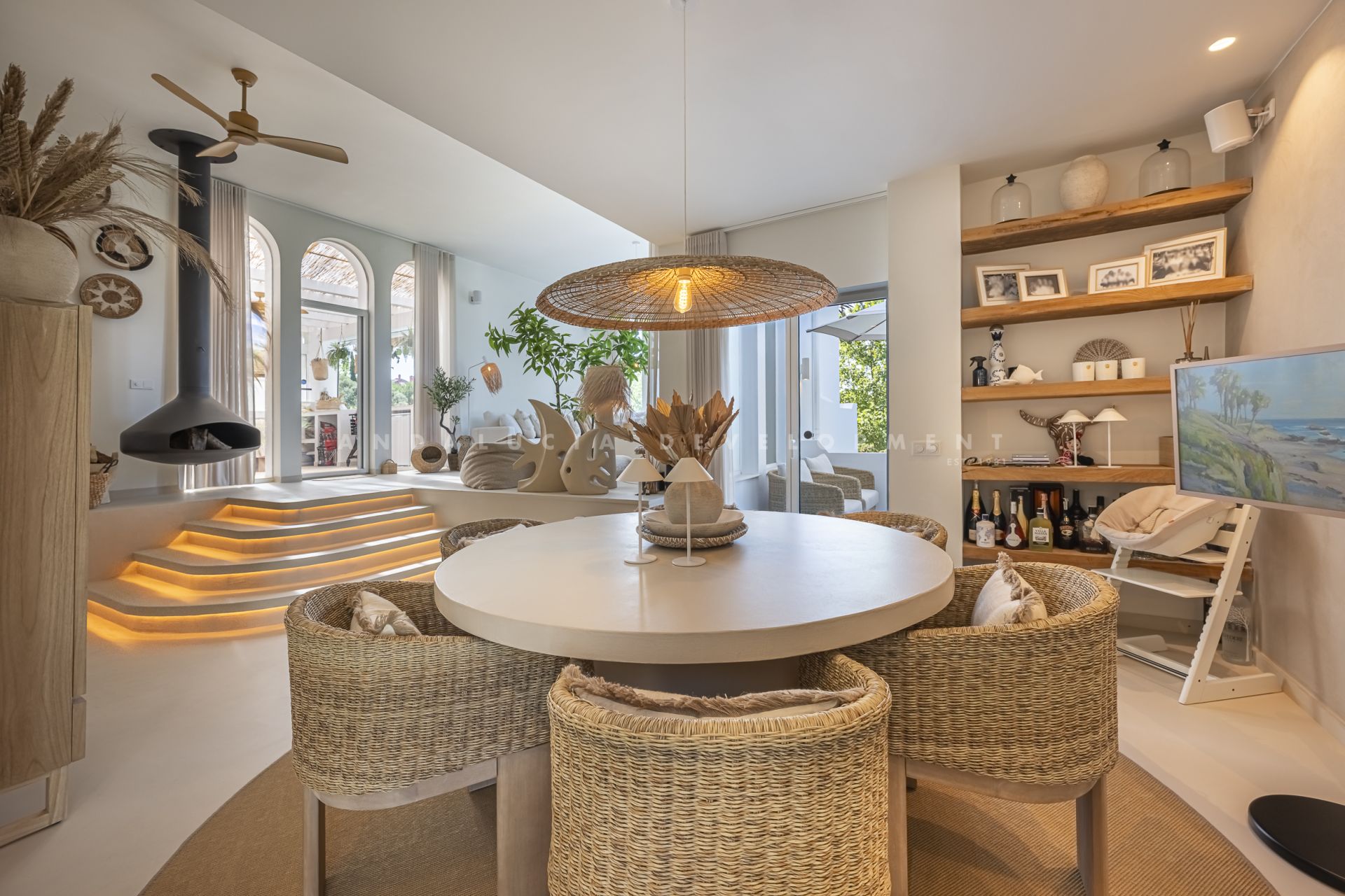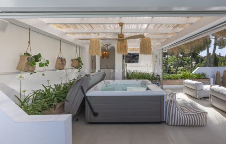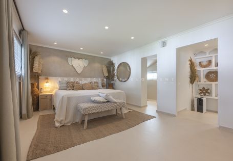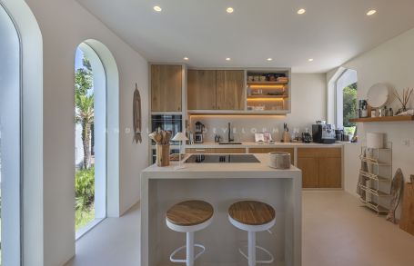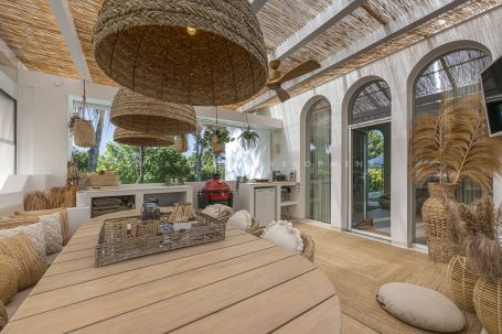 Los Naranjos golf clubs. This exceptional villa renovated by the current owners to the highest standards in 2023, showcases a refined modern Mediterranean design infused with Boho Chic Ibiza influences. The interiors exude understated elegance, blending warm wood accents, sleek ceramic surfaces, and luxurious details to create a contemporary yet inviting atmosphere. The expansive open-plan living area and contemporary kitchen flow effortlessly into the outdoor spaces, creating a harmonious connection between indoor comfort and al fresco living. The home includes a guest cloakroom, a beautifully appointed master bedroom with en-suite