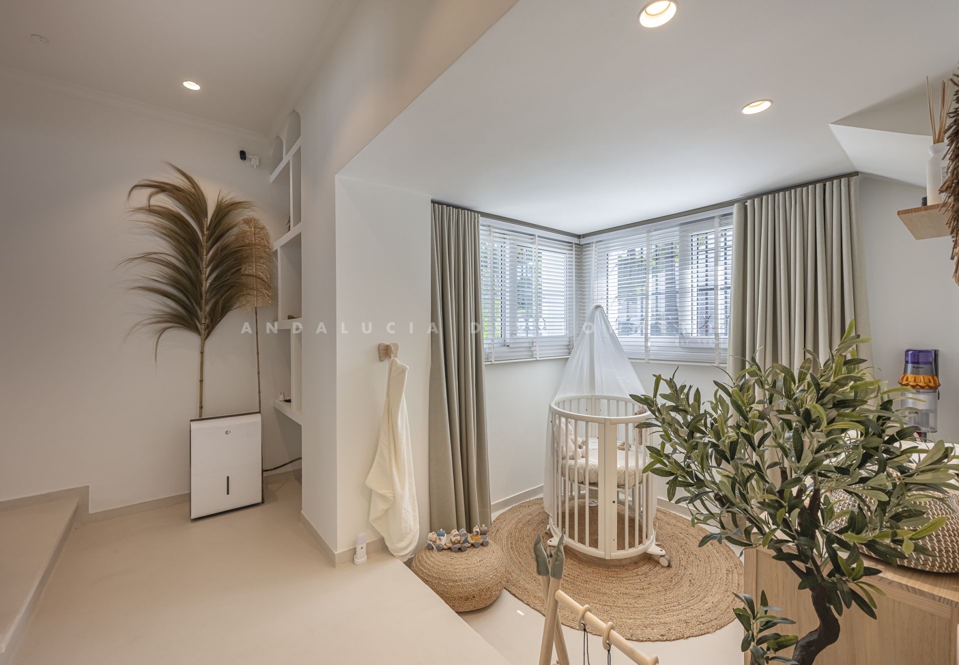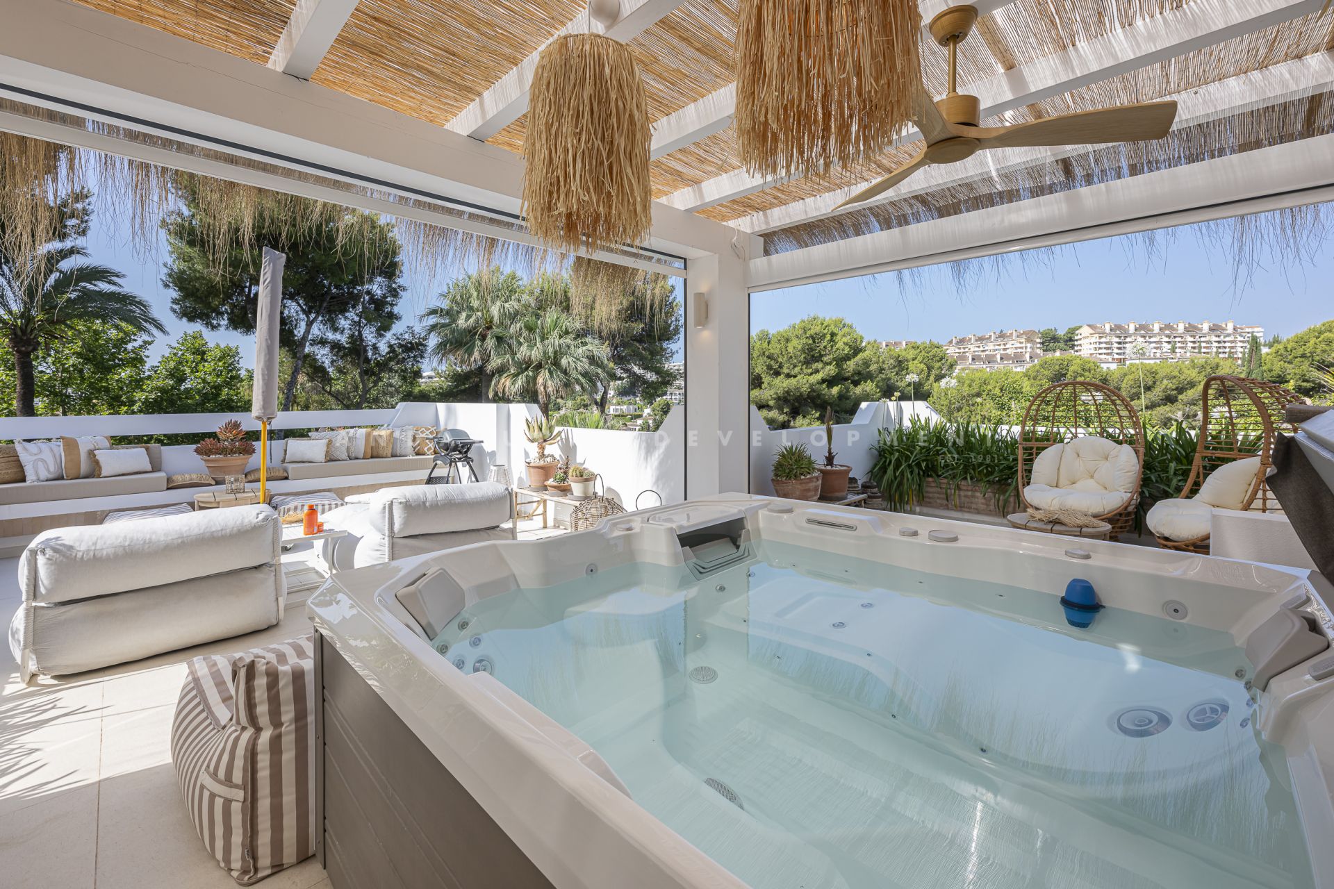 bathroom and generous wardrobe space, along with three additional bedrooms, one featuring its own en-suite and a further guest bathroom. The property features mosquito nets on all windows, a climate control system with both heating and air conditioning, and a comprehensive alarm system for both interior and exterior security. Designed with both relaxation and entertaining in mind, the property offers stylish outdoor dining and barbecue areas, as well as tranquil chill-out zones. Towering palm trees and lush landscaping envelop the beautifully maintained communal garden, which boasts two swimming pools. This home is not just a residence, it’s a lifestyle sanctuary, combining architectural finesse with effortless Mediterranean charm.