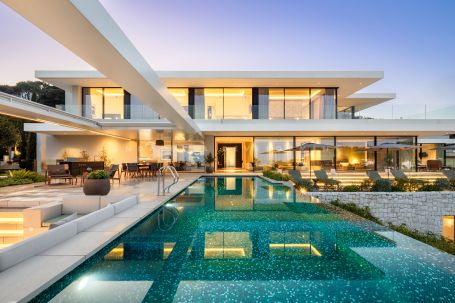 A contemporary home for sale in the exclusive gated community of El Madroñal, a peaceful and sought-after area in the hills of Marbella. This villa offers a perfect balance of modern design, comfort, and breathtaking views of the Mediterranean. Designed by AMES Architect, every detail reflects quality, functionality, and a deep connection with its surroundings. With eight spacious en-suite bedrooms and two additional guest bathrooms, the villa is designed for comfort and convenience. The open-plan layout connects the living and dining areas with a state-of-the-art Gaggenau kitchen, fully equipped with the latest appliances. High ceilings and expansive windows let in natural light, creating bright and welcoming spaces while framing the sea views. A contemporary fireplace adds warmth and style, making the living area a perfect place to relax.