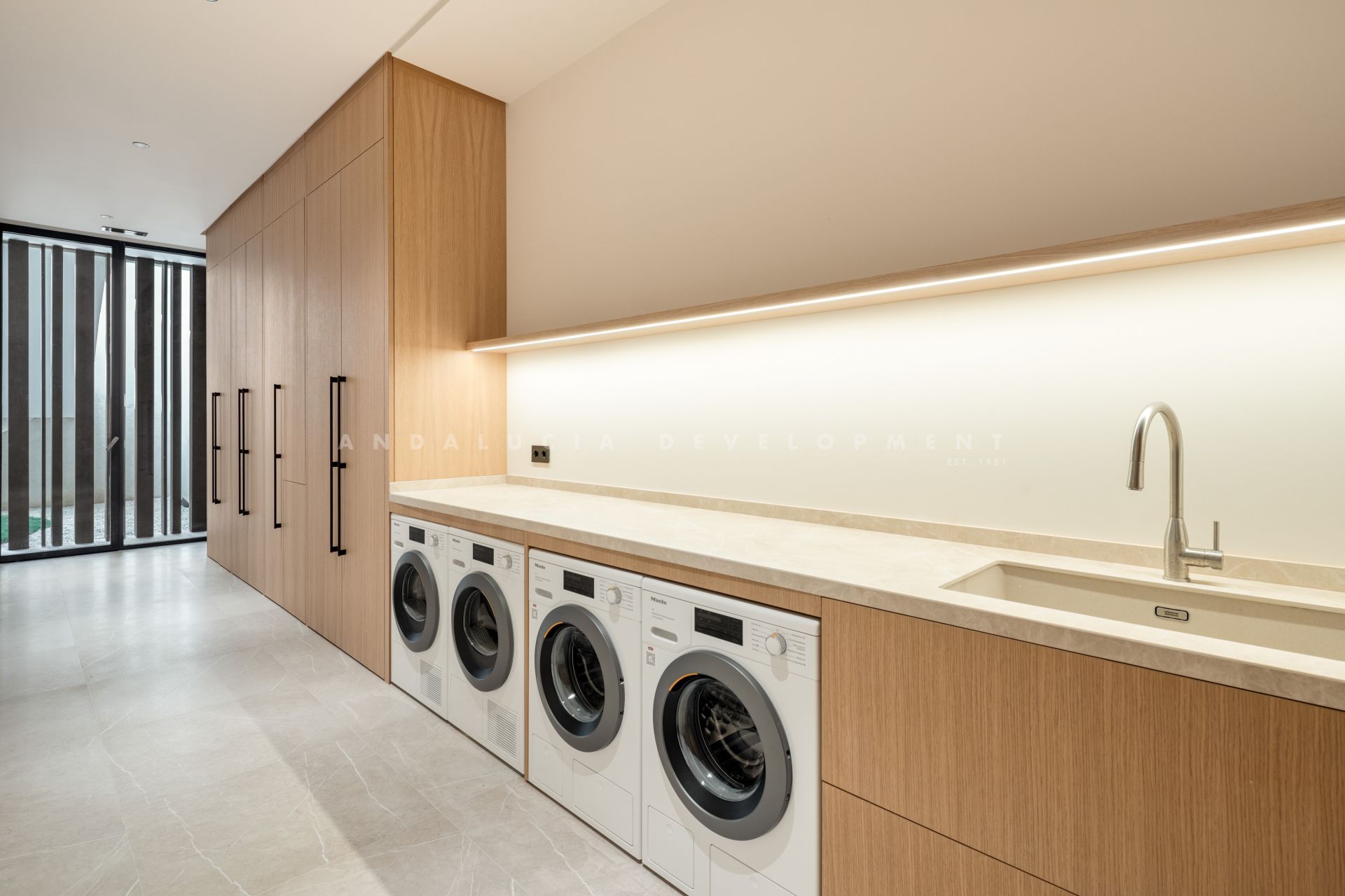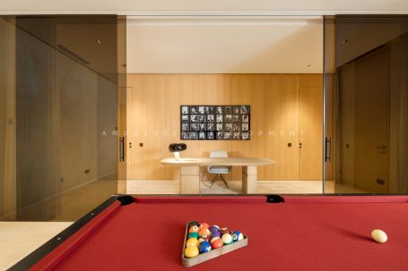 The home showcases fine craftsmanship, with herringbone wood flooring, a glass-panelled entrance that maximizes light, door handles wrapped in leather, and light switches inspired by Aston Martin. The windows and doors are floor-to-ceiling and electronically operated, enhancing the fluidity between the indoor and outdoor environments. Even utility aspects have been given careful consideration—the machinery room is located outside the main structure, ensuring privacy and simplifying maintenance.