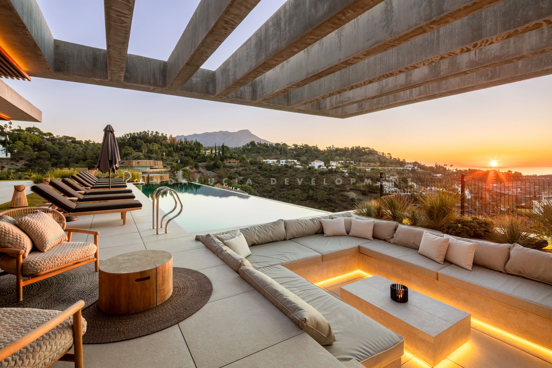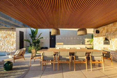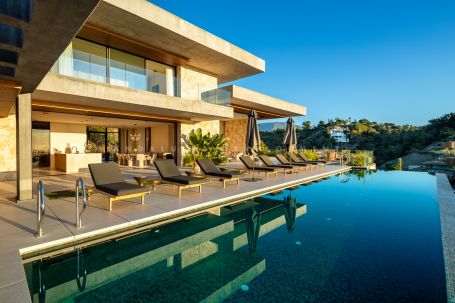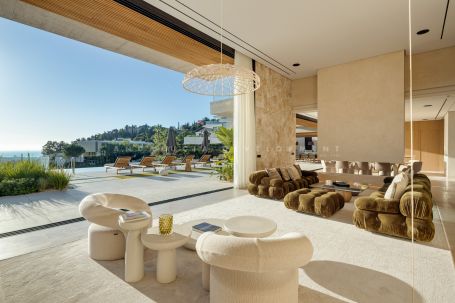 A newly constructed architectural masterpiece for sale in El Madroñal, Benahavís. With striking design, elevated positioning, and panoramic sea and mountain views, the property offers an exclusive lifestyle in one of southern Spain’s most secure and prestigious gated communities. Spanning 1,520 square metres across three levels with 492 square metres of terraces, the villa seamlessly blends contemporary sophistication with Mediterranean charm. A long private driveway leads to the grand entrance, where a stunning olive tree framed by a glass-panelled main door creates an immediate sense of arrival. Natural light floods the interior, revealing open-plan living and dining areas with a central fireplace and floor-to-ceiling sliding doors that create a smooth indoor-outdoor transition. The state-of-the-art kitchen is equipped with Gaggenau appliances and a hidden chef’s kitchen, allowing for seamless entertaining and practicality.