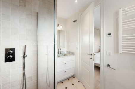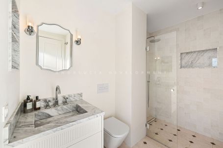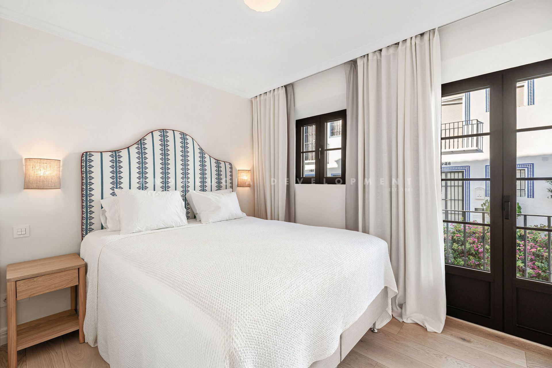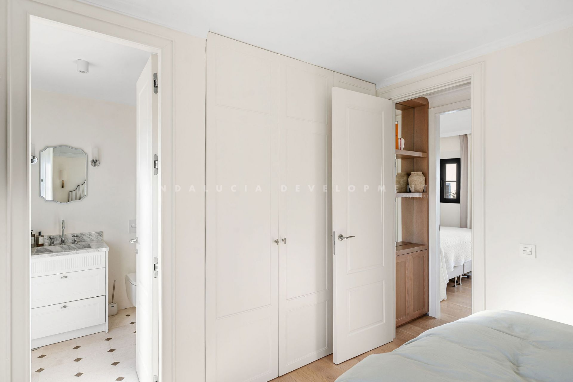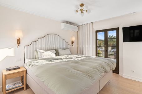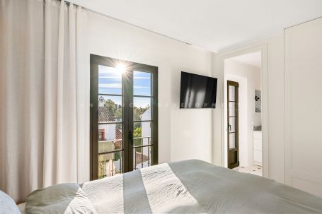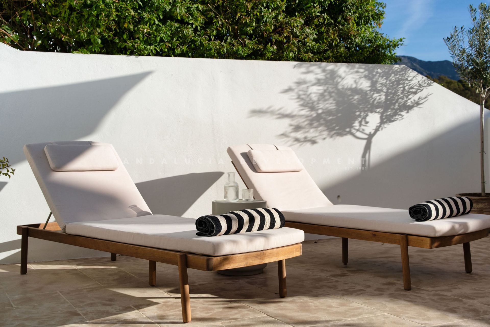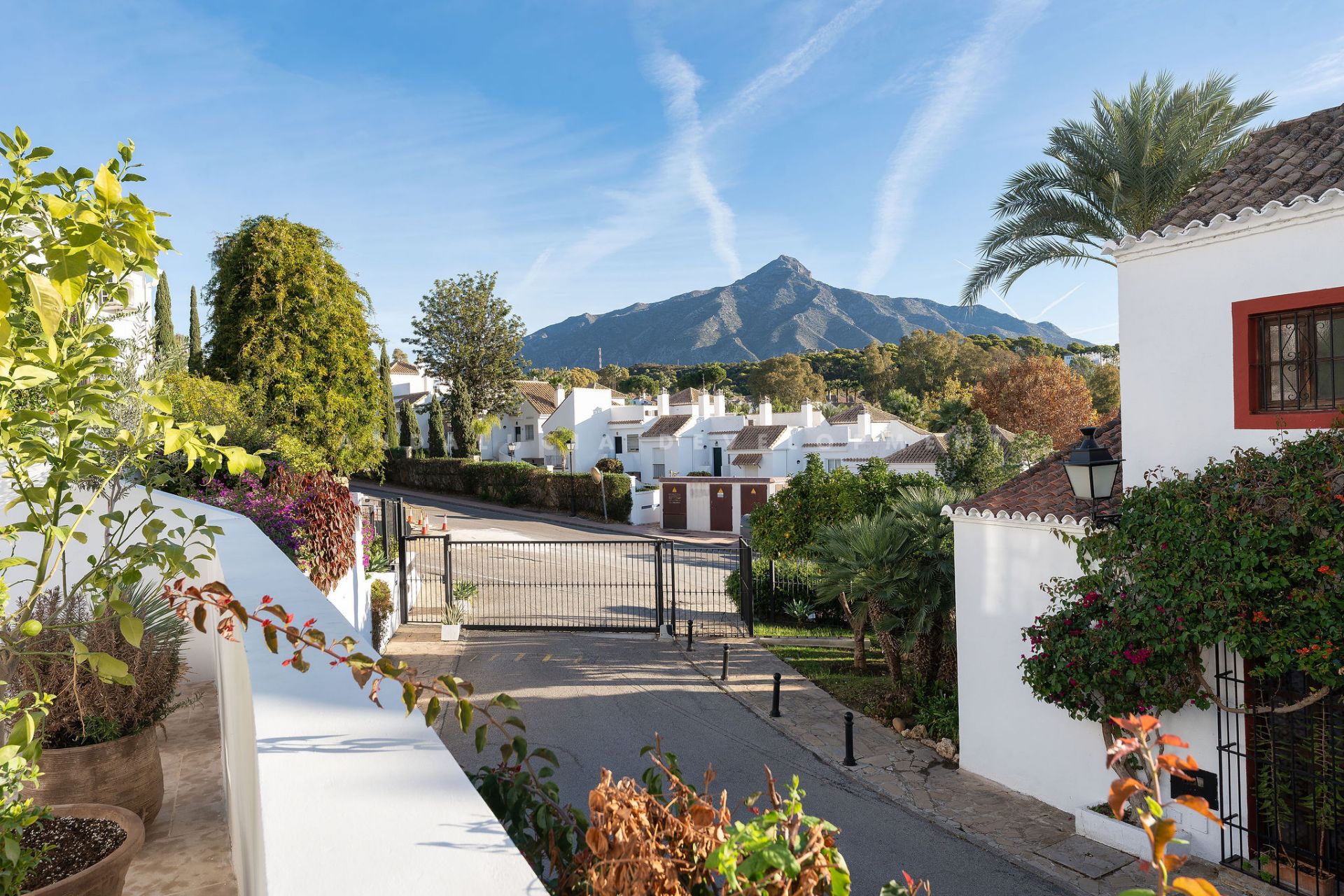 Beautifully renovated townhouse located in the charming and secure gated Andalucian-style community of El Naranjal, ideally positioned in the heart of Nueva Andalucia between the prestigious Aloha and Los Naranjos golf courses. The area offers a peaceful ambience surrounded by lush greenery, only minutes from Puerto Banús and Marbella’s golden beaches. The property perfectly blends modern design and classic Andalusian character. Renovated throughout with top-quality materials, such as stone flooring with underfloor heating on the ground floor and Italian Carrara marble in the bathrooms upstairs – both with underfloor heating. The property offers two elegant en-suite bedrooms. On the main floor, a spacious guest toilet with a laundry area, and a bright open-plan living area with custom oak furniture and bookshelves. The kitchen is equipped with Siemens slim-line appliances and a built-in side table with wine storage, while the dining area comfortably seats four. The sunny terrace featuring an outdoor kitchen, BBQ, sink, and a travertine dining table for eight, enjoys stunning open views towards La Concha mountain. Lemon and orange trees are planted in rustic clay pots to add the perfect Mediterranean feeling. All the windows, plumbing, and electricity are new, and the hot and cold AC throughout.