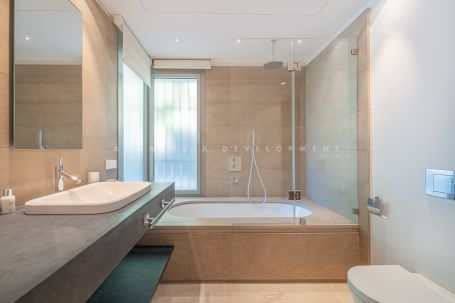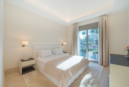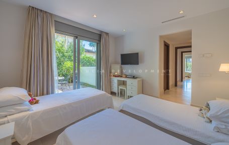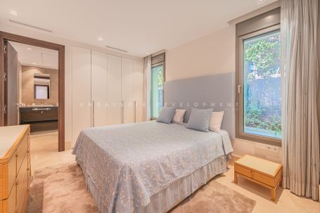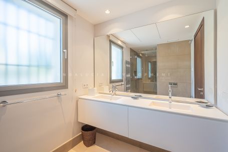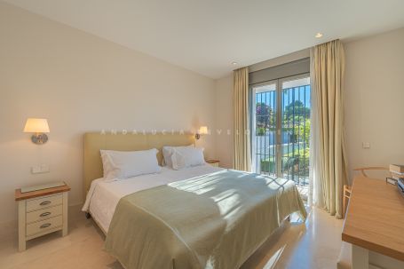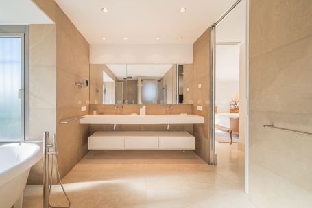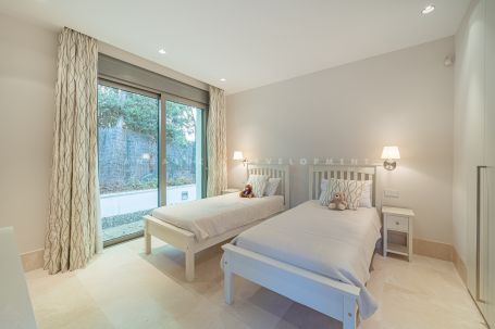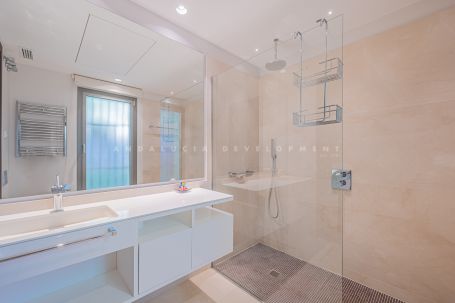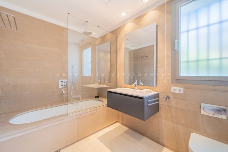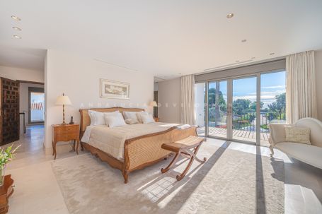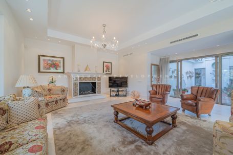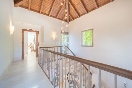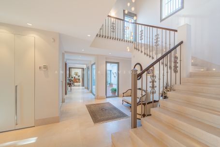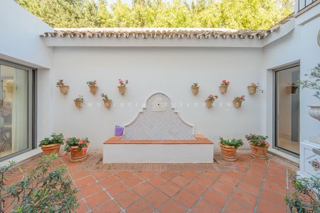 Villa with a focus on contemporary design that embraces privacy and comfort. Showcasing designer finishes, this stylish home is suited for everyday relaxation and luxury and entertaining large gatherings of friends and family. Enjoy an exceptional living experience in Paraiso Barronal within walking distance from all amenities. Only a few minutes’ drive to Guadalmina, Puerto Banus, Marbella and Estepona. Near numerous golf courses and several small commercial centres dotted along the A-7. The home is distributed over three levels with relaxed open spaces. Step through the antique entrance hall with vaulted ceilings and a beautiful marble staircase with wrought iron railings. There is a huge living room on this floor with a fireplace connecting to a beautiful Andalusian-style interior patio with a fountain, four bedroom suites and a guest toilet. The designer chef’s kitchen features custom cabinets with a breakfast nook and direct access to the separate dining room, the porch, and the swimming pool in the gardens. Upstairs is a sizeable south-facing main suite with sea views, a spacious dressing room, and a viewing terrace. In addition, there is a separate small bedroom with an en-suite bathroom which could also be used as a study area. Finally, the lower level offers a garage with a capacity for 3 cars, storage rooms and a laundry room. Noteworthy features include air conditioning, underfloor heating on the ground and upper floors, marble floors, double glazing and a spacious pool area with an outdoor bathroom. El Paraiso Barronal is located midway between Marbella and the lovely seaside resort of Estepona. A short stroll from all the necessities for easy everyday living, including the beach and a range of restaurants. A short drive to several golf courses and the Golf Valley in Nueva Andalucia. Quick access to the N-340 coastal road, the AP-7 motorway with an exit in San Pedro.