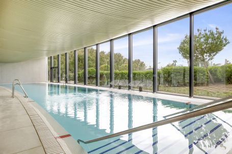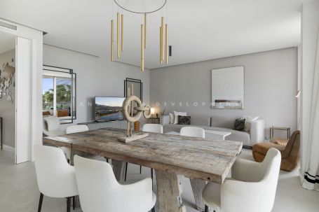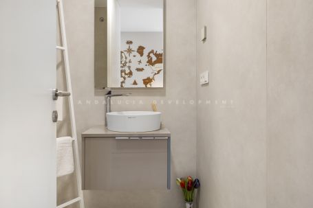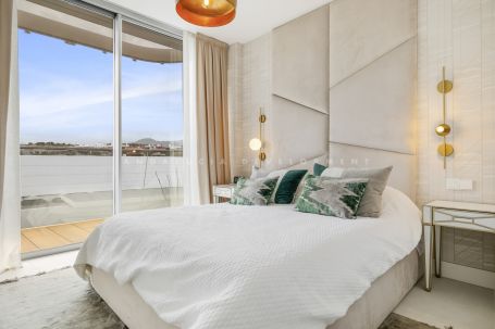 Welcome to one of the finest luxury residences on the New Golden Mile, a stunning 3-bedroom apartment located in the exclusive beachfront urbanisation The Edge, just west of Estepona. This second-floor home combines elegant contemporary design with an unbeatable location, offering panoramic views of the Mediterranean and first-class amenities. Just steps from the beach and within walking distance to local shops and restaurants, the apartment is also only a 5–10 minute drive to the vibrant Estepona port and charming town centre. The spacious living and dining area is bathed in natural light and seamlessly connected to a sleek, fully fitted open-plan kitchen. The master suite features a private dressing area and en-suite bathroom, while two guest bedrooms share a stylish bathroom. There is also a guest toilet for added convenience. Step out onto the covered front terrace and enjoy tranquil views of the beautifully landscaped gardens, infinity-edge communal pool, and the sparkling sea beyond. A second, southwest-facing rear terrace invites you to relax in the warm glow of the evening sun.