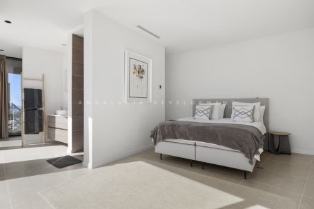Upstairs, the master suite includes a dressing area and a versatile adjoining room, ideal for use as an office, gym, or additional bedroom. Two further guest bedrooms with en-suite bathrooms are also located on this level. All rooms on the upper floor open to terraces with uninterrupted views. A garage with space for one car is also included.