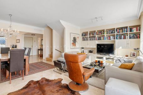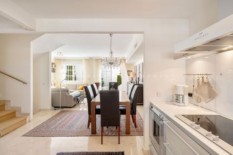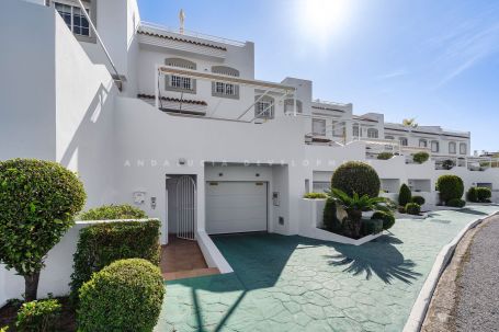 Introducing this spacious townhouse for sale in the heart of the Golf Valley in Nueva Andalucia, one of the most demanded areas. This location is particularly popular for those who spend their days on the golf course, as the Aloha Golf Club among others is just a short distance away. A perfect holiday home or permanent residence depending on what you are looking for. The property is distributed over 3 floors, the large garage, a 4th room and laundry area are situtated on the lower floor, kitchen, living room, 2 terraces are on the main floor with 3 bedrooms 2 bathrooms on the 2nd floor, a large solarium with amazing views and sun all day to to facing both east and west. The house is very well kept and ready to move into.