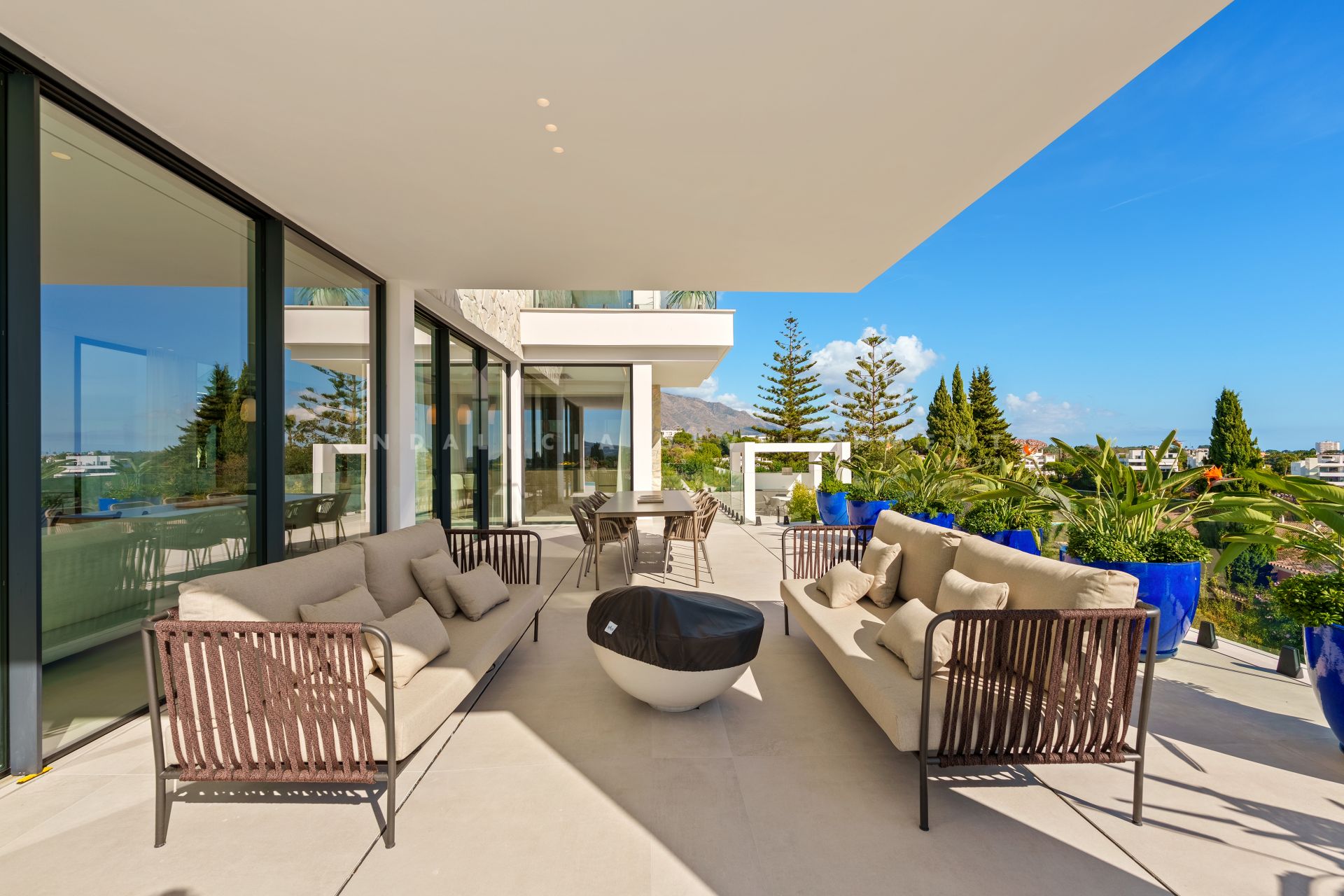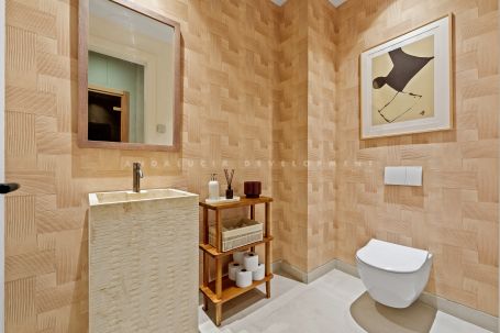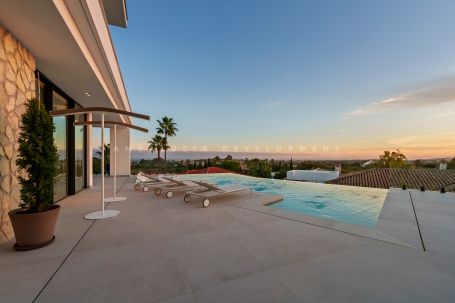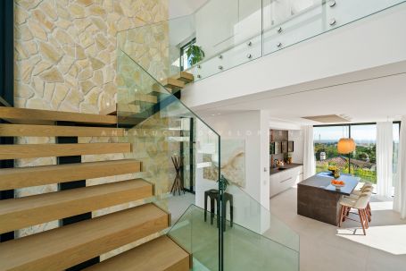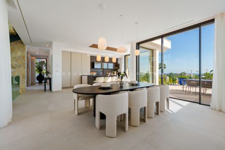 This villa is a magnificent contemporary residence within the private Tresora Villas enclave in La Quinta, Benahavis. Created by Cogitari Homes, it reflects the perfect harmony between sophisticated architectural design and the serene natural beauty that surrounds it. Set between the Mediterranean Sea and La Concha mountain, this exclusive villa enjoys panoramic views across the golf valley and coastline while offering total privacy and tranquillity. The villa unfolds over three spacious levels and includes five bedrooms and five bathrooms. The main floor features open and fluid living spaces, a designer kitchen, and elegant dining areas that open onto generous terraces and a stunning infinity pool of 51 m². Every space is designed to maximize natural light and frame the exceptional scenery, creating a seamless indoor–outdoor living experience. The upper level hosts the master suite with its private terrace, walk-in dressing area, and luxurious bathroom, alongside additional guest suites designed with comfort and style in mind. The entertainment level offers a refined leisure space with a cinema lounge, gym area, laundry room, and garage for multiple vehicles, complemented by storage and utility rooms—all conceived to combine functionality with understated elegance. Located within minutes of La Quinta Golf & Country Club, Los Naranjos, and Los Arqueros Golf, and just a short drive from Puerto Banús and Puente Romano, this villa offers the ultimate Marbella lifestyle. Surrounded by lush green landscapes and world-class amenities, this residence represents a rare blend of contemporary architecture, natural beauty, and exclusive living.