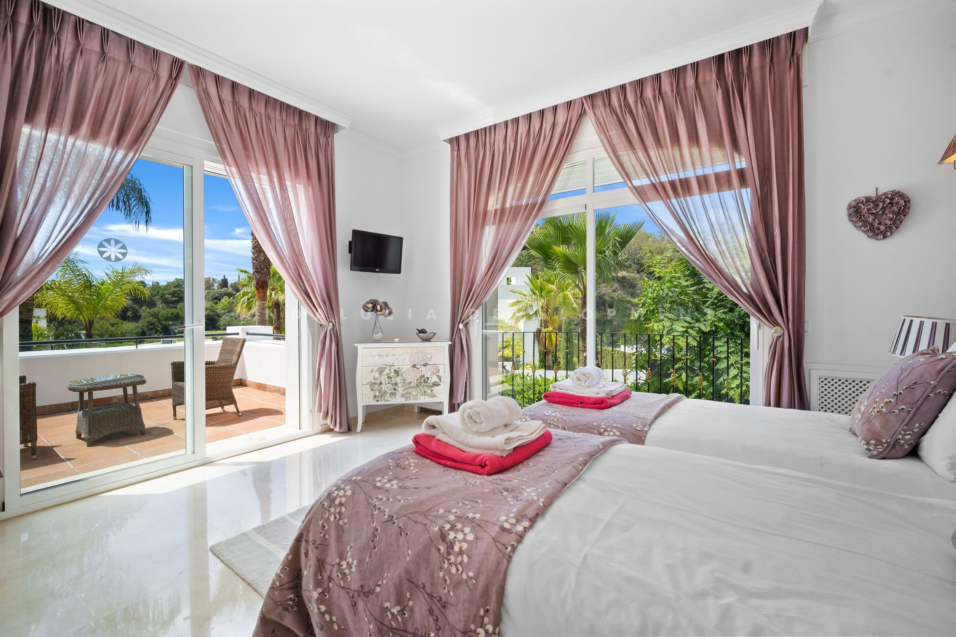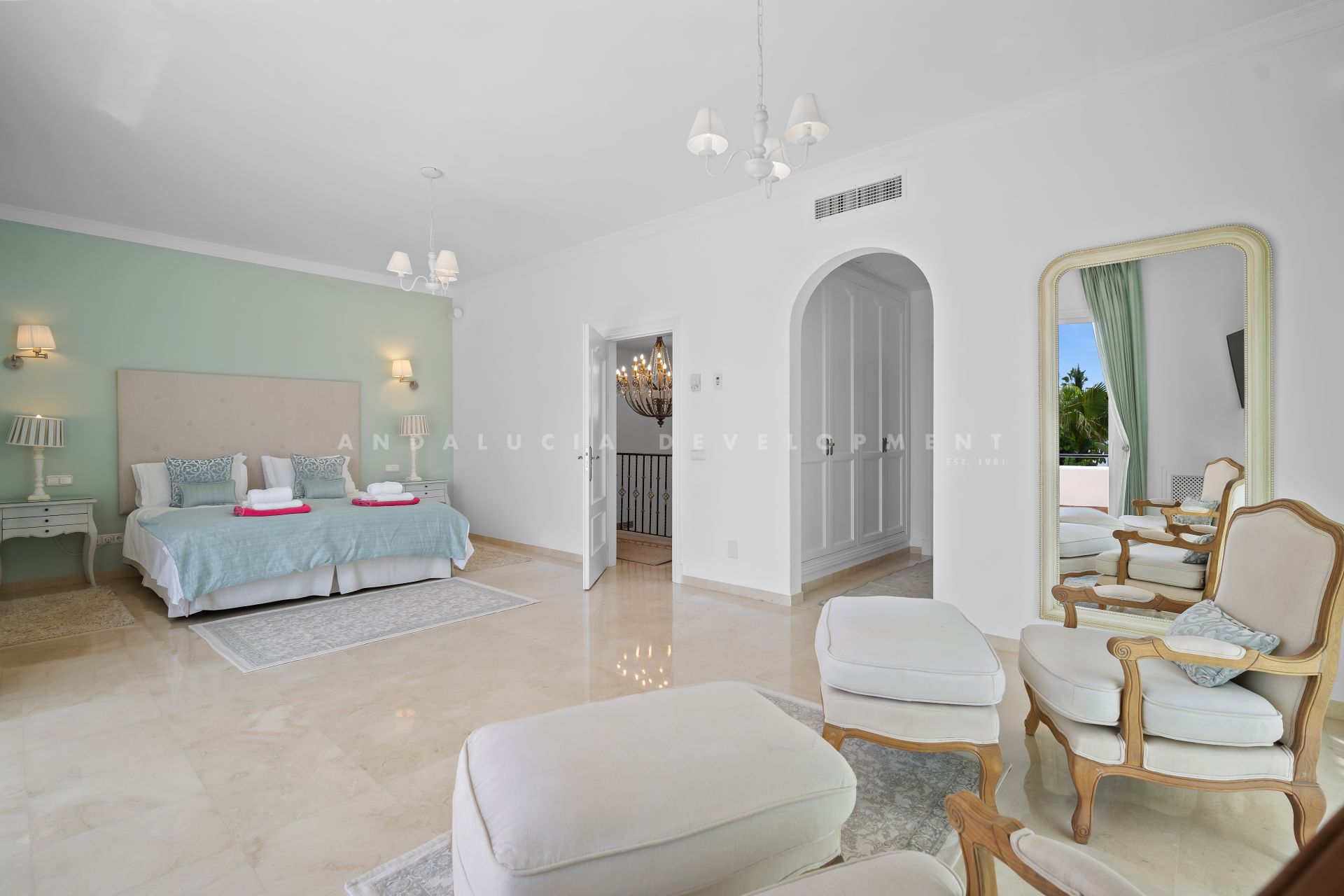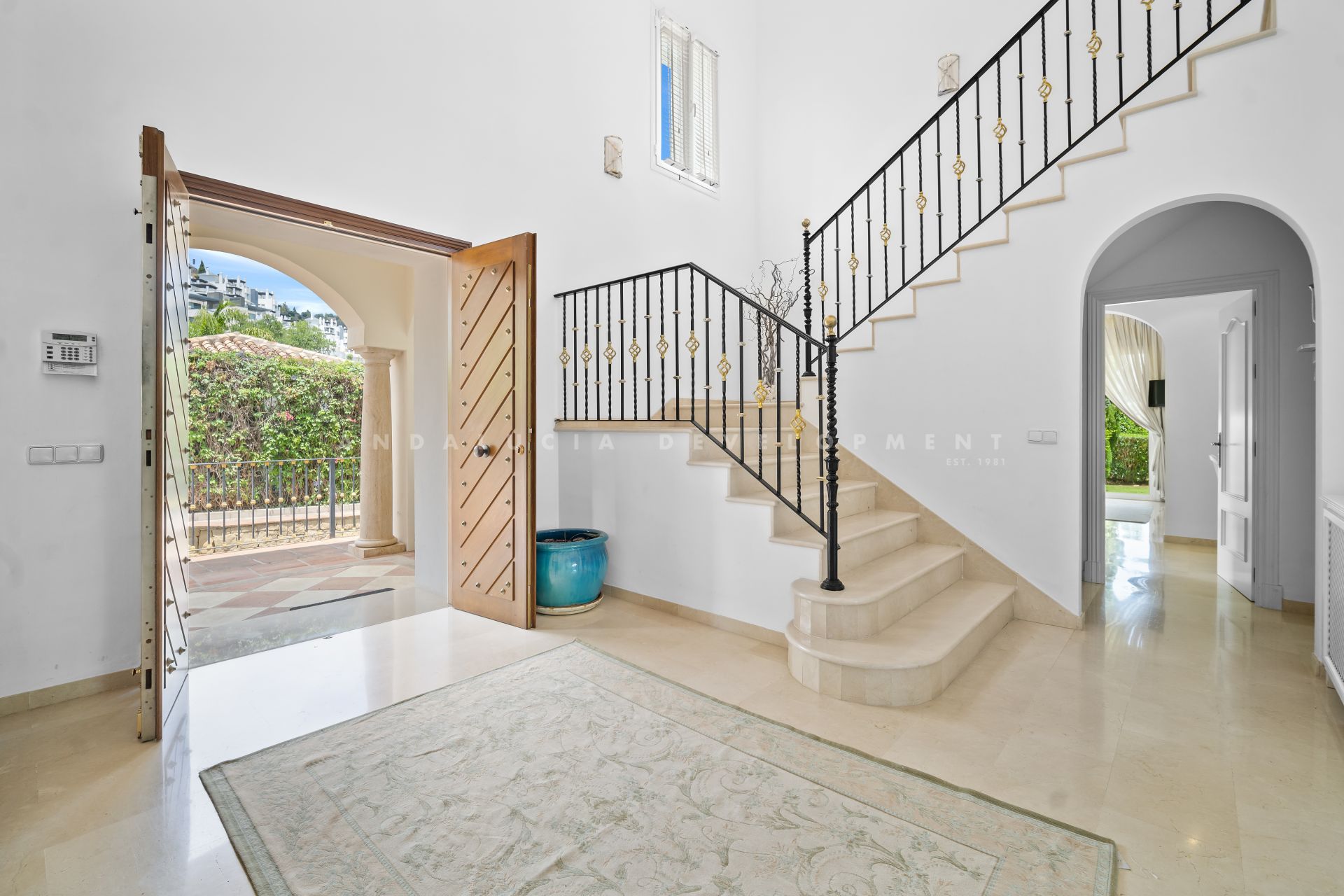 Nestled in the heart of La Reserva de La Quinta, one of the most exclusive gated communities in Benahavís, this classic Andalusian-style villa enjoys a privileged frontline golf position, surrounded by lush nature, total privacy, and timeless elegance. From the moment you enter through its grand double-height foyer, the home conveys an immediate sense of spaciousness and harmony, with a layout designed to ensure comfort and seamless flow between the indoor and outdoor living areas. The main house features four en-suite bedrooms. Three of them are located on the upper floor, each with access to private terraces that offer open views of the golf course and the mature gardens surrounding the property. The fourth bedroom is conveniently located on the ground floor, providing privacy and direct access to the garden—an ideal space for guests or anyone seeking single-level living. The daytime areas include a bright and inviting main living room, furnished with brand-new contemporary pieces, and a separate sitting room that offers additional space for reading or relaxing. Both rooms open effortlessly to the outside through large windows that flood the interiors with natural light. The fully fitted kitchen is generous in size and offers a perfect blend of style and practicality, complete with a breakfast area and garden views. Adjacent to it is a guest toilet, thoughtfully positioned for convenience.