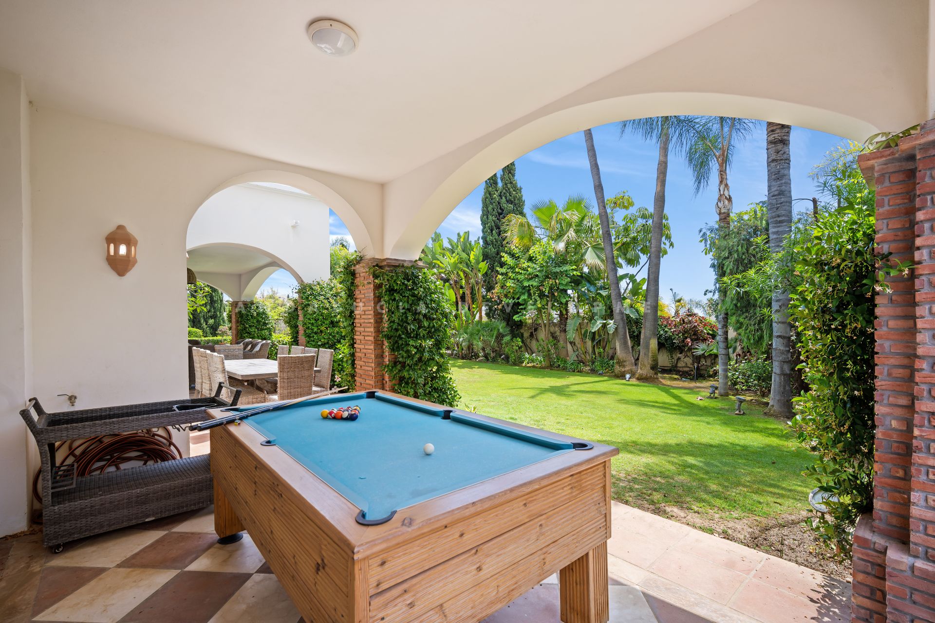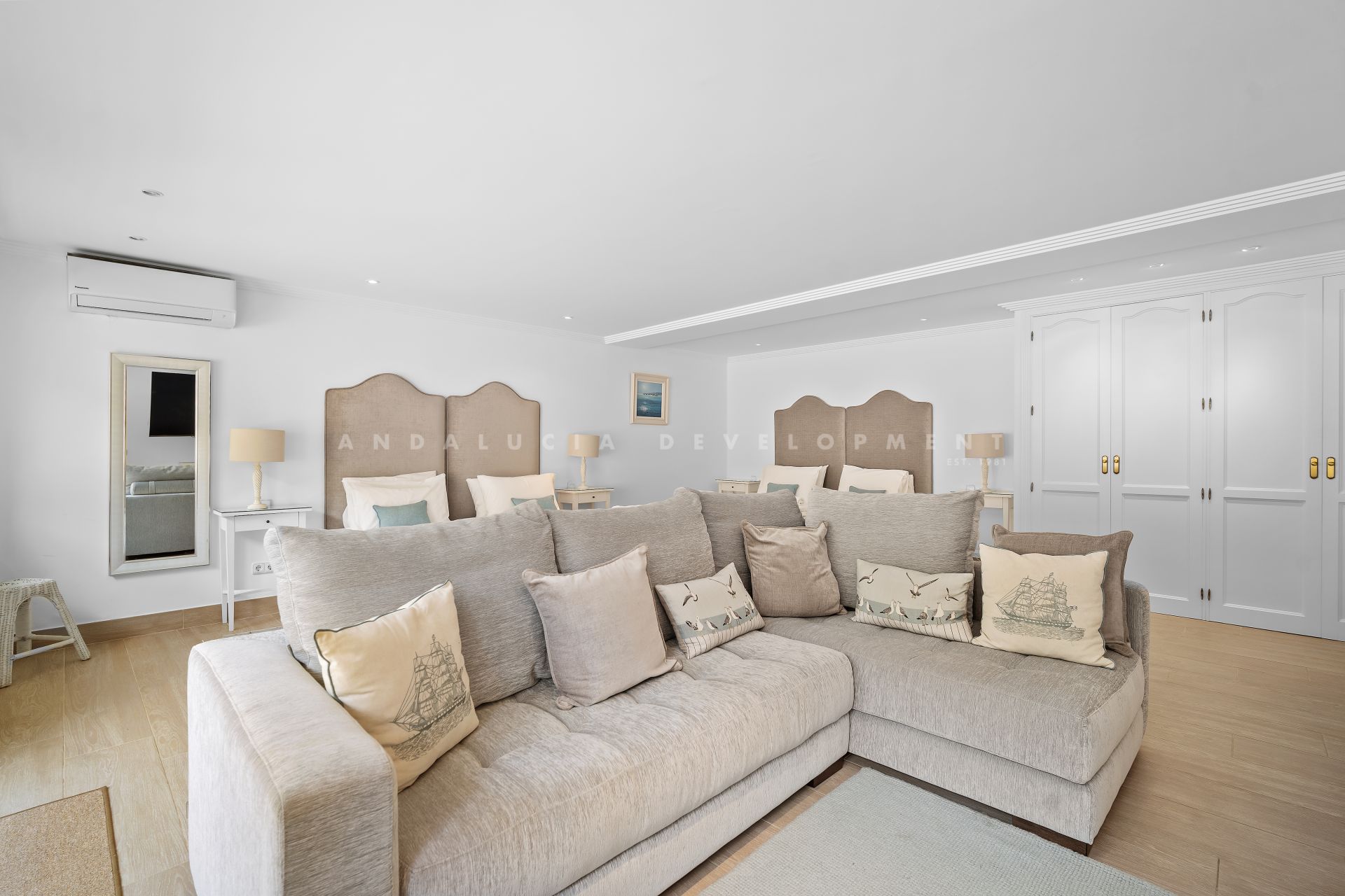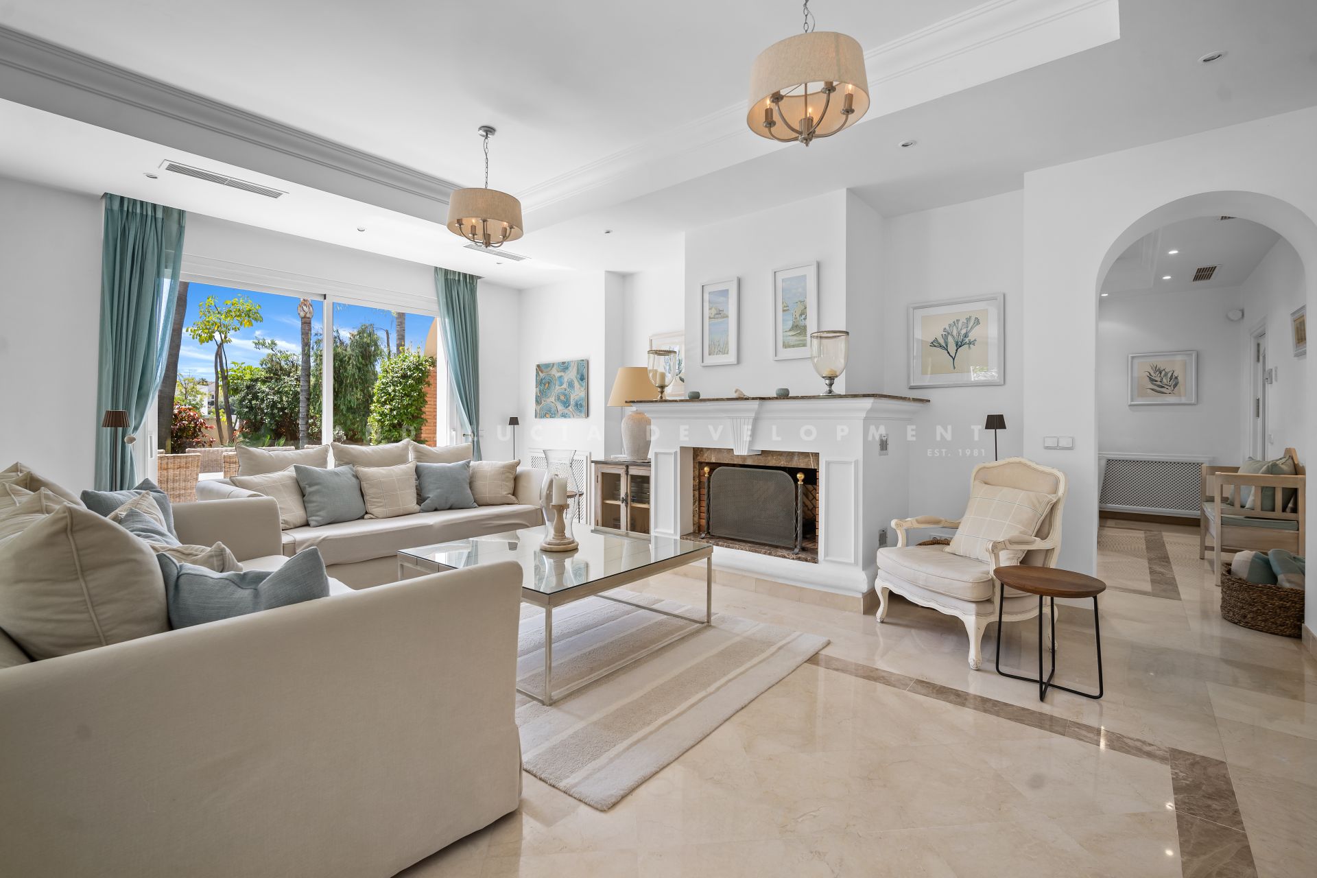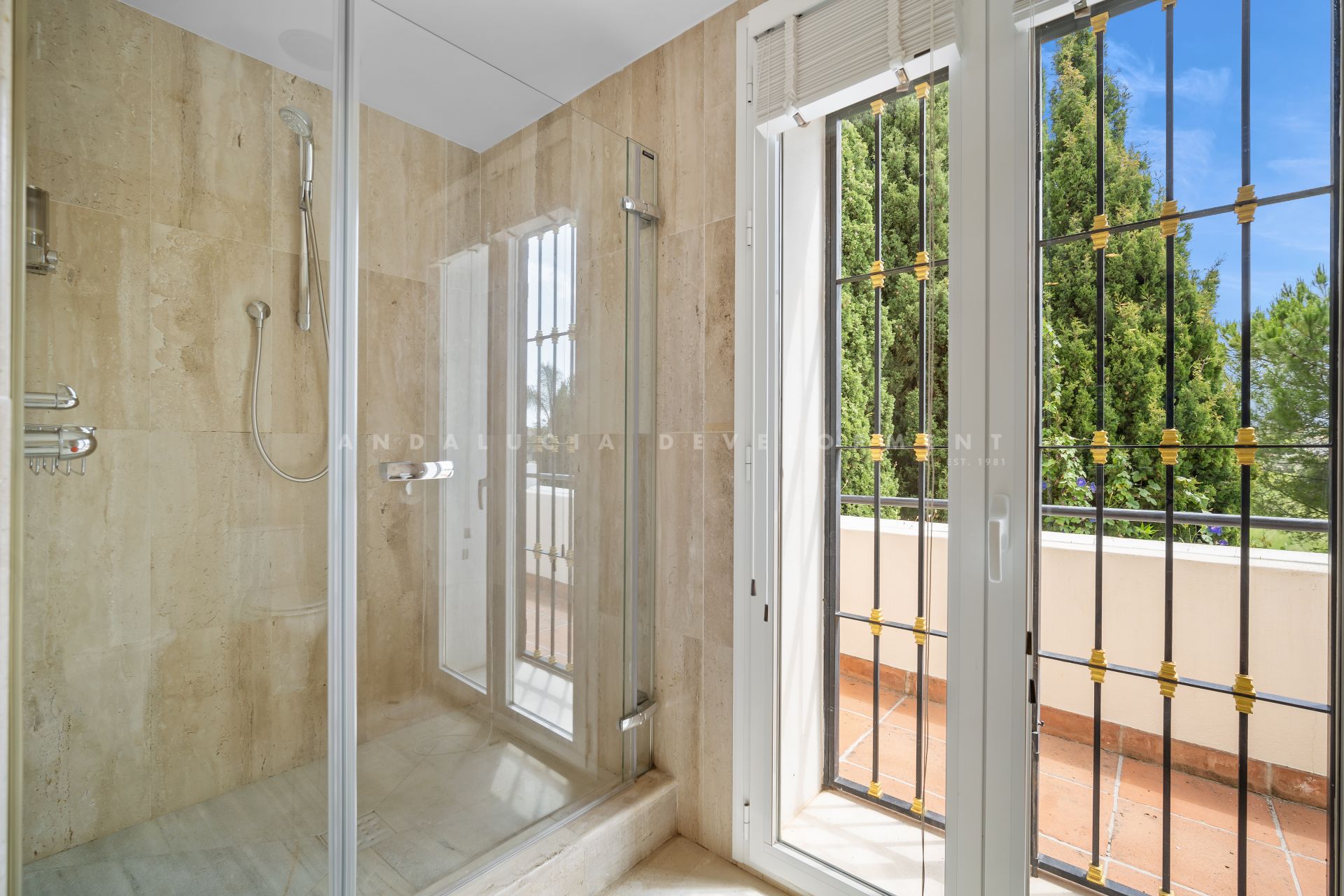 Nestled in the heart of La Reserva de La Quinta, one of the most exclusive gated communities in Benahavís, this classic Andalusian-style villa enjoys a privileged frontline golf position, surrounded by lush nature, total privacy, and timeless elegance. From the moment you enter through its grand double-height foyer, the home conveys an immediate sense of spaciousness and harmony, with a layout designed to ensure comfort and seamless flow between the indoor and outdoor living areas. The main house features four en-suite bedrooms. Three of them are located on the upper floor, each with access to private terraces that offer open views of the golf course and the mature gardens surrounding the property. The fourth bedroom is conveniently located on the ground floor, providing privacy and direct access to the garden—an ideal space for guests or anyone seeking single-level living. The daytime areas include a bright and inviting main living room, furnished with brand-new contemporary pieces, and a separate sitting room that offers additional space for reading or relaxing. Both rooms open effortlessly to the outside through large windows that flood the interiors with natural light. The fully fitted kitchen is generous in size and offers a perfect blend of style and practicality, complete with a breakfast area and garden views. Adjacent to it is a guest toilet, thoughtfully positioned for convenience.