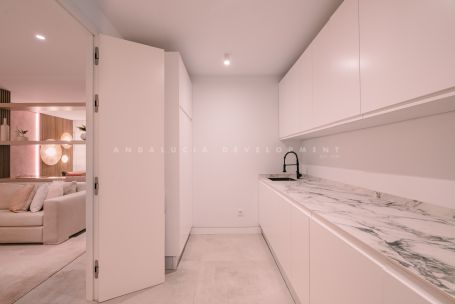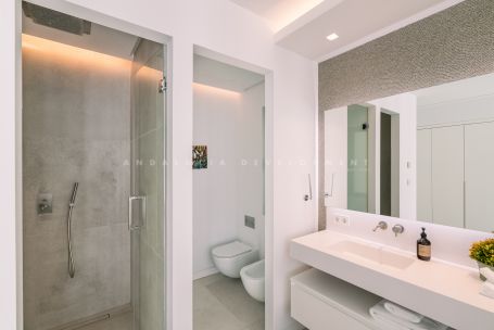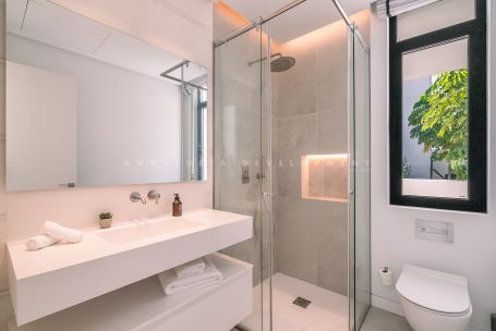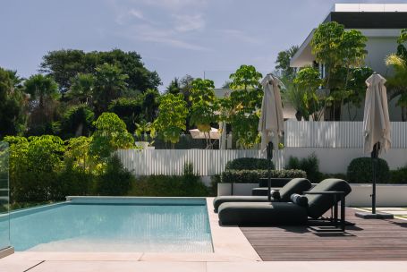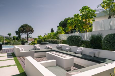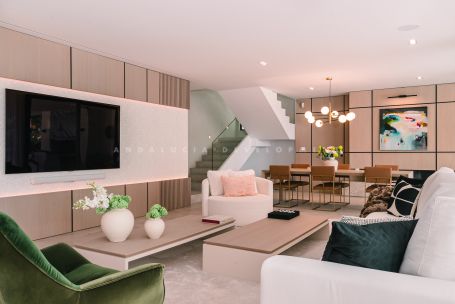 Stylishly designed villa located in the prestigious area of Nueva Andalucia in Marbella. This contemporary accommodation offers an unbeatable combination of luxury, comfort and proximity to some of the most desirable locations in the area. Here you have a short walk to the Las Brisas and Los Naranjos golf courses, as well as to the vibrant nightlife and shopping opportunities of Puerto Banús. Furnished with high-quality materials, the villa offers a generous open-plan layout that unites the living room, the dining room and the fully equipped, state-of-the-art kitchen. The large window sections let in plenty of daylight and provide a fantastic view of the surroundings as well as direct access to a spacious terrace. The terrace is perfect for enjoying Marbella’s sunny climate, and is equipped with an elegant lounge corner, an outdoor kitchen and a stylish bar – ideal for social events with friends and family.