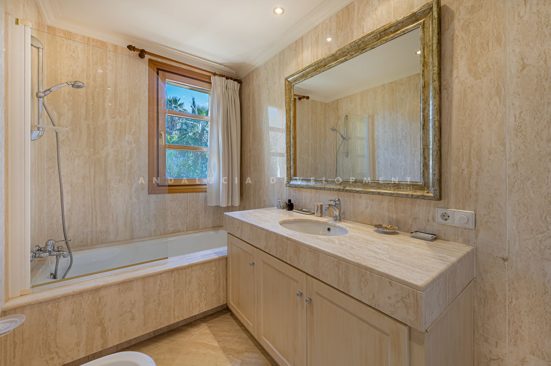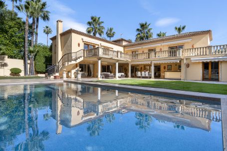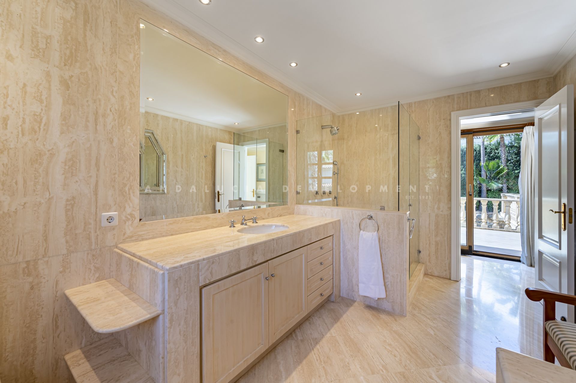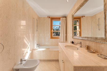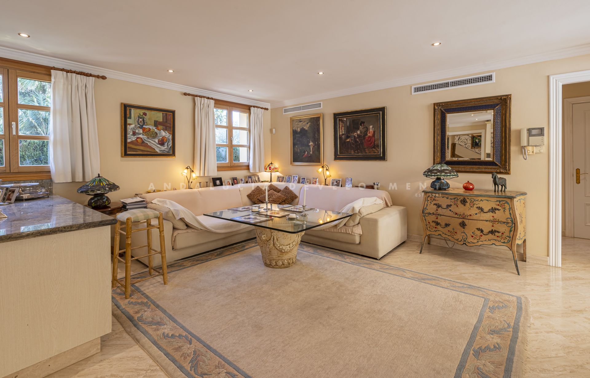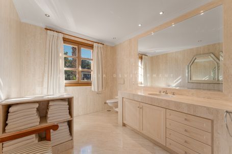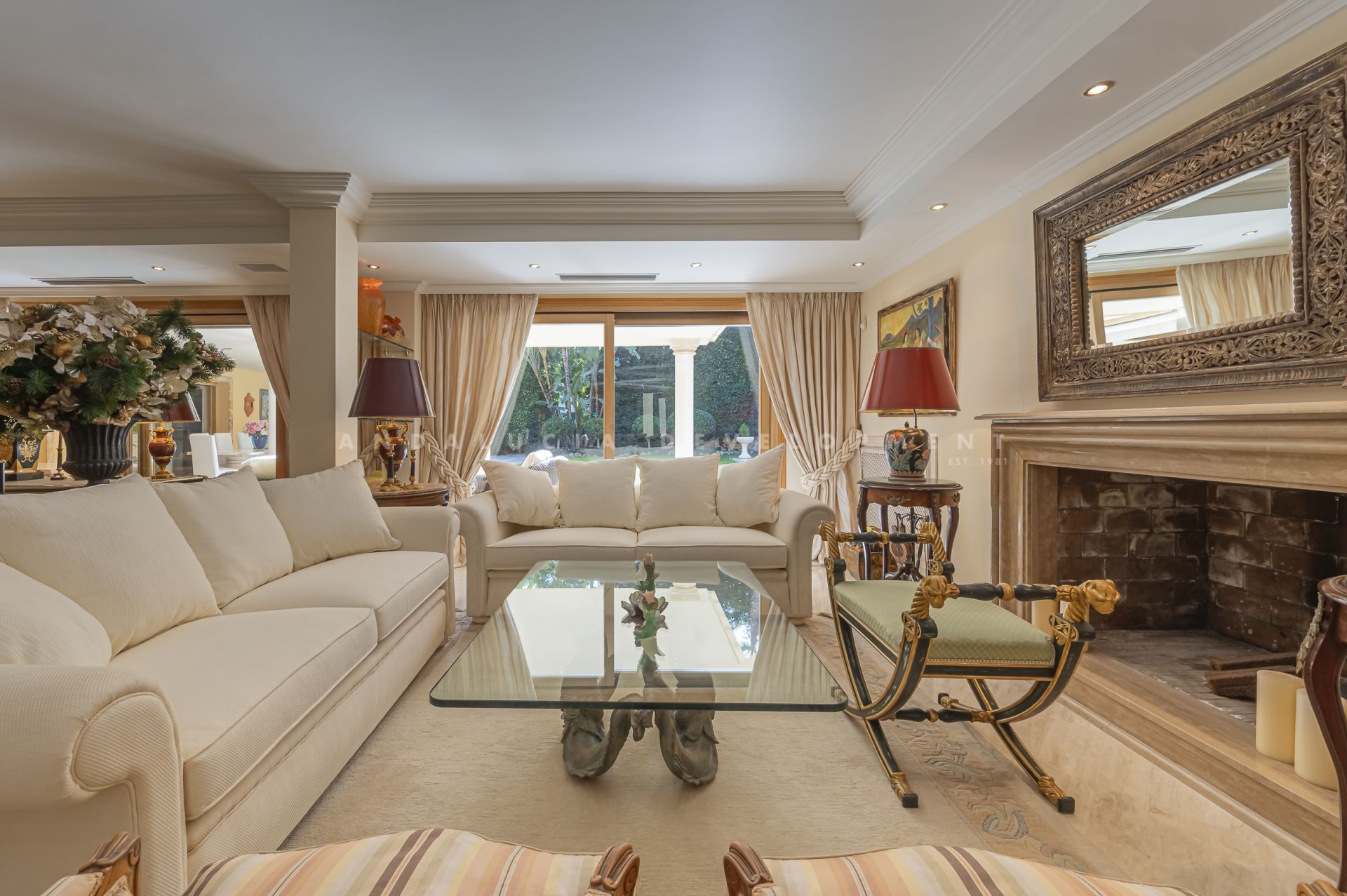 This luxury classic villa exemplifies high standig living on the Costa del Sol amidst the lush greenery of Nueva Andalucía’s premier golf courses. Its sought-after southwest orientation ensures ample sunlight within a peaceful residential enclave. Located just moments away from Aloha’s renowned dining establishments, vibrant bars, iconic Puerto Banús and beaches, convenience blends seamlessly with luxury in this prestigious neighbourhood. Step into an expansive entrance with marble floors and a grand staircase, setting the tone for refined elegance. The main level unveils an impressive open-plan layout, seamlessly blending living, dining, and formal entertaining spaces accentuated by a welcoming fireplace. Floor-to-ceiling windows frame views of the meticulously landscaped garden and inviting pool from the vast covered porch with a bar and dining area. A gourmet kitchen with a comfortable sitting area beckons gatherings and culinary delights, while a separate entrance leads to the laundry facilities, office, and a guest suite with a bathroom. Ascend to the second floor, comprising three spacious and luminous bedrooms, including the grand primary suite with an ensuite bathroom and walk-in closet. Each bedroom boasts a generous balcony with retractable awnings, inviting residents to enjoy the indoor-outdoor lifestyle and admire the Costa del Sol sunsets. The lower level offers a wealth of potential with a multipurpose area, sauna, bathroom, ample storage spaces and staff quarters. This floor is the perfect canvas for bespoke entertainment and wellness facilities such as a gym, cinema or games room. The villa is a haven for families, thanks to its proximity to premier educational institutions. Set within reach of esteemed schools, it’s the ideal residence for those prioritising education for their children. Positioned moments away from Puerto Banús, renowned for its glamorous marina and upscale boutiques, the famed Marbella Golden Mile and the beaches of the Costa del Sol, residents enjoy easy access to the region’s most coveted destinations. Whether indulging in the vibrant nightlife of Puerto Banús, taking strolls along the promenade, or basking in the Mediterranean sun on pristine shores, every day promises a wealth of experiences just a short distance from home. This villa encapsulates the essence of Costa del Sol living – a fusion of sophistication and convenience in a prime location that offers the best of both worlds.