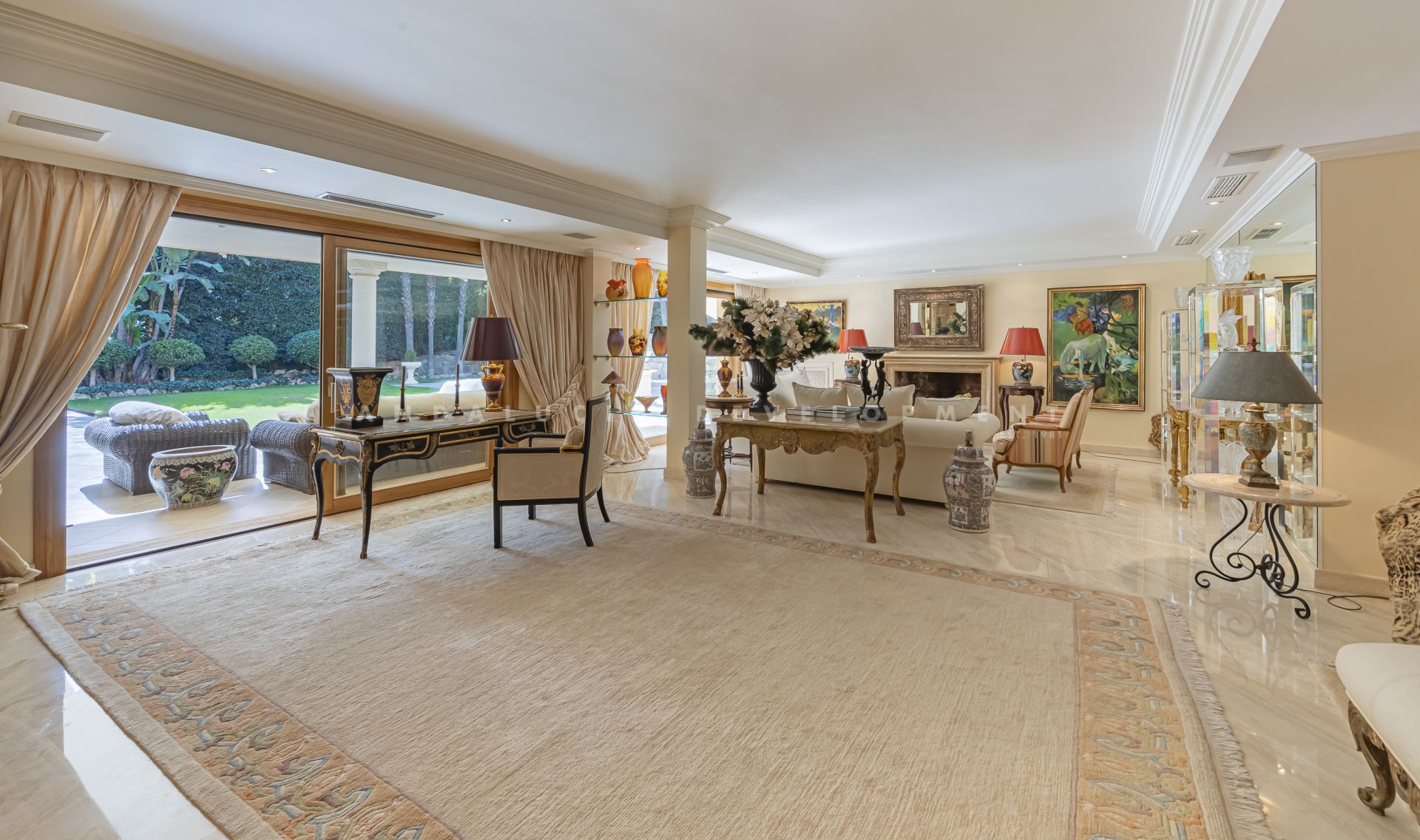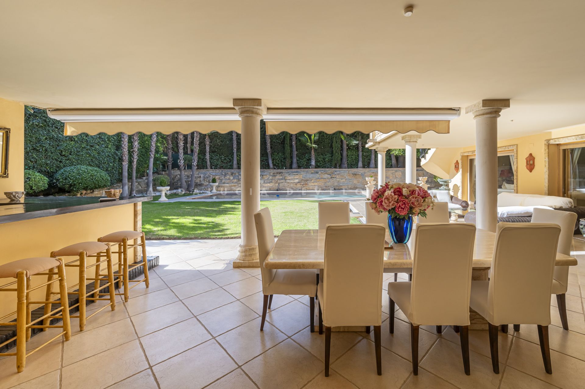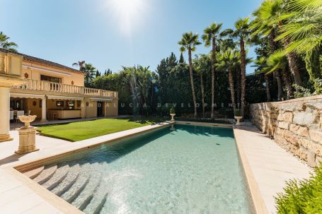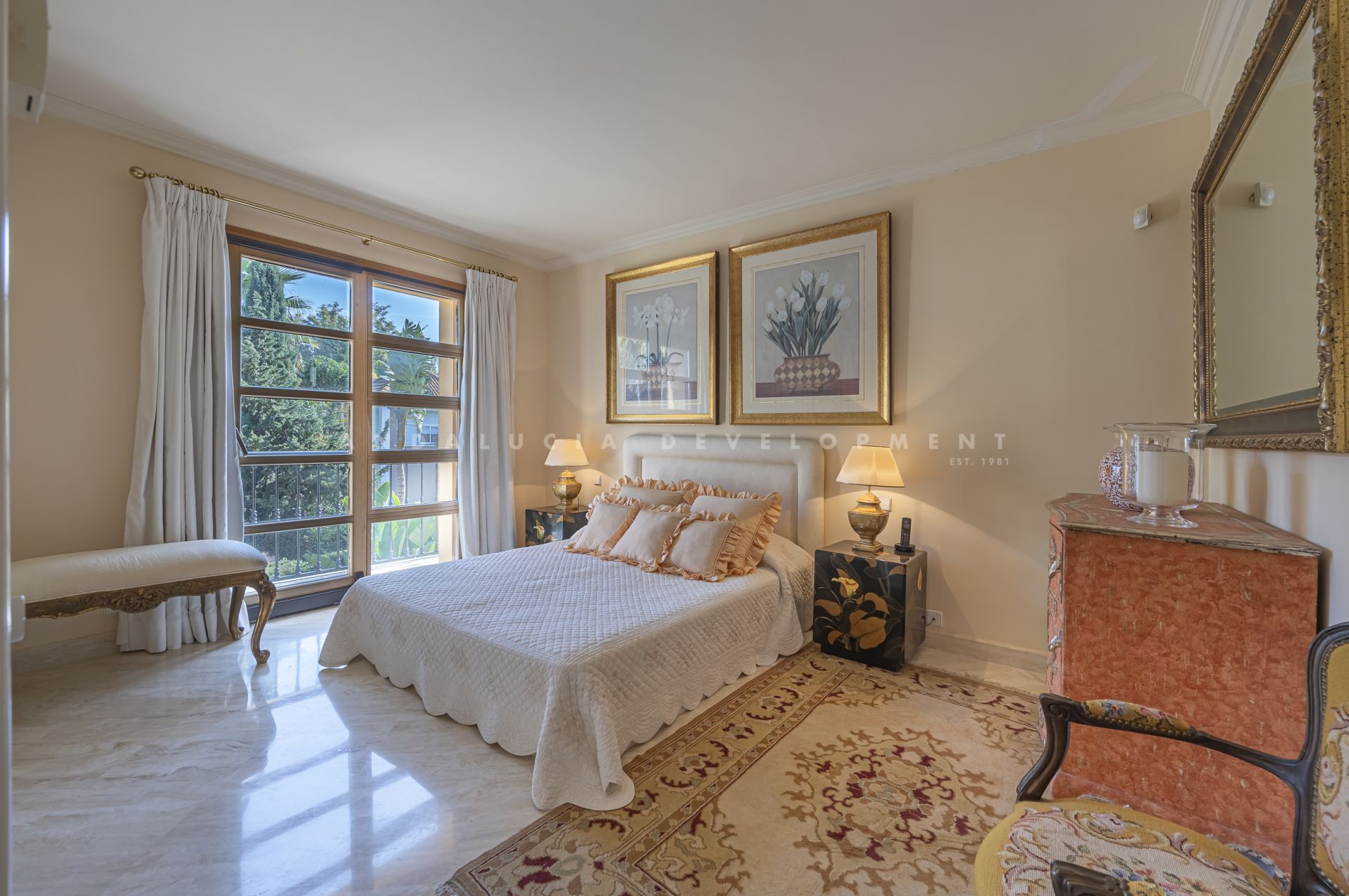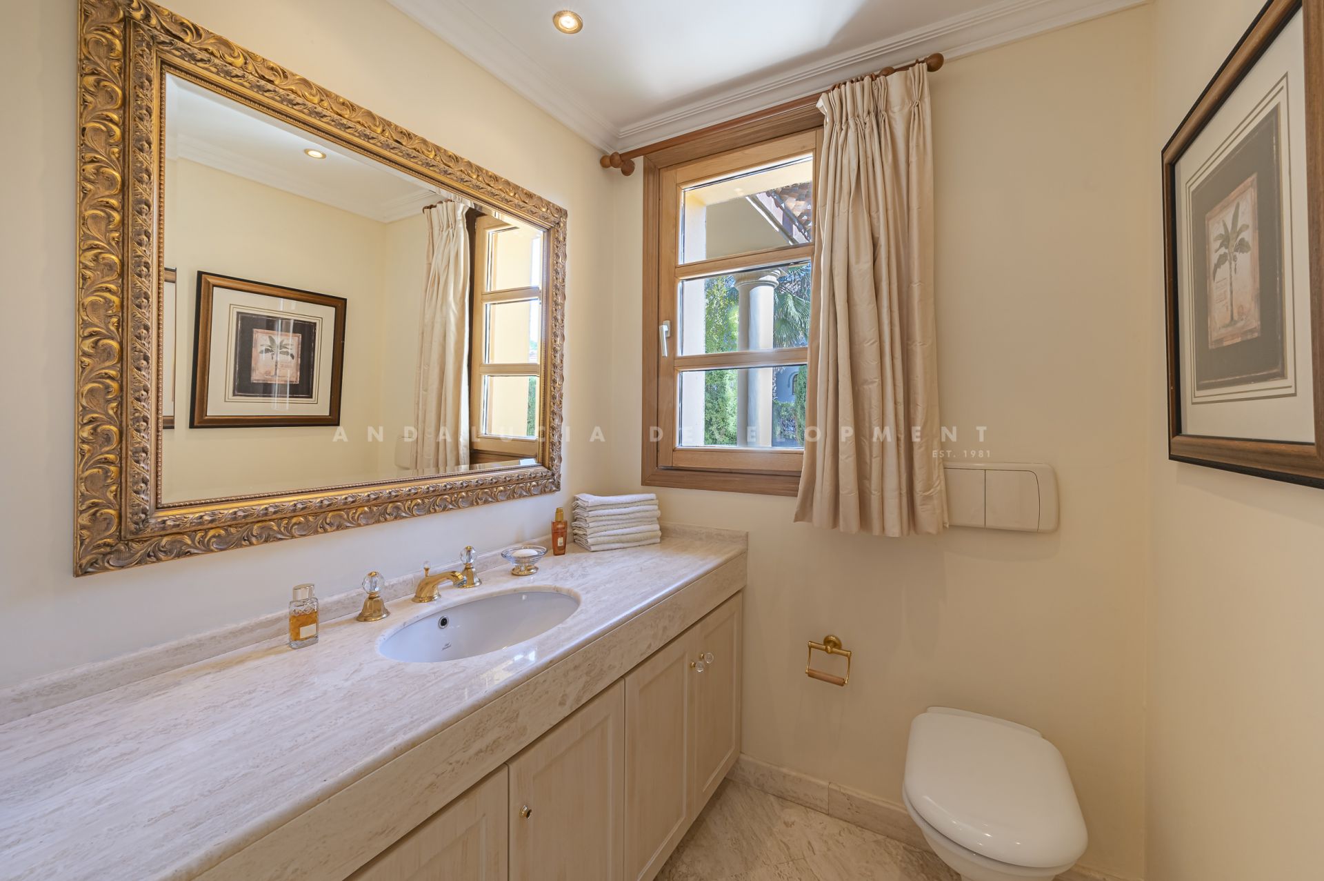 This luxury classic villa exemplifies high standig living on the Costa del Sol amidst the lush greenery of Nueva Andalucía’s premier golf courses. Its sought-after southwest orientation ensures ample sunlight within a peaceful residential enclave. Located just moments away from Aloha’s renowned dining establishments, vibrant bars, iconic Puerto Banús and beaches, convenience blends seamlessly with luxury in this prestigious neighbourhood. Step into an expansive entrance with marble floors and a grand staircase, setting the tone for refined elegance. The main level unveils an impressive open-plan layout, seamlessly blending living, dining, and formal entertaining spaces accentuated by a welcoming fireplace. Floor-to-ceiling windows frame views of the meticulously landscaped garden and inviting pool from the vast covered porch with a bar and dining area. A gourmet kitchen with a comfortable sitting area beckons gatherings and culinary delights, while a separate entrance leads to the laundry facilities, office, and a guest suite with a bathroom. Ascend to the second floor, comprising three spacious and luminous bedrooms, including the grand primary suite with an ensuite bathroom and walk-in closet. Each bedroom boasts a generous balcony with retractable awnings, inviting residents to enjoy the indoor-outdoor lifestyle and admire the Costa del Sol sunsets. The lower level offers a wealth of potential with a multipurpose area, sauna, bathroom, ample storage spaces and staff quarters. This floor is the perfect canvas for bespoke entertainment and wellness facilities such as a gym, cinema or games room. The villa is a haven for families, thanks to its proximity to premier educational institutions. Set within reach of esteemed schools, it’s the ideal residence for those prioritising education for their children. Positioned moments away from Puerto Banús, renowned for its glamorous marina and upscale boutiques, the famed Marbella Golden Mile and the beaches of the Costa del Sol, residents enjoy easy access to the region’s most coveted destinations. Whether indulging in the vibrant nightlife of Puerto Banús, taking strolls along the promenade, or basking in the Mediterranean sun on pristine shores, every day promises a wealth of experiences just a short distance from home. This villa encapsulates the essence of Costa del Sol living – a fusion of sophistication and convenience in a prime location that offers the best of both worlds.