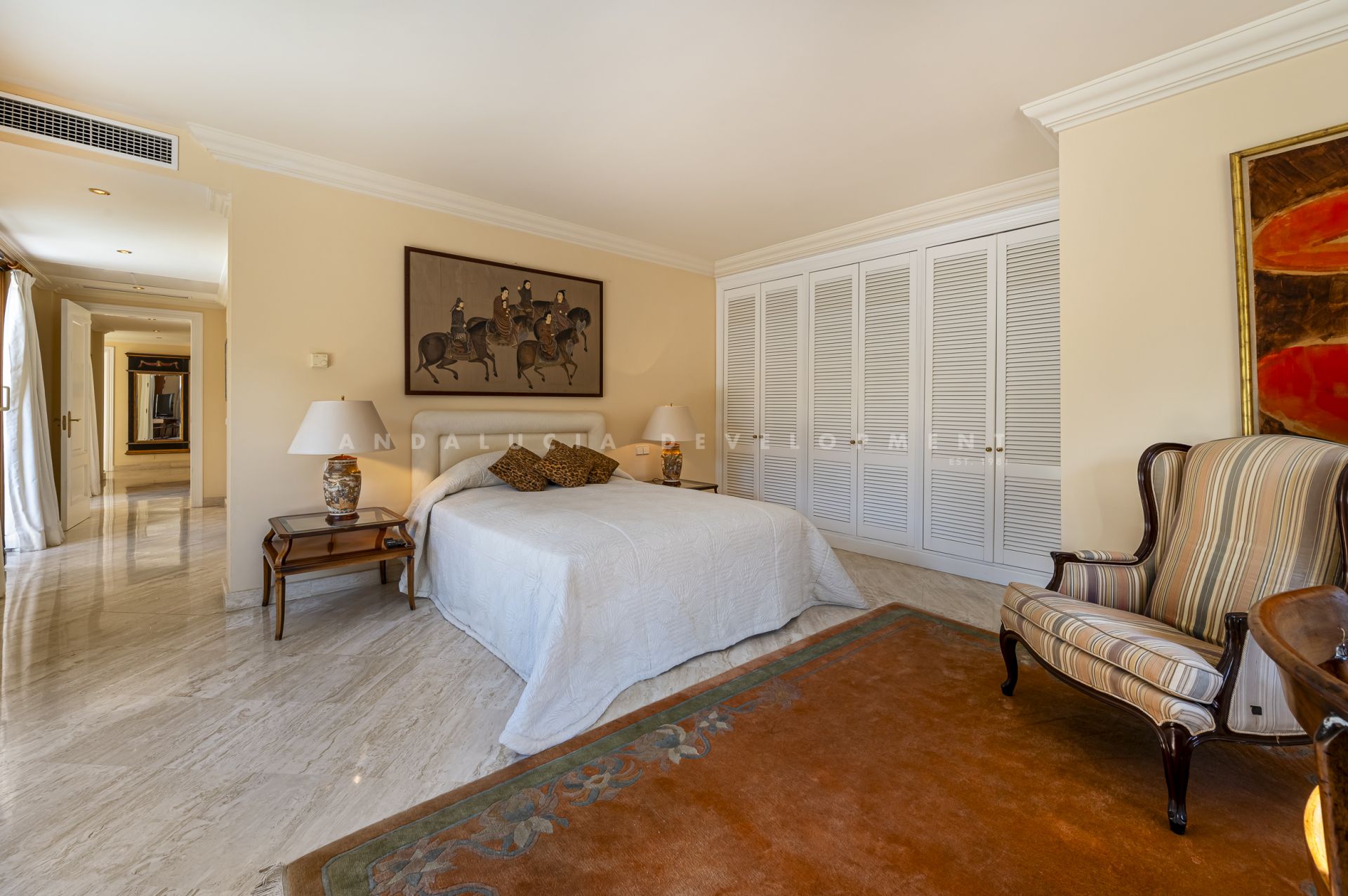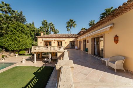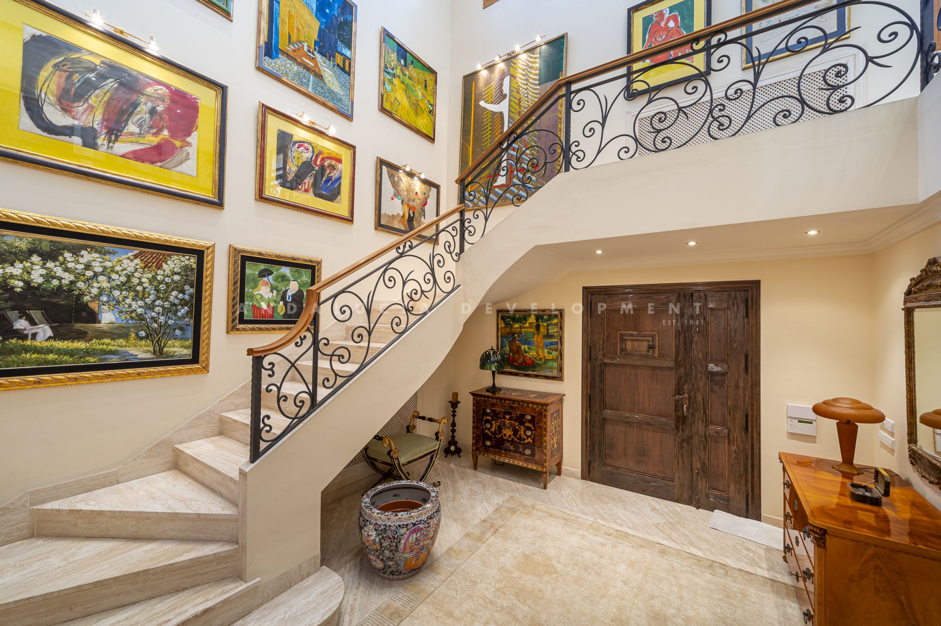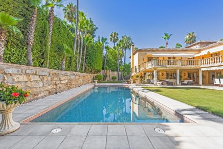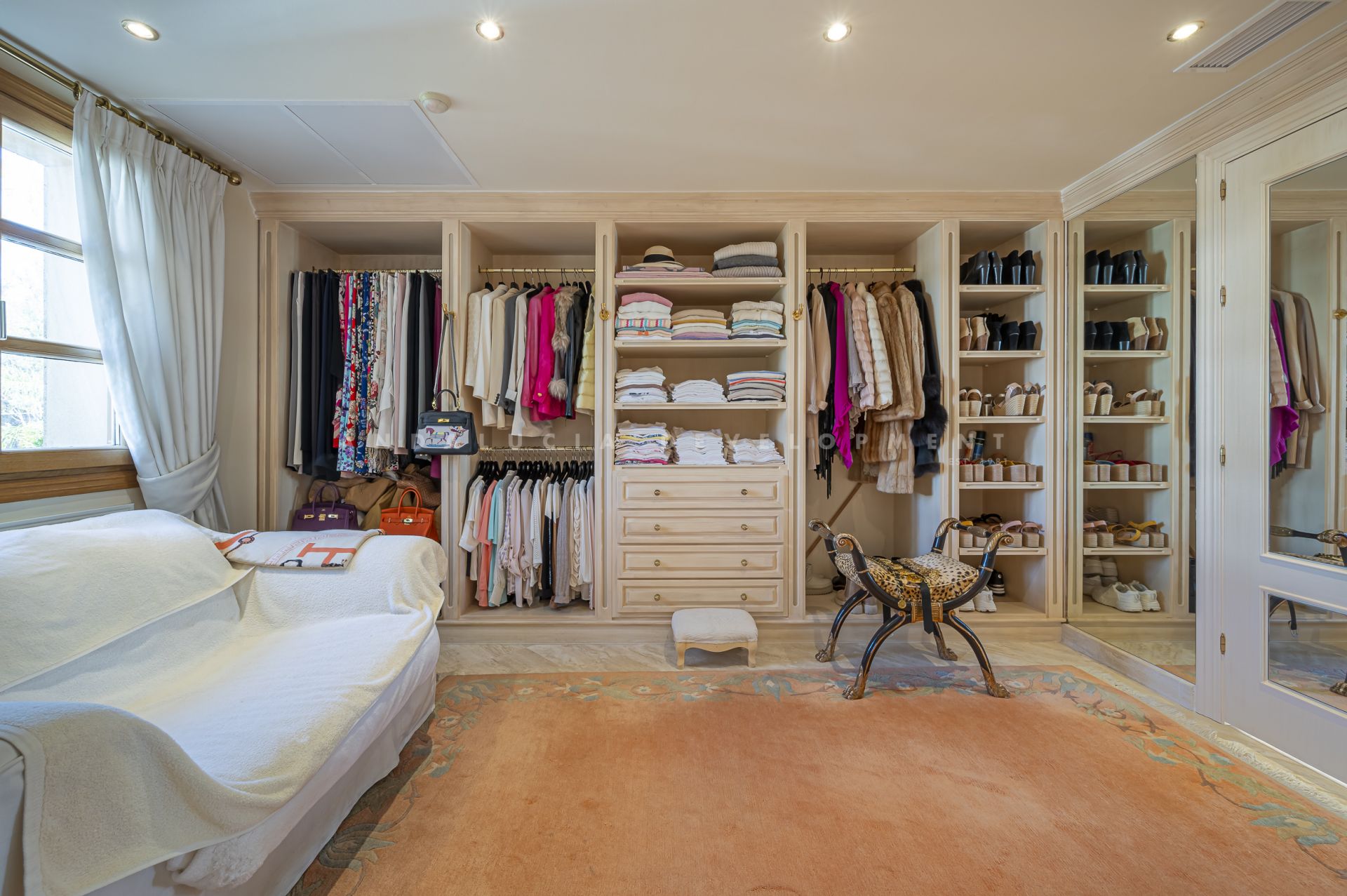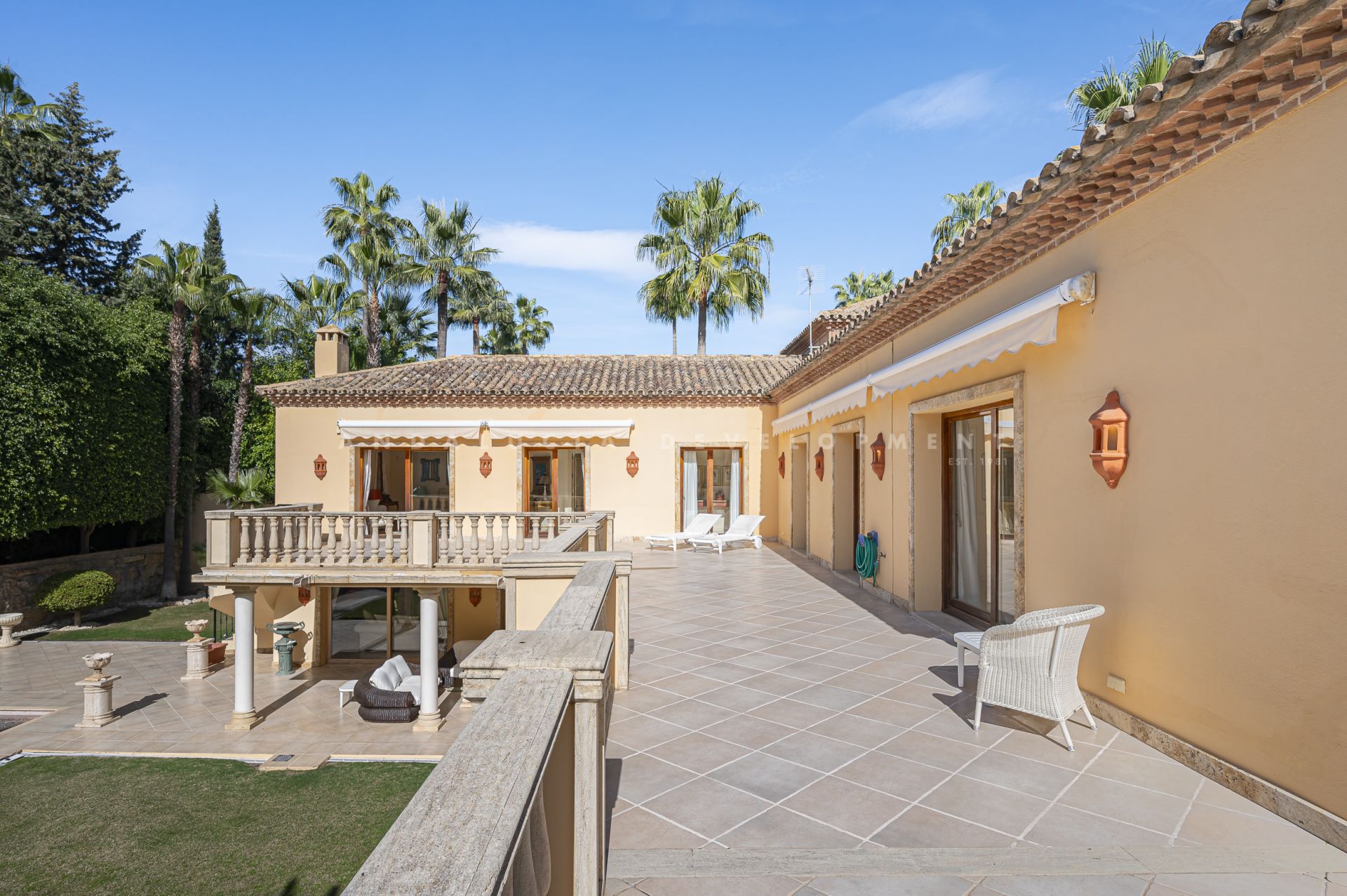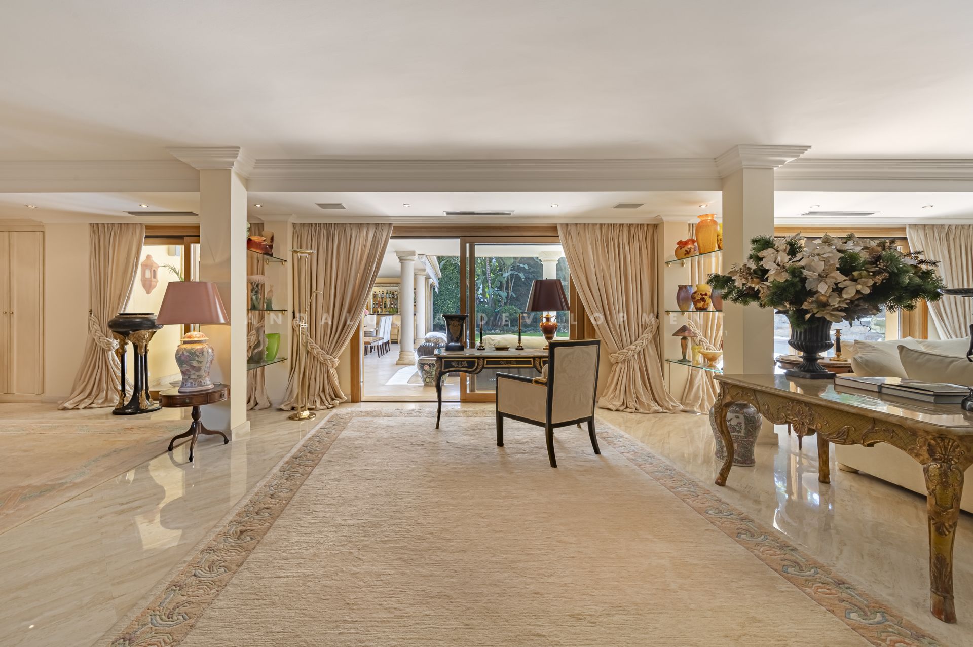 This luxury classic villa exemplifies high standig living on the Costa del Sol amidst the lush greenery of Nueva Andalucía’s premier golf courses. Its sought-after southwest orientation ensures ample sunlight within a peaceful residential enclave. Located just moments away from Aloha’s renowned dining establishments, vibrant bars, iconic Puerto Banús and beaches, convenience blends seamlessly with luxury in this prestigious neighbourhood. Step into an expansive entrance with marble floors and a grand staircase, setting the tone for refined elegance. The main level unveils an impressive open-plan layout, seamlessly blending living, dining, and formal entertaining spaces accentuated by a welcoming fireplace. Floor-to-ceiling windows frame views of the meticulously landscaped garden and inviting pool from the vast covered porch with a bar and dining area. A gourmet kitchen with a comfortable sitting area beckons gatherings and culinary delights, while a separate entrance leads to the laundry facilities, office, and a guest suite with a bathroom. Ascend to the second floor, comprising three spacious and luminous bedrooms, including the grand primary suite with an ensuite bathroom and walk-in closet. Each bedroom boasts a generous balcony with retractable awnings, inviting residents to enjoy the indoor-outdoor lifestyle and admire the Costa del Sol sunsets. The lower level offers a wealth of potential with a multipurpose area, sauna, bathroom, ample storage spaces and staff quarters. This floor is the perfect canvas for bespoke entertainment and wellness facilities such as a gym, cinema or games room. The villa is a haven for families, thanks to its proximity to premier educational institutions. Set within reach of esteemed schools, it’s the ideal residence for those prioritising education for their children. Positioned moments away from Puerto Banús, renowned for its glamorous marina and upscale boutiques, the famed Marbella Golden Mile and the beaches of the Costa del Sol, residents enjoy easy access to the region’s most coveted destinations. Whether indulging in the vibrant nightlife of Puerto Banús, taking strolls along the promenade, or basking in the Mediterranean sun on pristine shores, every day promises a wealth of experiences just a short distance from home. This villa encapsulates the essence of Costa del Sol living – a fusion of sophistication and convenience in a prime location that offers the best of both worlds.