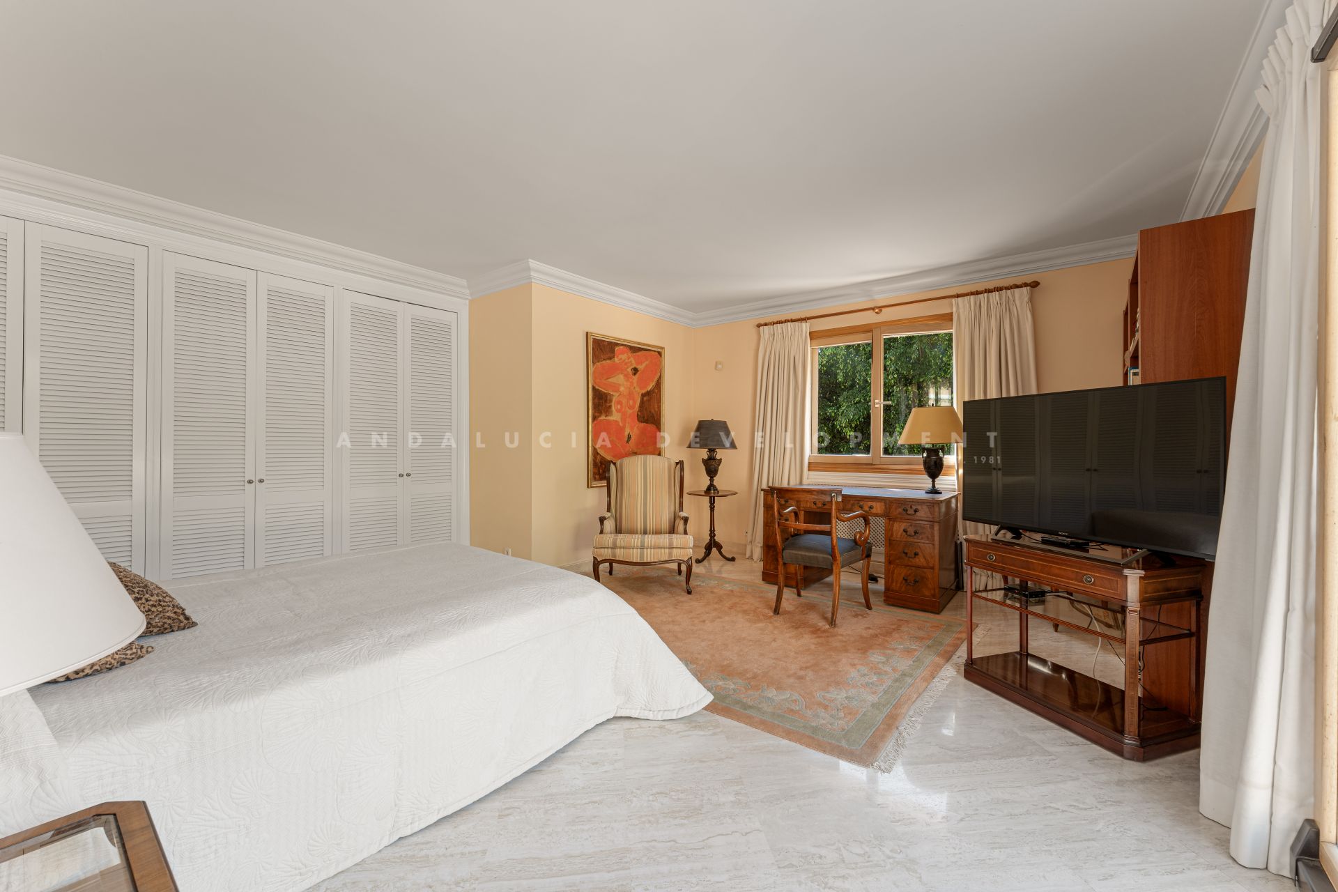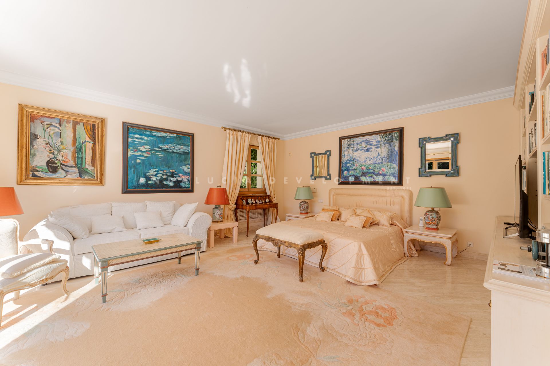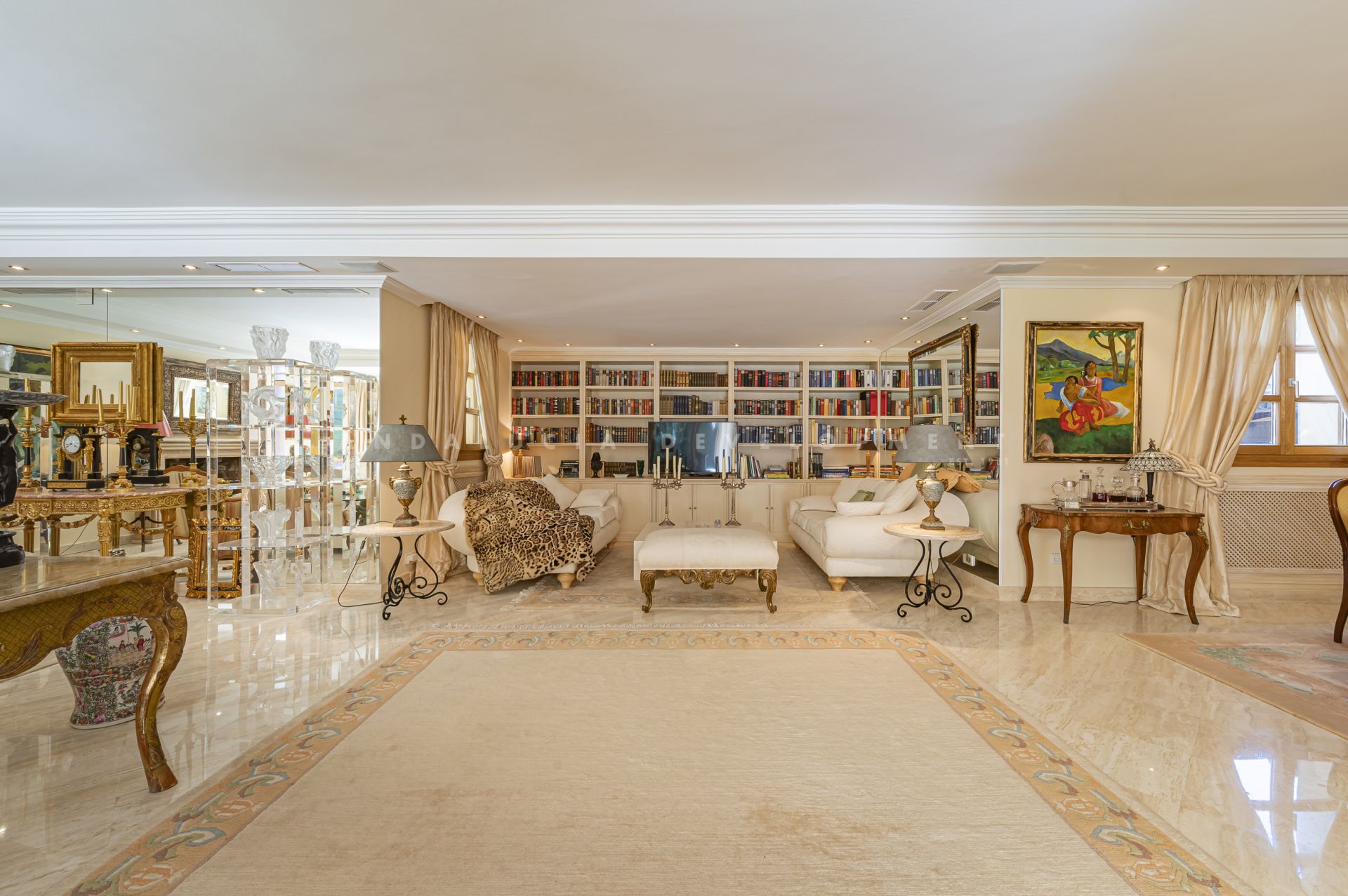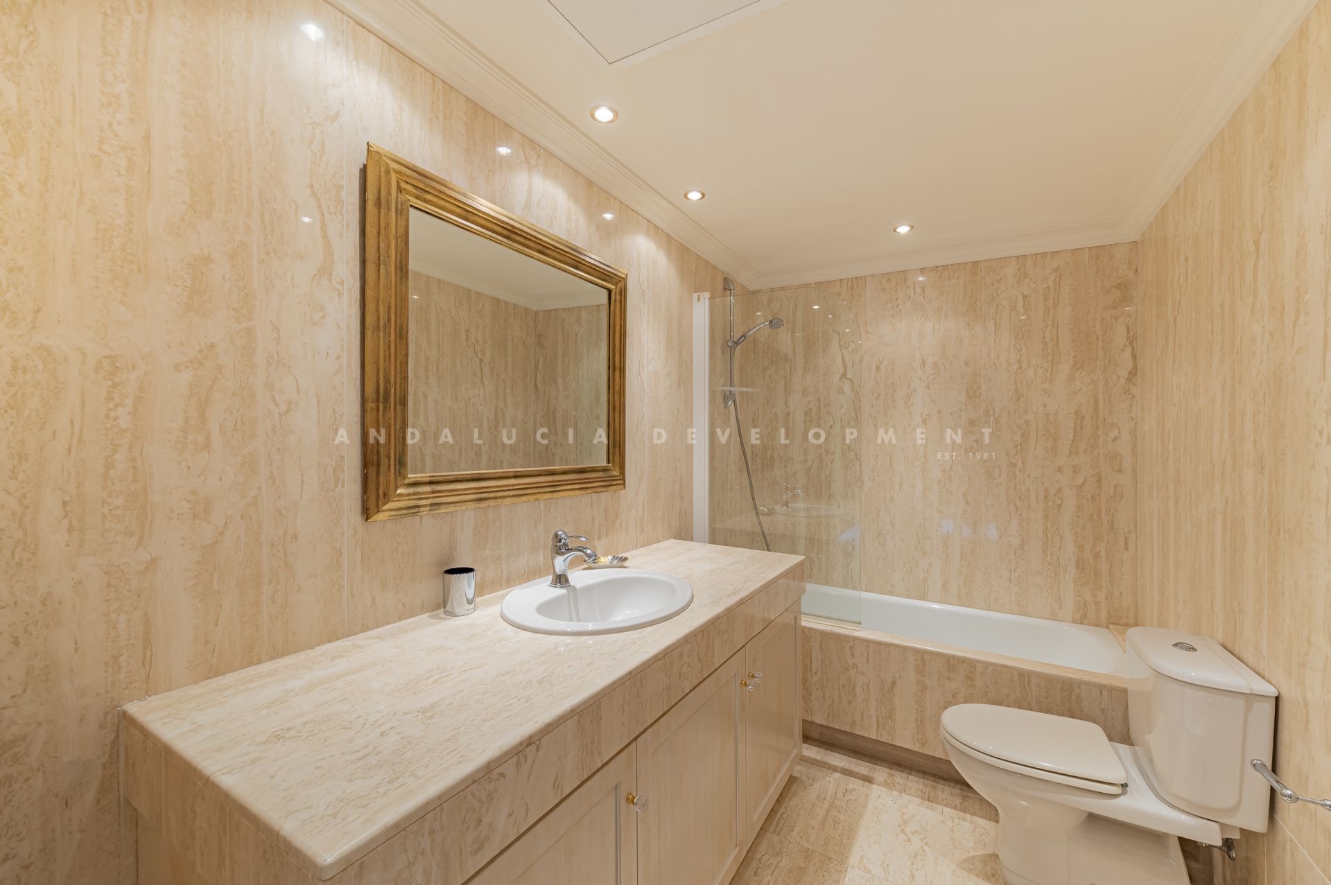 This luxury classic villa exemplifies high standig living on the Costa del Sol amidst the lush greenery of Nueva Andalucía’s premier golf courses. Its sought-after southwest orientation ensures ample sunlight within a peaceful residential enclave. Located just moments away from Aloha’s renowned dining establishments, vibrant bars, iconic Puerto Banús and beaches, convenience blends seamlessly with luxury in this prestigious neighbourhood. Step into an expansive entrance with marble floors and a grand staircase, setting the tone for refined elegance. The main level unveils an impressive open-plan layout, seamlessly blending living, dining, and formal entertaining spaces accentuated by a welcoming fireplace. Floor-to-ceiling windows frame views of the meticulously landscaped garden and inviting pool from the vast covered porch with a bar and dining area. A gourmet kitchen with a comfortable sitting area beckons gatherings and culinary delights, while a separate entrance leads to the laundry facilities, office, and a guest suite with a bathroom. Ascend to the second floor, comprising three spacious and luminous bedrooms, including the grand primary suite with an ensuite bathroom and walk-in closet. Each bedroom boasts a generous balcony with retractable awnings, inviting residents to enjoy the indoor-outdoor lifestyle and admire the Costa del Sol sunsets. The lower level offers a wealth of potential with a multipurpose area, sauna, bathroom, ample storage spaces and staff quarters. This floor is the perfect canvas for bespoke entertainment and wellness facilities such as a gym, cinema or games room. The villa is a haven for families, thanks to its proximity to premier educational institutions. Set within reach of esteemed schools, it’s the ideal residence for those prioritising education for their children. Positioned moments away from Puerto Banús, renowned for its glamorous marina and upscale boutiques, the famed Marbella Golden Mile and the beaches of the Costa del Sol, residents enjoy easy access to the region’s most coveted destinations. Whether indulging in the vibrant nightlife of Puerto Banús, taking strolls along the promenade, or basking in the Mediterranean sun on pristine shores, every day promises a wealth of experiences just a short distance from home. This villa encapsulates the essence of Costa del Sol living – a fusion of sophistication and convenience in a prime location that offers the best of both worlds.