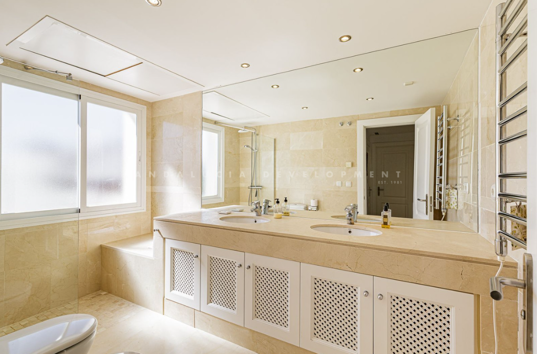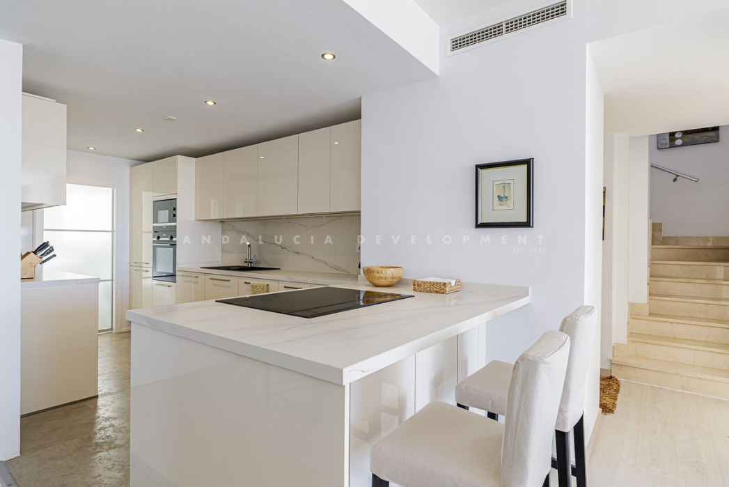A fantastic penthouse duplex apartment with stunning views over the ocean, mountains and beautiful surroundings of Nueva Andalucia. This amazing south-west facing Penthouse is very private and has been furnished with high quality materials throughout. The living / dining area has access to a big terrace with views across the whole area of Nueva Andalucia and with panoramic views over the Mediterranean Sea and Gibraltar. On a bright day you can view the African coast line. Both of the bedrooms are very spacious. The upper bedroom has access onto a huge terrace, housing its own private sauna. The south west-facing orientation and the generous part of glass walls and windows ensures a maximum of sunlight and creates a bright and light feeling throughout. The kitchen is recently renovated and fully equipped with high quality fixtures. Next to the kitchen there’s a separate laundry room. The property offers a lot of space, built -in wardrobes and a storage. The urbanisation is well runned and gated with full CCTV coverage. The communal areas are stunning with a beautiful garden and a large infinity pool. This property comes with underground parking for 2 cars, a big storage room and lift. The apartment is located on floor 3 and 4 and it’s a corner unit with its own floor plan. It’s located in the sought after golf valley of Nueva Andalucia nearby Aloha, Las Brisas and Los Naranjos golf courses. In the vincinity there’s a small lake and many trails for nature walks. You reach a big range or shops and restaurants in just a few minutes by car and to the beaches it is a 10 min drive.