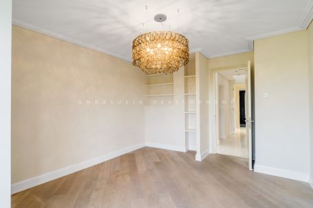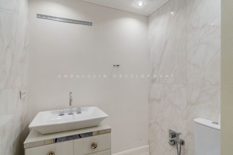 Wonderful six-bedroom, southwest-facing luxury villa in Lomas de Magna Marbella, one of the most prestigious complexes on Marbella's Golden Mile. The villa is situated within a gated community that offers 24-hour security service, two large communal pools, and lush tropical gardens of incredible beauty. It is conveniently located close to all amenities, including supermarkets, shops, restaurants, schools, and golf courses, and is only a five-minute drive from the sea. This incredible property spans three floors. The main floor features an entrance hall, a spacious living room with direct access to a semi-covered terrace that includes tropical gardens with dining spaces and a chill-out area, as well as a private exit to the communal pool. There is also a bright bedroom with an en-suite bathroom, a well-proportioned kitchen, and a guest toilet on this floor. The upper floor has three bedrooms, each with an en-suite bathroom, and a sunny terrace with partial sea views. The basement comprises two additional bedrooms with bathrooms, a games room, a laundry room, a sauna, a hammam, and a garage with enough space for four cars. The house also has its own elevator.