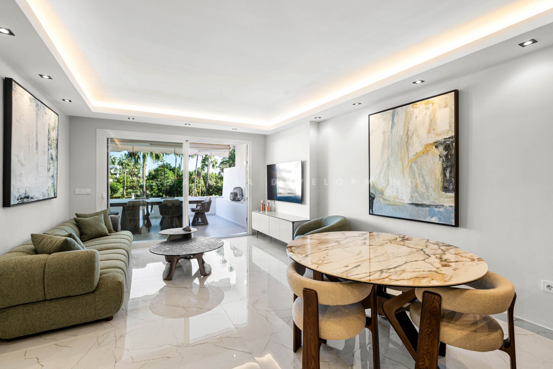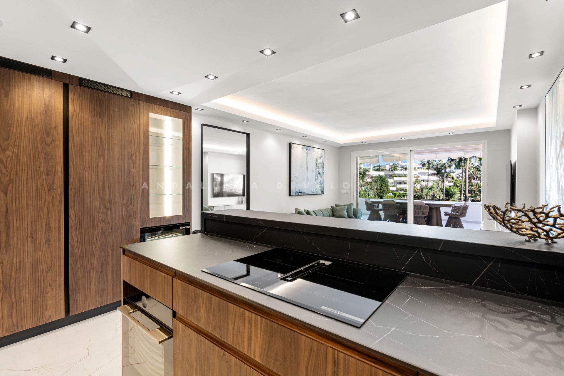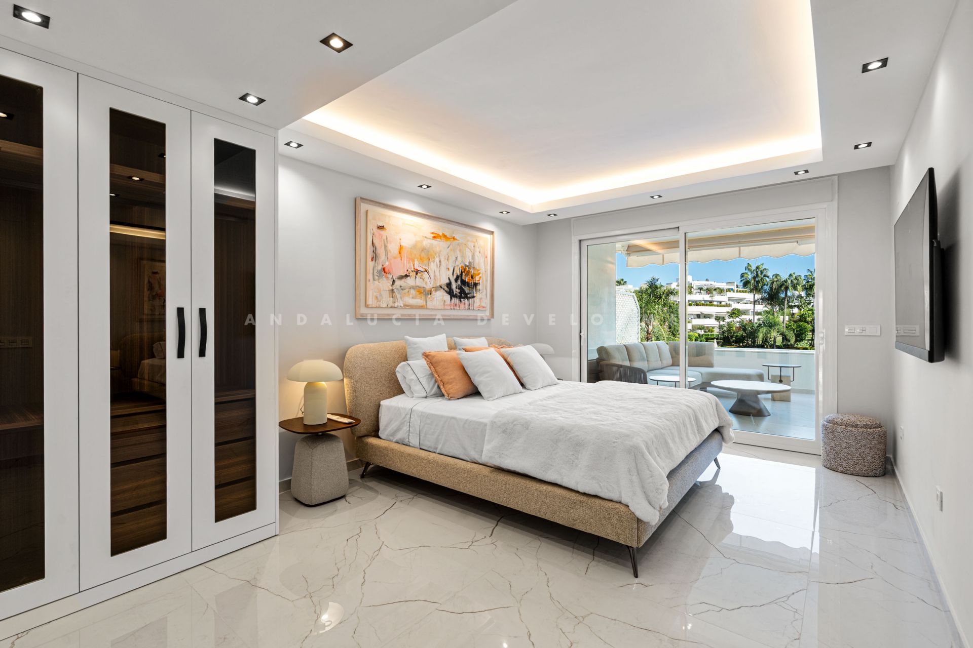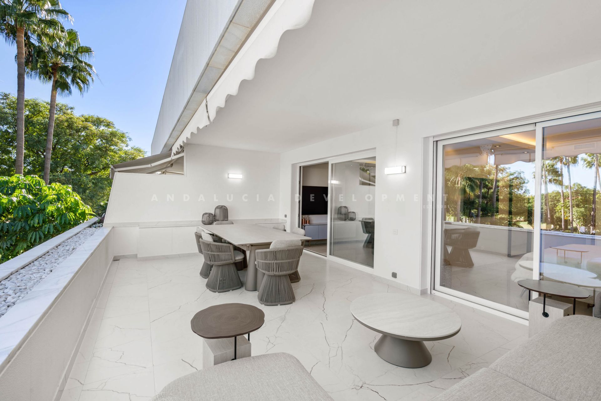 del Sol. From the terrace, you can admire panoramic views of the golf course, tropical gardens and the pool, creating an exclusive and relaxing setting. The apartment is delivered fully furnished and equipped with a modern, functional kitchen, utility room, fitted wardrobes and marble floors. Additional features include air conditioning, double glazing, reinforced door and security camera system, ensuring comfort and safety at all