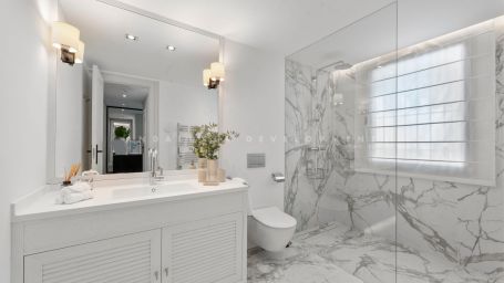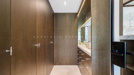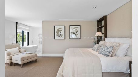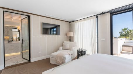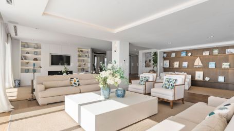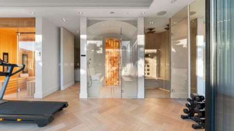 Luxurious family home located in the prestigious Los Naranjos area of Nueva Andalucia. As you enter the property, you are greeted by a spacious open-plan living area that seamlessly blends indoor and outdoor living. The living space with heated wooden floors opens onto a generous pool area, complete with an outdoor fireplace creating the perfect ambiance for outdoor gatherings. The heated swimming pool invites you to take a refreshing dip any time of the year. The main level of the home features three well-appointed bedrooms, offering comfort and privacy for the entire family. Additionally, there is an office space for those who need to work from home and a separate TV room where the family can unwind and enjoy movie nights together.