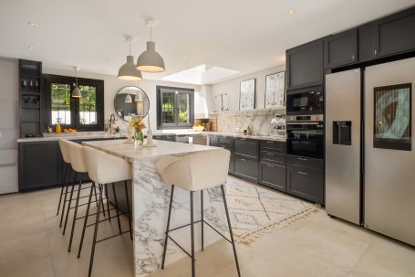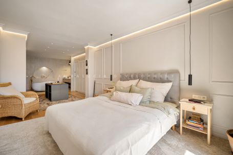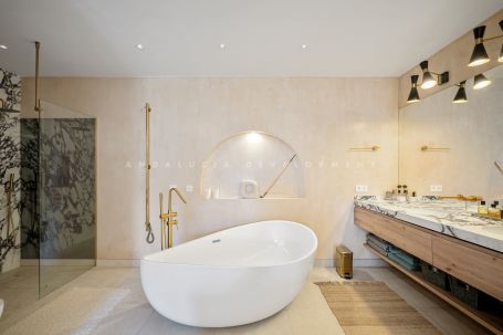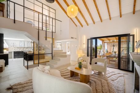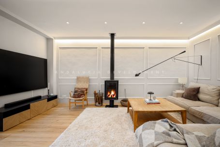 Andalusian Charm Meets Nordic Elegance on the Golden Mile. Nestled in the prestigious residential area of Marbella’s Golden Mile, this beautifully newly renovated Andalusian-style townhouse seamlessly blends traditional architecture with contemporary Nordic interiors, offering a unique combination of charm, comfort and functionality. The property welcomes you through a cozy porch entrance, leading into a warm and inviting living room with a fireplace, a guest toilet and a modern open-plan kitchen with a spacious dining area. The entire main floor opens out to an expansive south-facing terrace featuring a dining area, built-in BBQ and views of the Mediterranean Sea—perfect for year-round entertaining.