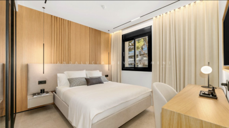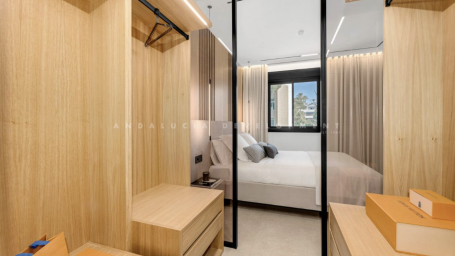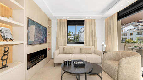 Experience luxury living at its finest in this meticulously designed two-bedroom apartment, located in the prestigious Edificio Trebol in Marbella. Perfectly blending modern elegance with unparalleled comfort, this home boasts high-end finishes and exceptional attention to detail. Nestled in a serene yet central location, it provides effortless access to Marbella’s stunning beaches, upscale dining, and vibrant surroundings, making it the ultimate choice for discerning buyers or investors. Step into a welcoming hallway adorned with custom wood-paneled walls, sleek integrated storage solutions, and a stylish illuminated round mirror, hinting at the elegance that unfolds throughout the home. The open-plan living area is flooded with natural light, thanks to floor-to-ceiling windows that frame tranquil garden views. Featuring soft neutral tones, refined wood accents, and ambient lighting, the living space includes bespoke shelving, a built-in TV unit, and a sophisticated bioethanol fireplace. The adjacent dining area, complemented by a modern light fixture, seamlessly transitions to a state-of-the-art kitchen outfitted with hidden cabinetry, premium built-in appliances, and minimalist design. Both bedrooms are designed to be tranquil retreats, with rich textured wood paneling, custom upholstered headboards, and chic pendant lighting. The master suite features an en-suite walk-in wardrobe with smoked glass doors, illuminated shelving, and impeccable storage solutions. The bathrooms are a haven of modern luxury, boasting textured natural stone walls, premium black fixtures, and striking vessel sinks, marrying functionality with style. The expansive wraparound terrace extends the living space outdoors, offering multiple seating and dining areas surrounded by lush greenery—ideal for entertaining or unwinding in privacy. Residents also enjoy access to beautifully landscaped communal gardens and a sparkling swimming pool, creating a tranquil sanctuary within this exclusive community. Designed for a contemporary lifestyle, this apartment features advanced smart home controls, ambient LED lighting, and high-quality materials throughout, ensuring a perfect blend of sophistication and practicality. Located in a sought-after area, this residence combines modern living with proximity to Marbella’s best attractions, making it an exceptional opportunity for a refined lifestyle or a lucrative investment.