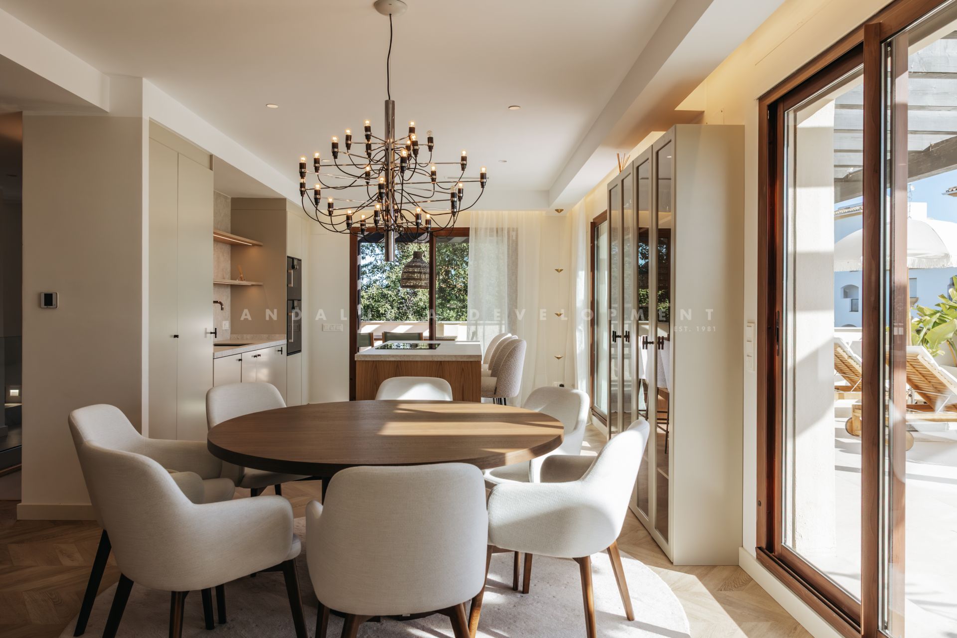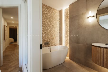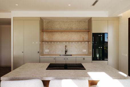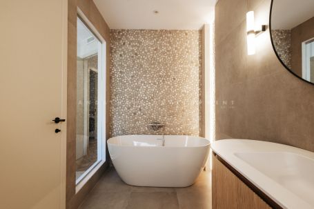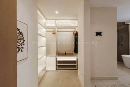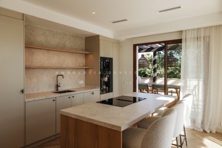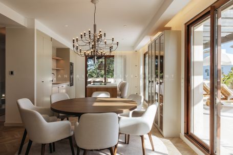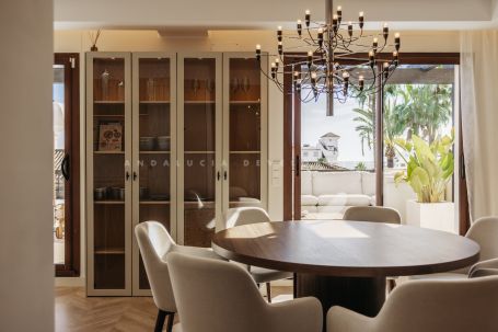 An exceptional triplex penthouse located within the sought-after and exclusive development of La Medina de Banus in Nueva Andalucía. This unique residence seamlessly combines the space and privacy of a villa with the convenience of apartment living, elegantly distributed across three exclusive levels. The main level serves as the natural heart of the home. Here you are welcomed by a stylish family room featuring a fully fitted Ballingslöv kitchen, equipped throughout with premium Gaggenau appliances. The open and elegant layout connects the kitchen, living, and dining areas in perfect harmony, complemented by a custom build professional level, 2 zone wine fridges. This level also hosts a luxurious master suite with a private terrace and a gym. From here, you step directly onto a generous terrace offering spectacular sea and mountain views, complete with a Scandinavian outdoor kitchen, pizza oven, and BBQ, ideal for entertaining and sunset dining.