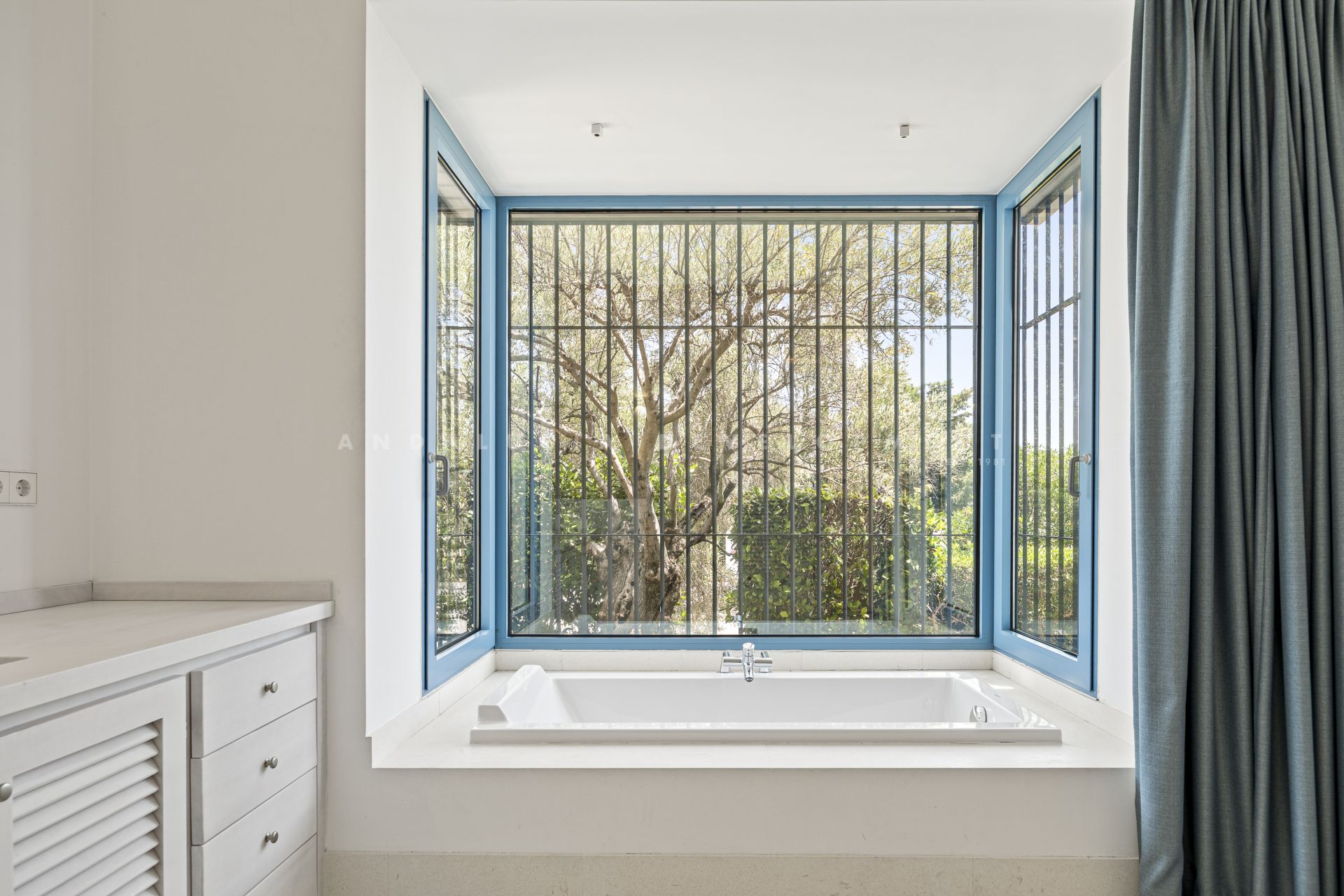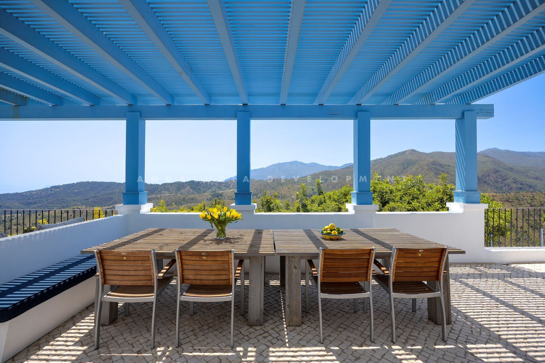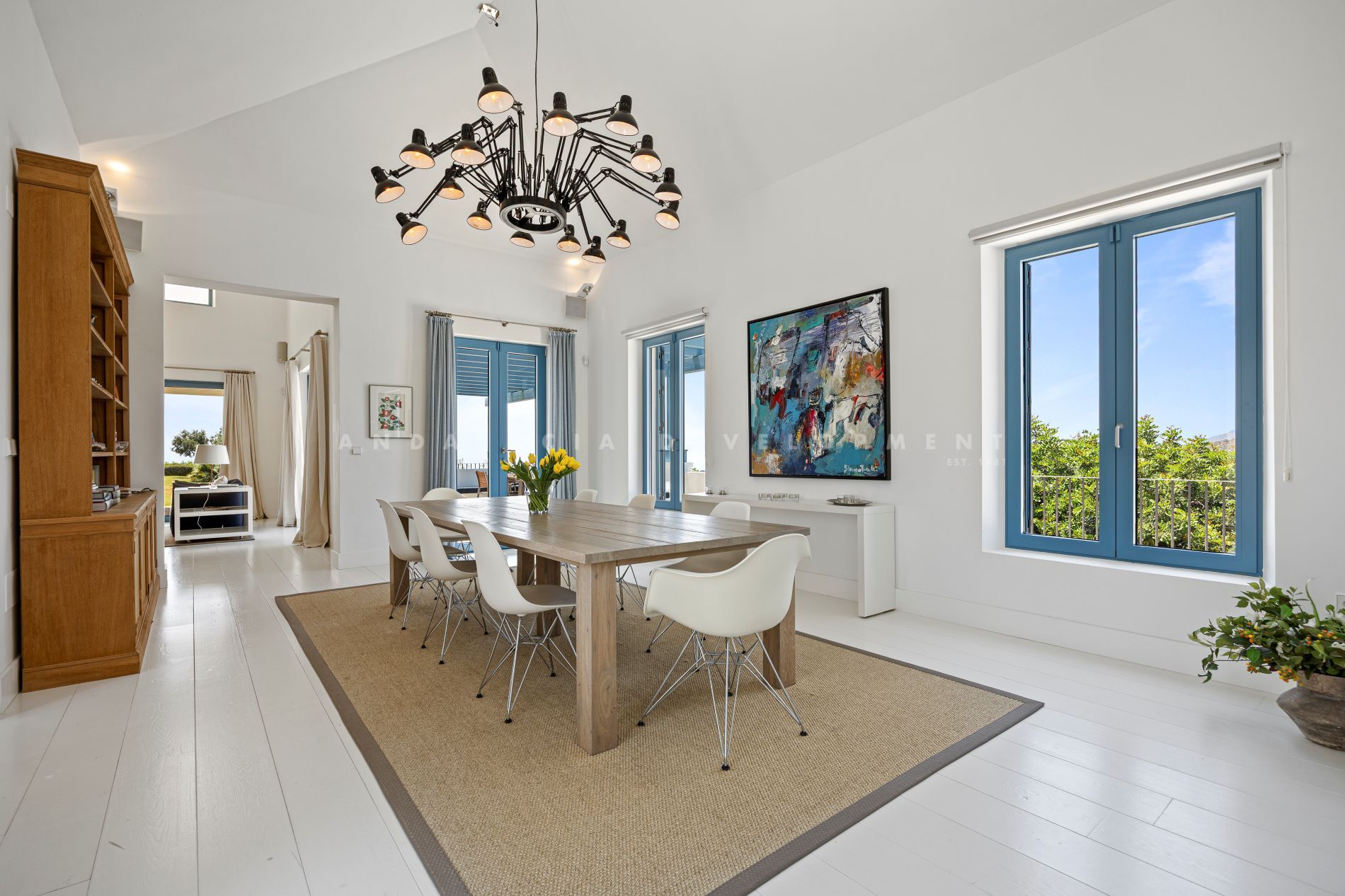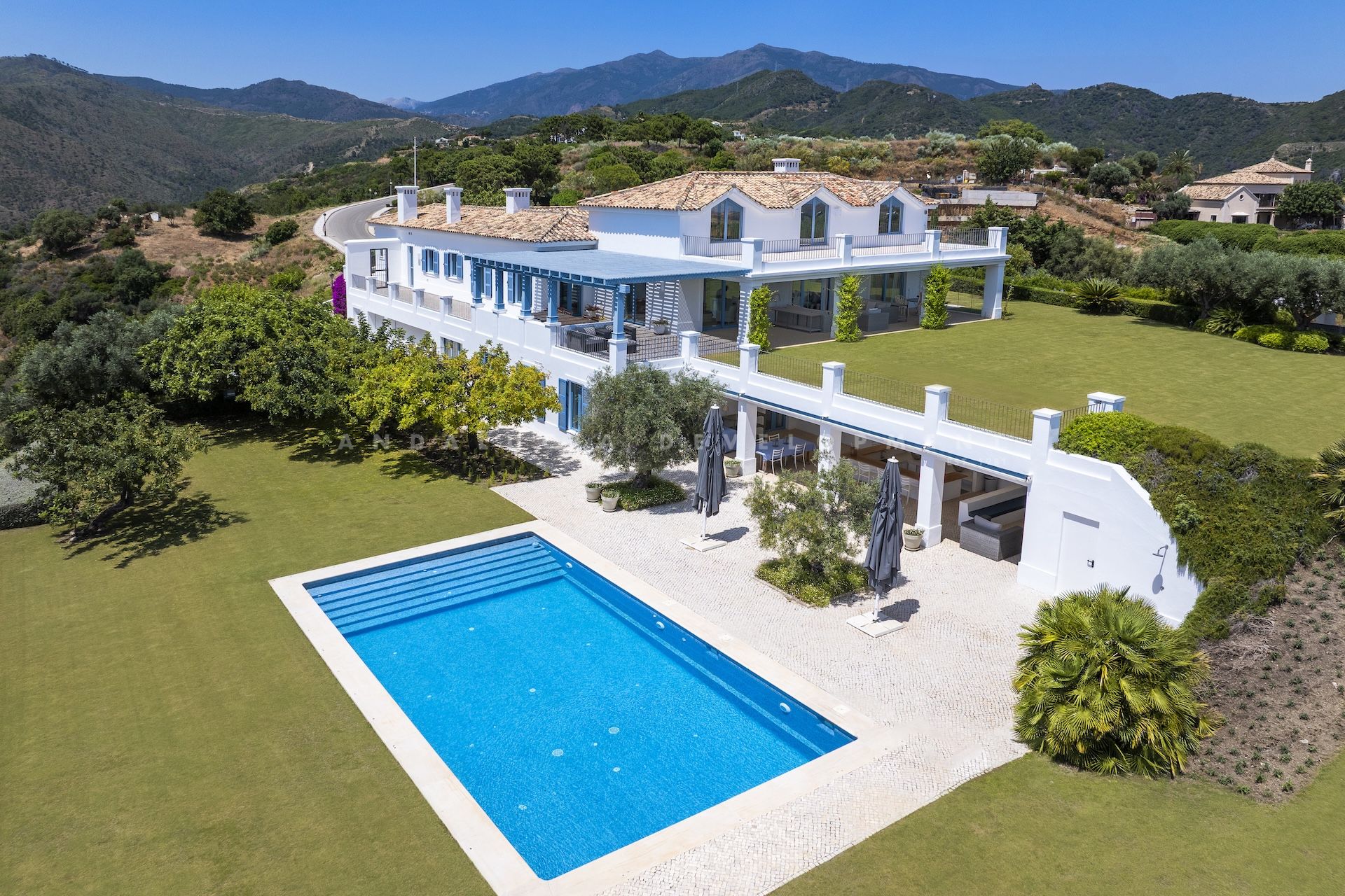 Perched on a rare flat double plot spanning 6.950m2 within the exclusive and secure enclave of Monte Mayor, this cortijo, style villa is a true andalucian sanctuary. Accessed via a 150meter private driveway, the property immediately impresses with its authentic charm, sense of privacy, and sweeping views of the sea and surrounding mountains. Framed by mature pine and olive trees, the estate blends effortlessly into its natural surroundings. Each room and terrace offers a unique and elevated view, wether it´s the glistening Mediterranean, the rugged contours of the mountain foothills, or the beautifully landscaped andalusian gardens. With nearly 700m2 of south-facing interior space, the home is thoughtfully designed for relaxed living and entertaining. Five en-suite bedrooms, expandable to six, are complemented by bright open-plan living areas, a home cinema, and a games room. Outdoor spaces feature a poolside bar, barbecue area, and expansive terraces for year-round enjoyment. The architecture reflects classic andalusian style, with a romantic central patio, whitewashed walls, blue shutters, and a layout that balances family comfort with refined hosting areas. From breakfast in sunlit spaces to shaded afternoon retreats, sunset drinks on the terrace, and dinners under the stars, every part of the home is designed to be enjoyed. Elevated above the bustle of the coast, it offers a peaceful sanctuary close to all the amenities of the Costa del Sol. This is more than a home, it´s an immersion in the natural beauty and traditional elegance of the tranquil andalusian lifestyle.