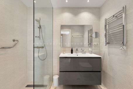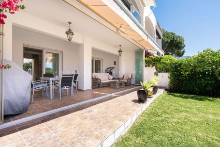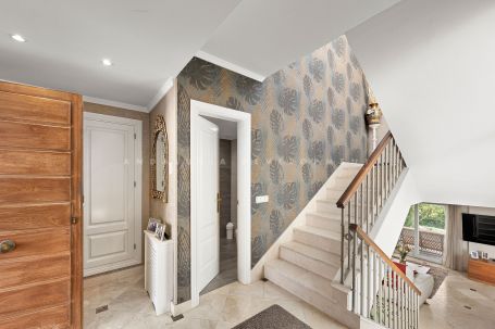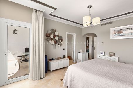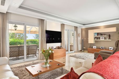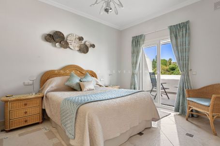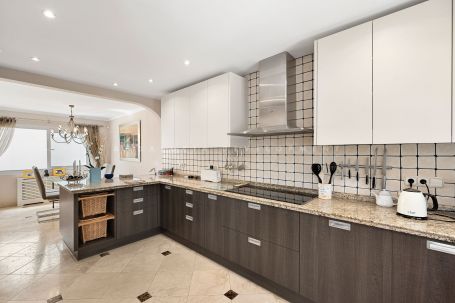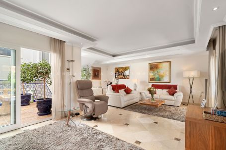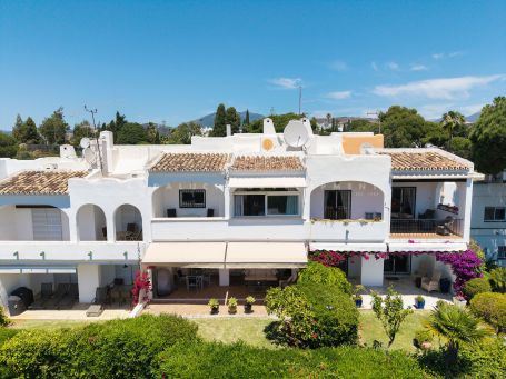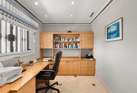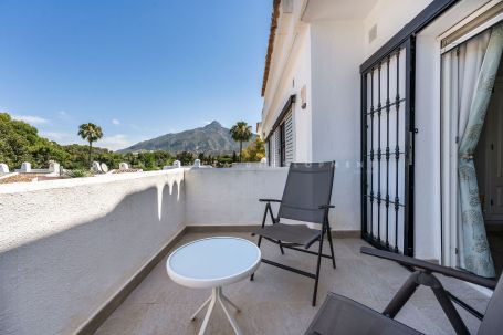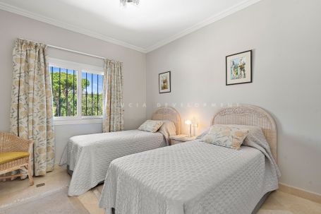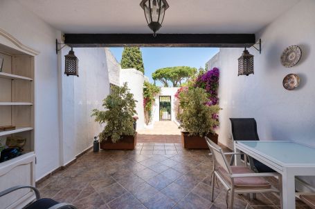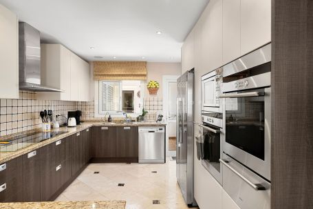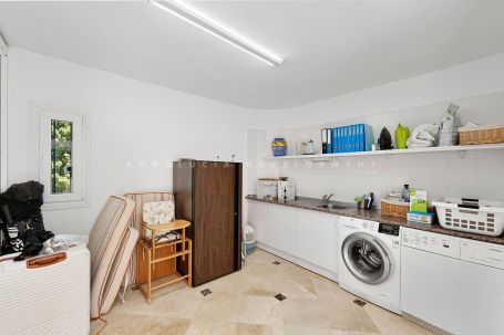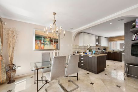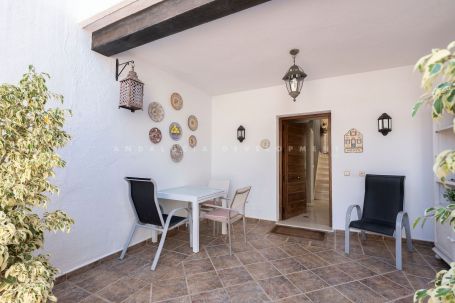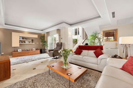 A large townhouse located in the popular urbanisation of La Niña, Aloha Golf in Nueva Andalucia. The entrance has a nice feeling of privacy, almost like a villa that takes you to the hall of the property. From here you enter to the large family kitchen with a generous dining area and with all applainces you could ask for, from here you have acces to a patio that leads you into what is today the laundry and extra storage area ( could be converted into a 4th bedroom) . Half a floor up you have the master suite with its own office, large walking wardrobe and bathroom suite leading out onto a private terrace. Another half a floor up you have the 2 guest bedrooms sharing a family bathroom. The livingroom is situated on the groundfloor with a spacious glassed in terrace with direct access to the garden, the light "shaft" that goes through the property gives plenty of light and character. The house was completely reformed in 2008 with the bathrooms being re-fitted in 2022. A very classy property in a priviliged area that has to be seen to fully appreciated.