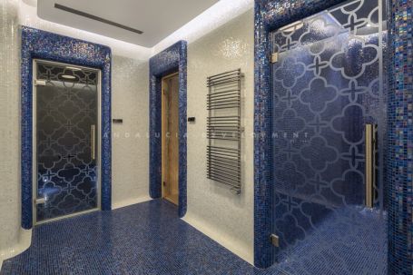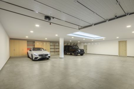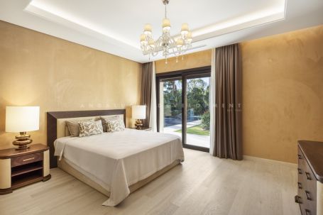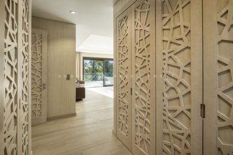 Step into the epitome of luxury with this frontline golf Villa in the heart of Nueva Andalucia.  Positioned on a generous corner plot, the property offers stunning views of the golf course and La Concha mountain.  Surrounded by lush greenery, it provides a private retreat, accentuated by a grand entrance with captivating landscaping and a private driveway leading to a spacious garage for up to 10 cars. The outdoor spaces are an oasis, featuring generous chill-out areas, alfresco dining spaces and a two-tiered garden connected by exterior stairs with LED lights.  The private infinity pool, adorned with deep blue tiles, adds a touch of opulence. Inside, the refined interior design showcases a seamless transition between indoor and outdoor spaces through glass sliding doors.  The grand living area boasts fine furniture and fixtures, complemented by wooden accents that bring soothing earthy tones.  The open-plan dining and kitchen area, characterised by high ceilings with wooden beams, offers a spacious and functional environment.  The kitchen is a chef's dream with plenty of counter and storage space, a central island with seating and state-of-the-art integrated appliances.  The property's connectivity is enhanced by floors linked via a lift, ensuring convenience throughout.  Each room exudes elegance, with refined furnishings maximizing comfort.  The extravagant master bedroom, featuring direct terrace access and expansive views, includes stunning wooden cabinet details for wardrobe space.  The master bathroom is a luxurious haven with elegant tile details, a stand-alone tub, a double vanity with LED lighting fixtures and a spacious shower.  To complete the experience, the property indulges in a sumptuous spa, adorned with deep blue tiles, offering a Hammam and Turkish bath—a true retreat within the comforts of home.  This villa is not just a residence; it's a sophisticated statement of refined living.