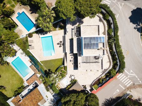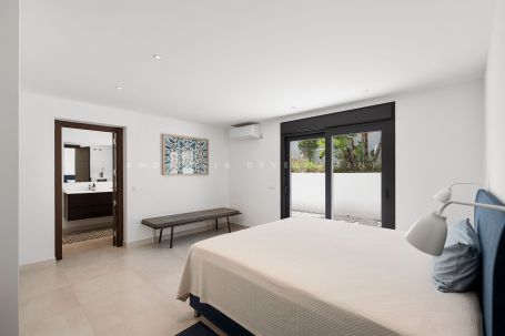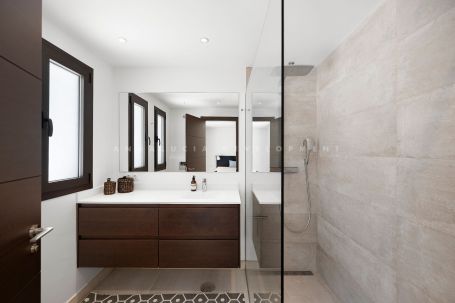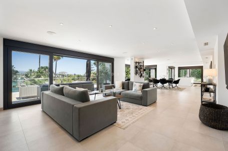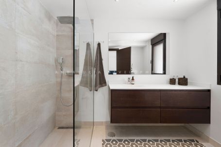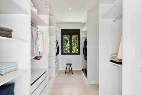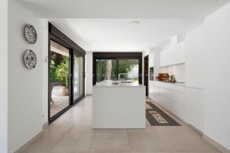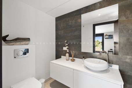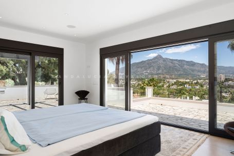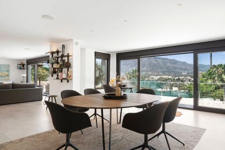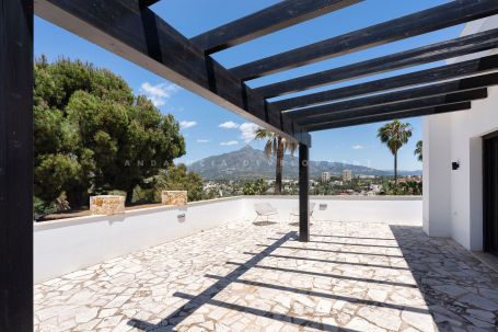 A contemporary villa located in the heart of Nueva Andalucia, within walking distance to amenities including supermarkets, restaurants and Centro Plaza Commercial Centre and just few minutes’ drive to the best golf courses in the area. This property has a South-East orientation with sun all day on the pool and stunning views of La Concha Mountain and towards the sea. Built over three floors, the main level features an open-plan design with spacious living areas leading directly out onto the large terrace with various seated areas ideal for entertaining, two guest bedrooms suites and a guest toilet. Upstairs is dedicated to the large master bedroom suite with dressing area and private terrace. On the lower level there is a further guest bedroom with ensuite bathroom, guest toilet and games room. The garden area is easily maintained and carport for up to 3 cars. This well-located property has a great potential for long or short term-rent and can be not only your permanent or holiday residence, but a good investment opportunity as well.
