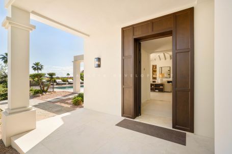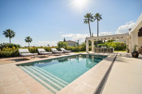 A beautifully reimagined single-level villa nestled in the heart of Nueva Andalucía, just minutes from the renowned Los Naranjos Golf Course. Designed and developed by Casas Fintech, this exquisite 4-bedroom home merges Mediterranean elegance with contemporary comforts. Set on a lush, elevated plot, the villa offers privacy, tranquility, and breathtaking views across the valley to the sea, all while being moments away from Marbella’s best golf, dining, and beach experiences. Step inside to discover a calming palette of natural tones, soaring vaulted ceilings, and an open-plan living space that seamlessly flows into a modern kitchen and dining area. Each detail has been carefully curated, from the sleek finishes and custom furnishings to the high-spec appliances and ambient lighting. Floor-to-ceiling glass doors invite natural light throughout and open onto a generous terrace complete with a sunken lounge, outdoor kitchen, and a striking infinity-edge pool that appears to float above the landscape.