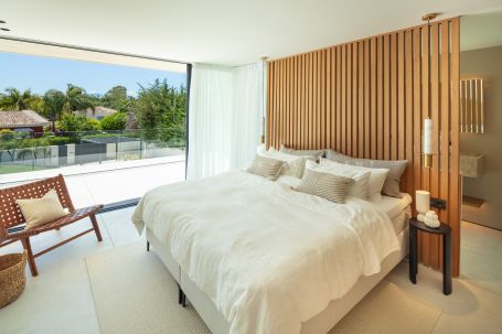 An exceptional modern villa located in the heart of Nueva Andalucía, offering a seamless blend of style, luxury and comfort. Set on a generous plot of 1,038m², this beautifully crafted home boasts four spacious bedrooms and four elegant bathrooms, all designed with meticulous attention to detail. The interiors are flooded with natural light thanks to expansive floor-to-ceiling windows, highlighting the sophisticated neutral palette, high-end finishes, and open-plan living spaces that create a warm, inviting atmosphere. Step inside to discover a state-of-the-art kitchen, a refined dining area, and a cozy lounge, all framed by contemporary architectural lines and tasteful décor. The principal bedroom suite is a true sanctuary, featuring a spa-like en-suite and views to the landscaped gardens. A unique highlight is the seamless transition between indoor and outdoor living, with large sliding doors opening onto a private oasis complete with a spectacular pool, lush green garden, and stylish chill-out zones – perfect for entertaining or relaxing under the Mediterranean sun.