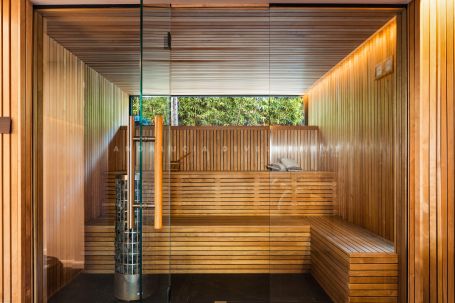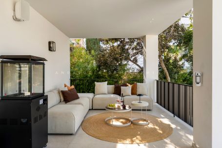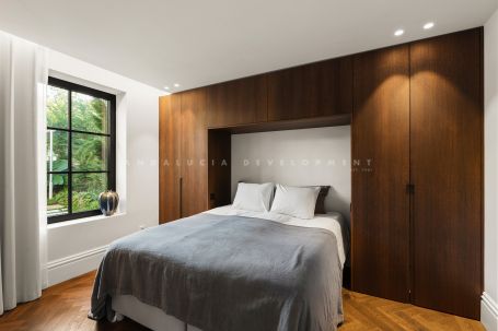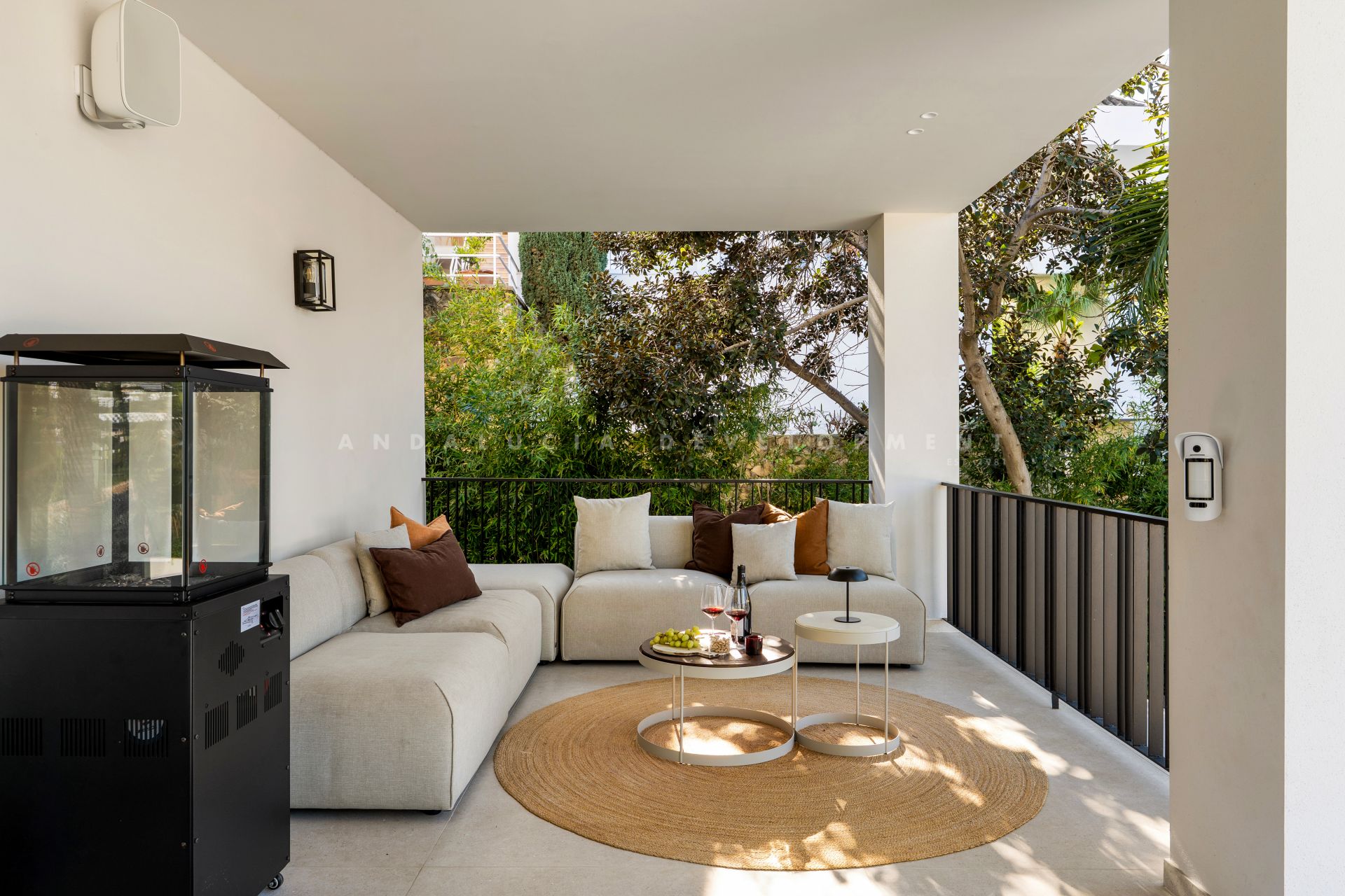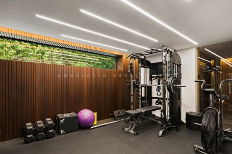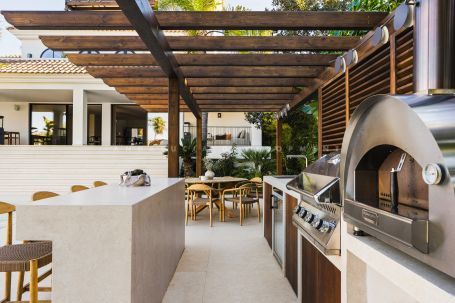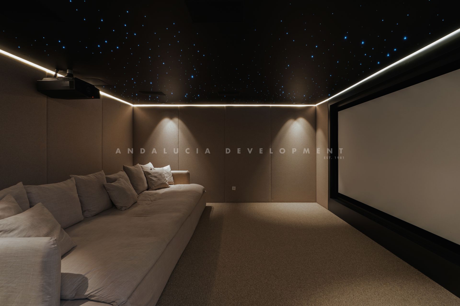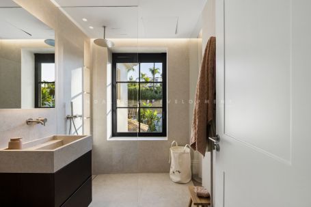 Introducing this exceptional family residence, set within one of the most sought-after gated communities in Los Naranjos, Nueva Andalucía, just moments from one of Marbella’s finest golf courses. Recently renovated to the highest standards, this home presents a seamless blend of refined living, timeless elegance, and modern functionality. Every element has been meticulously considered, resulting in a property that exudes quality, character, and understated sophistication, perfectly suited to contemporary family life. Positioned on a flat, west facing plot, the home enjoys an abundance of natural light throughout the day, along with open, far reaching views. Its elevated setting enhances the sense of privacy and tranquillity, while offering vistas across to Los Naranjos Golf Course, stretching towards the distant mountain range beneath expansive blue skies. Upon arrival, you are welcomed by a beautifully landscaped Mediterranean garden, where a thoughtfully integrated water feature creates an immediate sense of calm and serenity. The main living level has been intelligently designed with an open-plan layout, where the entrance hall flows effortlessly into the living, dining, and kitchen areas creating a harmonious and inviting space for both everyday living and entertaining. The kitchen is fitted with top of the line Miele appliances and complemented by a stylish dry bar. A separate, concealed chef’s kitchen/scullery provides a highly practical extension, ideal for hosting and preparing meals while maintaining the elegance of the main living space. The home offers six bedrooms in total, thoughtfully distributed to suit family living. Five serve as spacious family bedrooms, while the sixth is designed as independent staff or nanny accommodation, complete with its own kitchenette, bathroom, and private access. Additional features include a dedicated home office, a fully equipped wellness level with gym, sauna, and indoor jacuzzi/plunge pool, as well as a superbly soundproofed home cinema. A private closed garage that accommodates one vehicle, complemented by a gated driveway with space for up to four additional cars. Throughout the property, premium finishes define the interiors, from herringbone wood flooring and bespoke carpentry to carefully selected natural stone and underfloor heating. A state-of-the-art security system further enhances the sense of comfort and peace of mind in additional to the secure community. The outdoor areas have been designed to embrace a true indoor-outdoor lifestyle. An elegant outdoor kitchen and bar area accompanying a magnificent heated saltwater swimming pool, complete with a mirrored overflow edge that creates a striking visual effect. This is a home that perfectly balances classic contemporary architecture with modern yet timeless interiors, offering not only a prime location and security, but a lifestyle of comfort, beauty, and effortless sophistication.