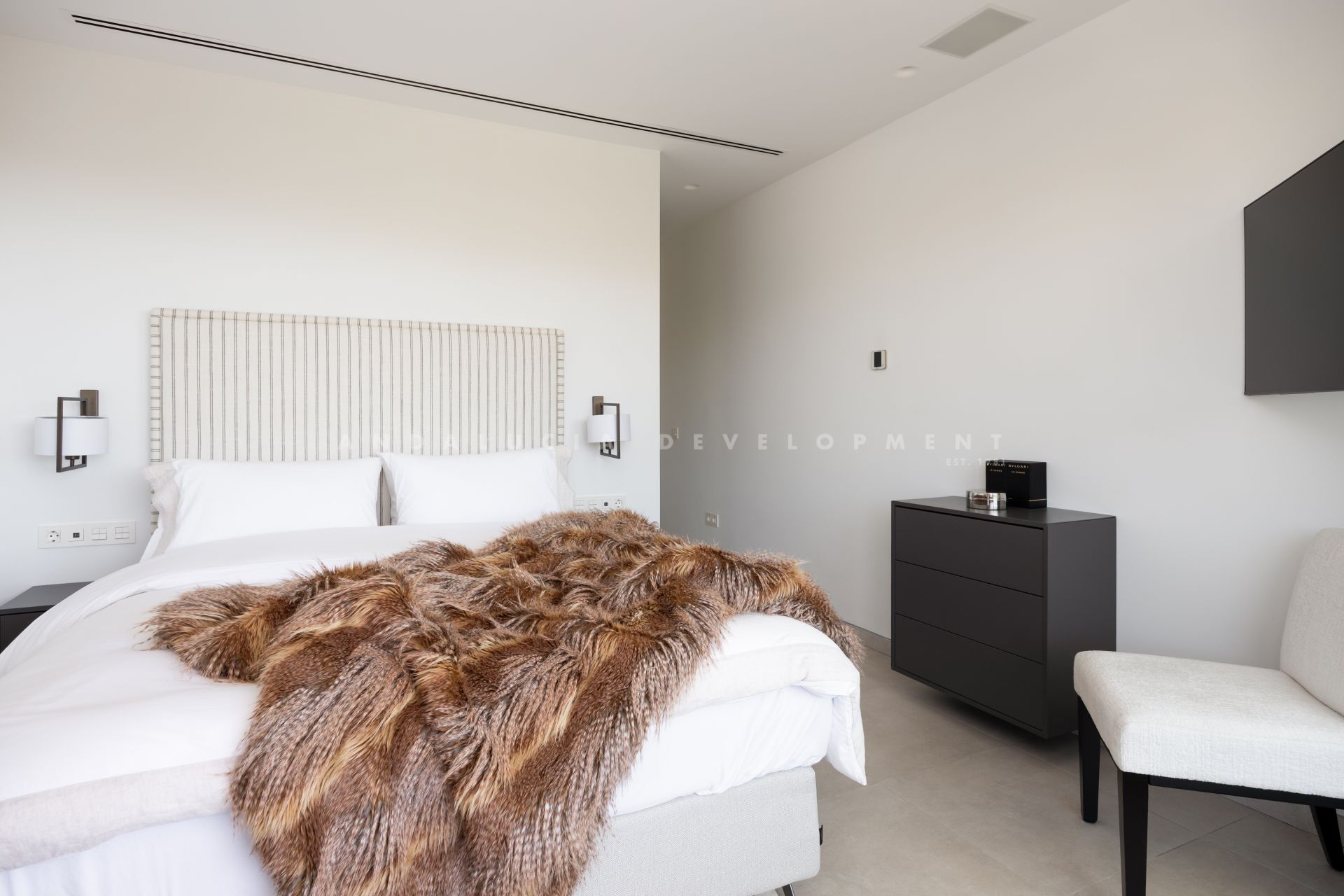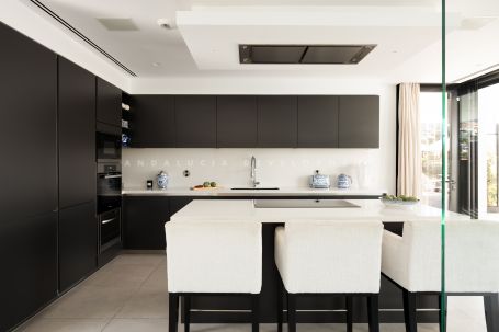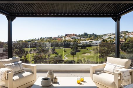 Contemporary villa set in the heart of Nueva Andalucía’s prestigious Golf Valley, enjoying a privileged west-facing orientation overlooking the renowned Los Naranjos Golf Course. Distributed across three levels, the residence captures sweeping views of manicured fairways and the surrounding landscape, creating a serene and sophisticated atmosphere. Expansive terraces open onto an infinity pool and elegant outdoor living areas, designed for effortless entertaining against a backdrop of greenery. Inside, floor-to-ceiling windows bathe the interiors in natural light, enhancing the seamless flow between refined living spaces and the outdoors. The open-plan kitchen, appointed with premium Miele appliances, combines sleek design with everyday functionality. Four spacious bedrooms, including a tranquil master suite with direct terrace access, offer comfort and privacy, while a dedicated entertainment level with a wine bodega adds an exclusive touch. A private garage and driveway complete this exceptional home, where contemporary design meets the timeless appeal of Marbella’s most sought-after golf setting.