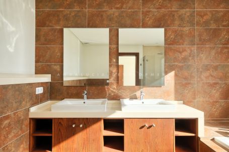 New built contemporary 4 bedroom quality villa in Puerto del Capitan. South to west facing with sea & mountain views. Main floor: Living and dining area with high ceilings and fireplace and direct access to the garden and pool area. Fully fitted kitchen with Bosch appliances. Two guest bedrooms sharing one bathroom. Guest toilet. First floor: Master bedroom en suite with dressing room, one guest bedroom en suite. Roof terrace. Basement: Laundry area and storage. Gated community. Close to all amenities, less then 10 minutes to the beach, Puerto Banús and San Pedro village.