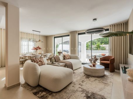 Occupying a privileged corner position within the community, the property enjoys enhanced privacy and abundant natural light. Recently completely renovated it features an open-plan interior, designed with the finest materials, and carefully selected quality furnishings, creating a stunning, comfortable and perfectly balanced modern home. It includes hot and cold air conditioning and underfloor heating throughout, providing additional comfort during the cooler months.