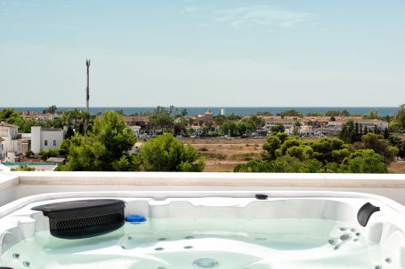 A well located penthouse located in Terrazas del Rodeo close to Puerto Banus, the beach & amenities. Situated on a corner gives this property total privacy and the wrap around terrace enjoys both sea & mountain views. Spacious layout with a large family kitchen as the focal point, from here you access the main terrce with a large outdoor kitchen and dining area plus a jacuzzi facing the sea. The bedrooms are situated away from the living area creating privacy and all with access to the terrace. The property is accessed from the underground parking ( 2-3 cars), there is also a large storage room. The urbanisation has 24 hrs security, several pools, basketball and padel courts.