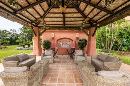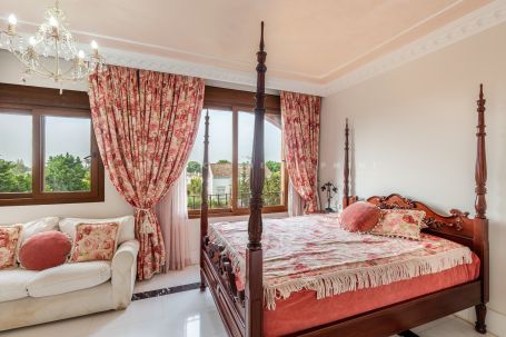 Set within a secure gated community in Guadalmina Baja, this triplex penthouse combines scale, privacy, and direct access to outdoor living. The residence is arranged across three levels and includes private lift entry, a rooftop pool, and several terraces oriented toward the sea and landscaped gardens. The main floor is arranged for both comfort and functionality. High ceilings and full-height windows bring in natural light and connect the interiors to a large wraparound terrace with open views toward the sea and surrounding gardens. A formal dining area sits alongside the double living room and links directly to the terrace. The kitchen is fitted with custom cabinetry, quality appliances, tiled finishes, and well-planned storage. A second outdoor dining area is accessed directly from the kitchen, surrounded by greenery. Four bedroom suites are located on the main level, each with its own private terrace, built-in wardrobes, and en-suite bathrooms. Each bathroom includes a walk-in shower, bathtub, and vanity, finished in materials chosen for durability and ease of maintenance. Upstairs, the primary suite spans the upper floor. It features a large bedroom, walk-through dressing area, and a private terrace with a swimming pool. A covered section of the terrace offers shade and space for outdoor seating or dining, with elevated views of the sea. Additional features include two underground parking spaces and two private storage rooms. The building has only 28 residences, ensuring a quiet setting with 24-hour security and landscaped communal areas, including a pool. The location places the beach, marina, golf courses, and a range of dining options all within walking distance.