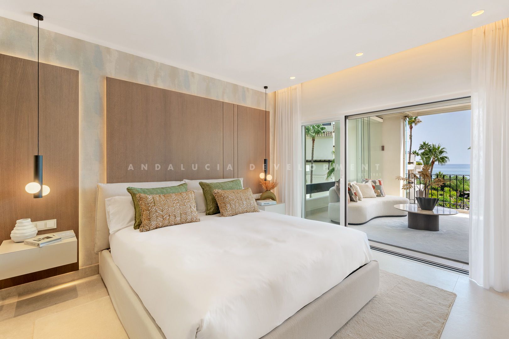 Bahía del Velerín is a prestigious community located between Marbella and Estepona. It boasts a beautiful pool area with a snack bar, lush tropical gardens, and 24/7 security. Set in a prime location, it offers access to one of the region’s finest beaches. This fully renovated apartment offers beautiful views of the surrounding landscape and sea. With underfloor heating and a glass curtain, the balcony extends the lounge area offering more living comfort. The modern design and high-end finishes ensure a stylish and functional living experience in every detail: Storage Room, B&O Sound System, Wine Fridge, Invisible Hob, Electric Fireplace, Thermomix, Hidden Laundry, Laundry Room, Conservatory, Japanese Toilets. The apartment is filled with luxurious touches, including an open-plan designer kitchen with premium German appliances, high-quality flooring, sleek contemporary furniture, an electric fireplace, a Bang & Olufsen sound system, and custom-made wardrobes.