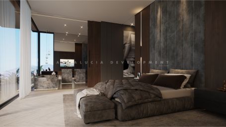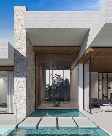 Set within the secure gates of El Herrojo Alto in Benahavís, this brand-new villa offers a contemporary residence designed with both elegance and functionality in mind. Positioned on one of the final elevated plots available in this prestigious enclave, the property captures uninterrupted panoramic views across the coastline and Mediterranean Sea. The architectural concept focuses on seamless indoor-outdoor living. At its core, the villa will feature an infinity-edge pool that opens to wide coastal vistas. An adjacent sunken lounge and outdoor kitchen create a refined setting for open-air dining and gatherings. Subtle water features throughout the exterior design enhance the tranquil ambiance and integrate the home with its natural surroundings. Interior spaces have been planned with precision. Floor-to-ceiling windows in the main living areas and bedrooms invite natural light while framing far-reaching views. The residence will include an indoor pool, private gym, and a dedicated office with separate access—ideal for discreet work or meetings at home.
