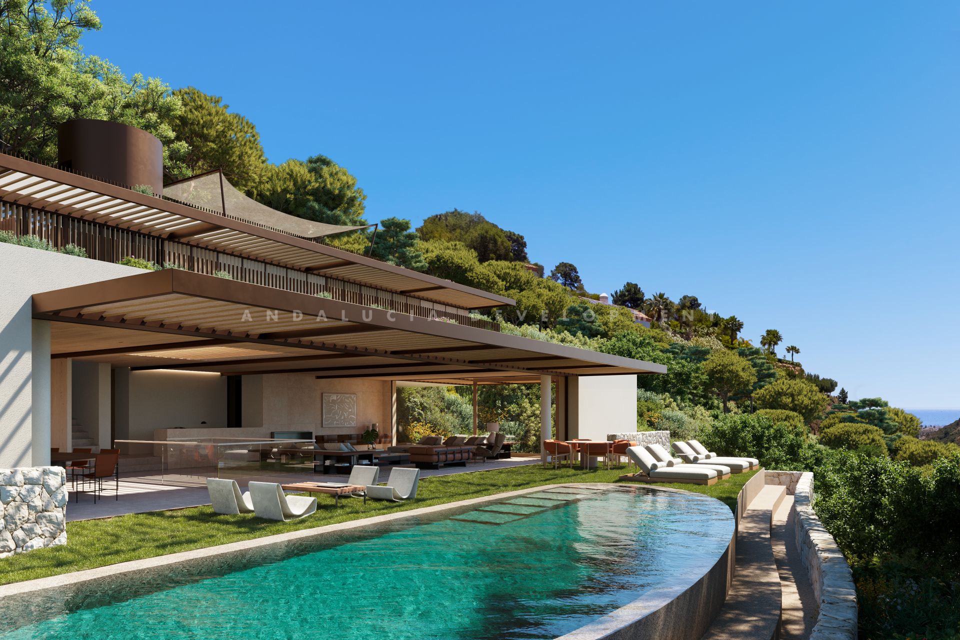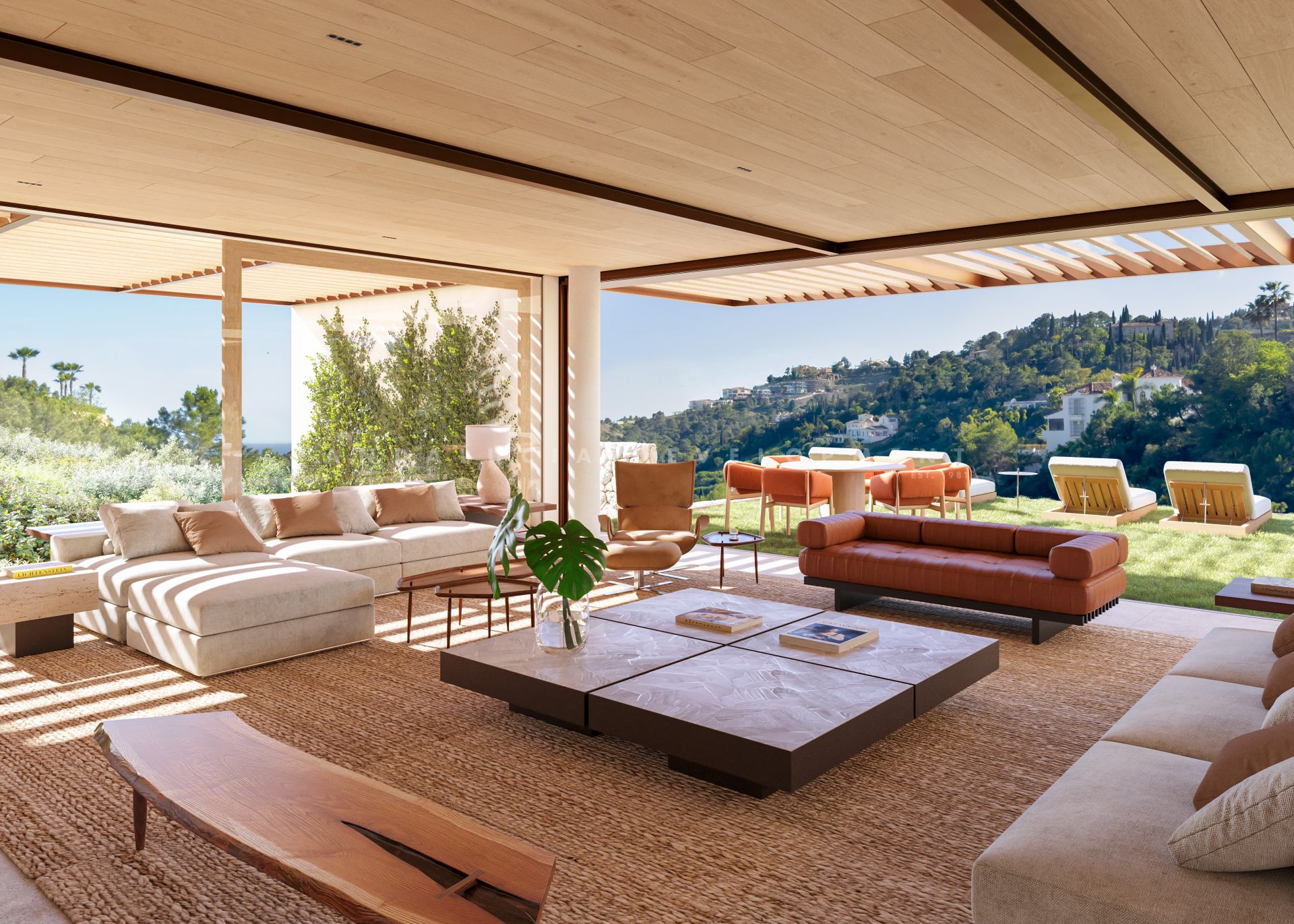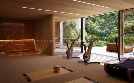 This contemporary luxury villa for sale in El Madroñal offers 4 master bedrooms plus 1 staff or guest suite and 7 bathrooms, with a built area of 587 sqm set on a 3,241 sqm plot, distributed across multiple floors connected by a private lift and enjoying panoramic sea and mountain views, an infinity pool, rooftop solarium, and a four-car garage within a secure gated community. Designed as a high-spec architectural residence, the property combines generous interior volumes with carefully integrated outdoor living spaces, creating a seamless connection between the home and its natural surroundings. Inspired by the architectural philosophy of Arthur Casas, the villa reflects a design approach rooted in harmony with nature. Organic tones, soft lines, and materials have been selected to complement the landscape, allowing the property to feel like a natural extension of its environment. This concept is evident throughout the home, where light, space, and proportion are carefully balanced to create a calm and functional living experience.