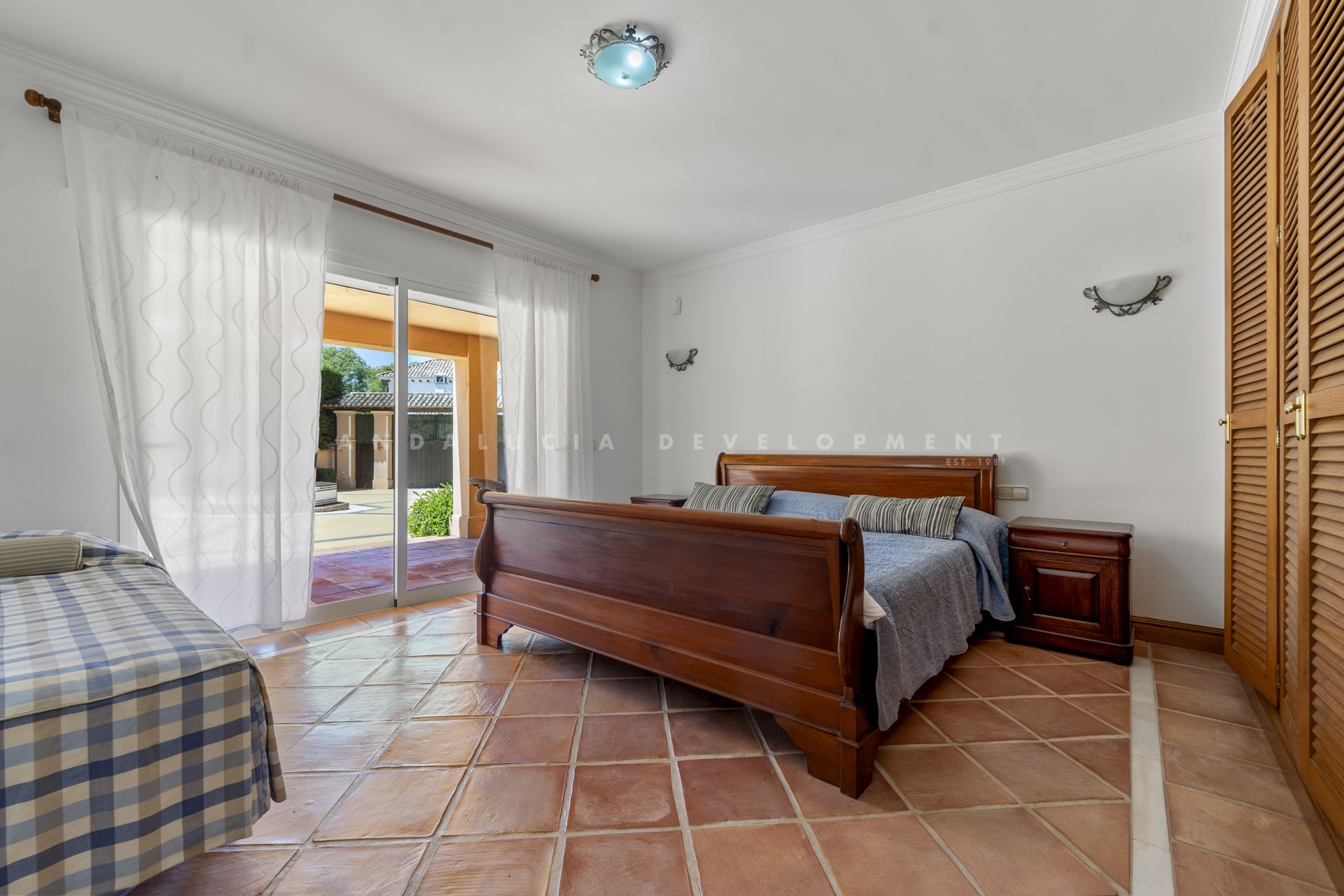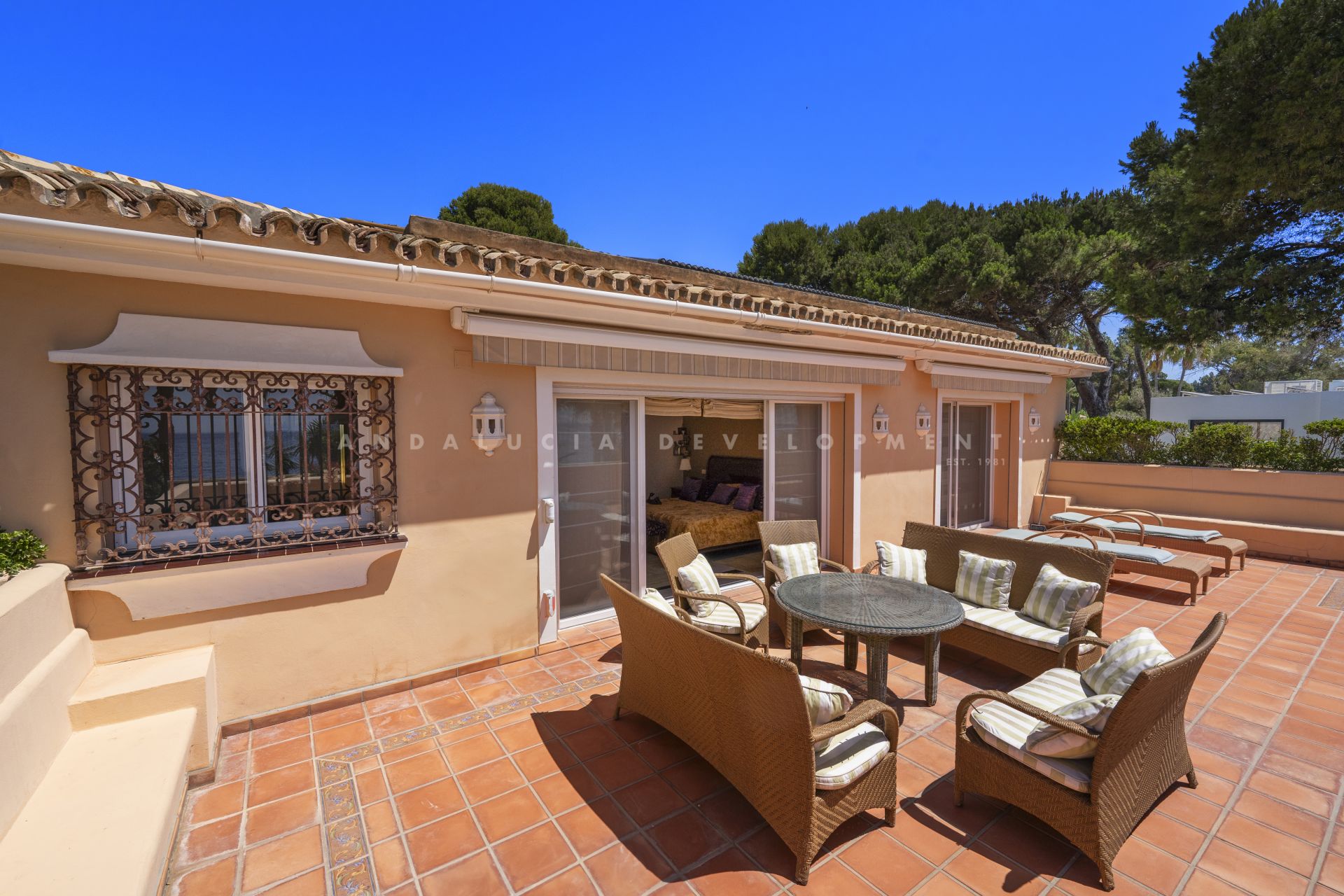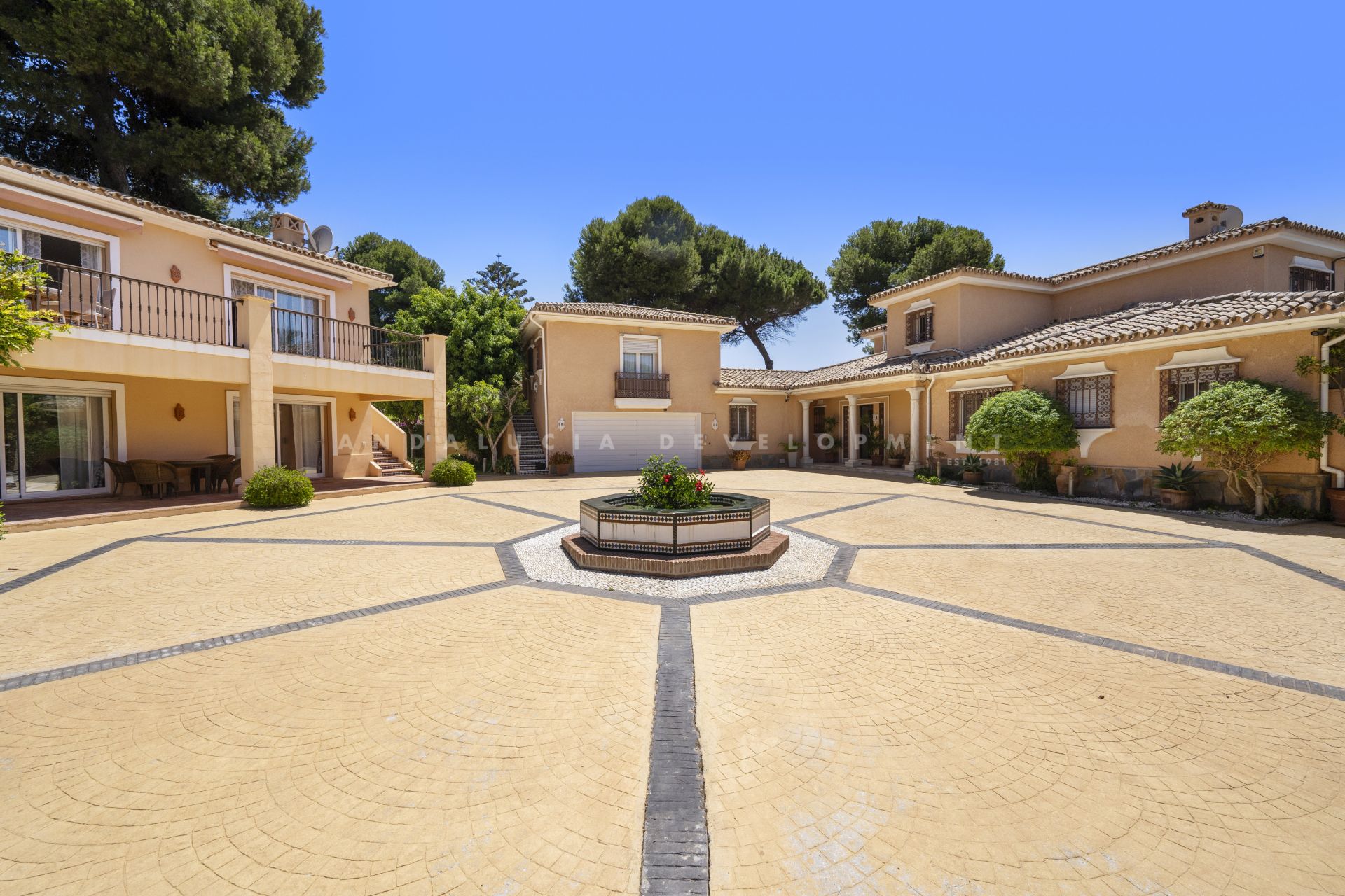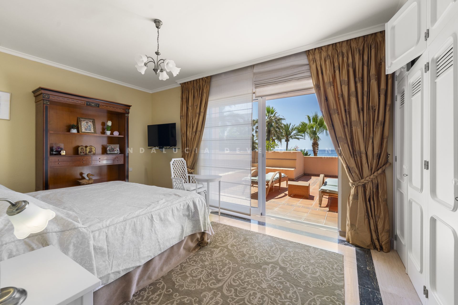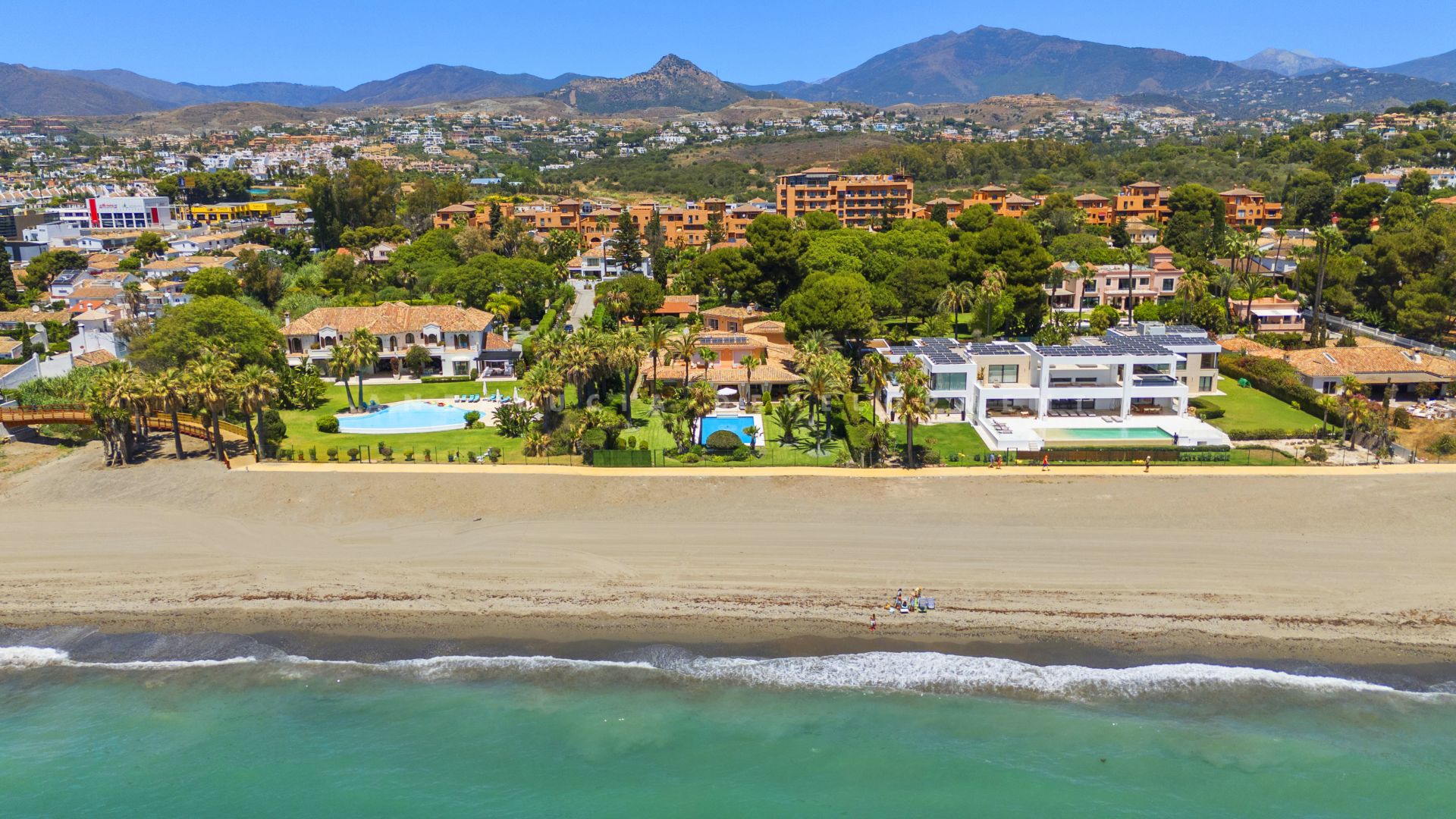 This villa is a grand beachfront estate in Estepona, set on 4,375 m² of manicured grounds. The property includes three elegant buildings, six ensuite bedrooms in the main house, and direct access to one of the finest beaches on the coast. A private gate leads from the gardens and pool straight to the sand, offering unmatched privacy and sea views. Every space in the home opens to lush gardens, terraces, and the shimmering Mediterranean beyond. Inside, light flows through open living areas, a refined dining room, and a spacious kitchen fitted with modern appliances. The design blends natural tones with marble finishes and warm wood. Upstairs, the bedrooms are luxurious and serene, each with marble bathrooms and access to a full-length terrace overlooking the sea. A separate guesthouse and staff apartment add flexibility and comfort for family or visitors. Outdoors, this villa offers space to relax and entertain. The grounds feature a large pool, children’s playground, barbecue area, and fruit trees that fill the air with a gentle citrus scent. A high-end security system and ample parking ensure peace of mind. This is a rare opportunity to own a true beachfront sanctuary that combines privacy, elegance, and timeless Mediterranean living.