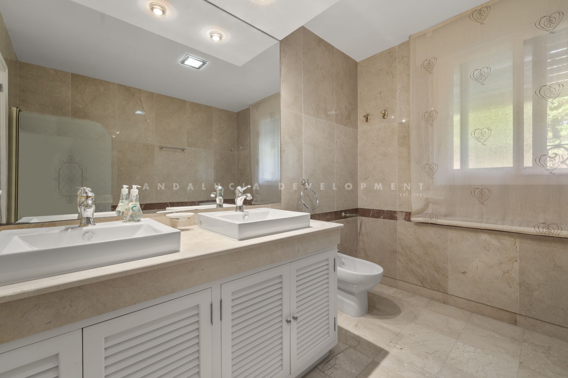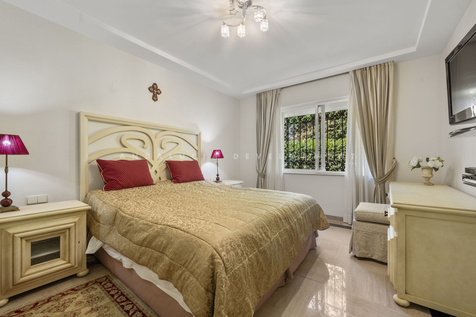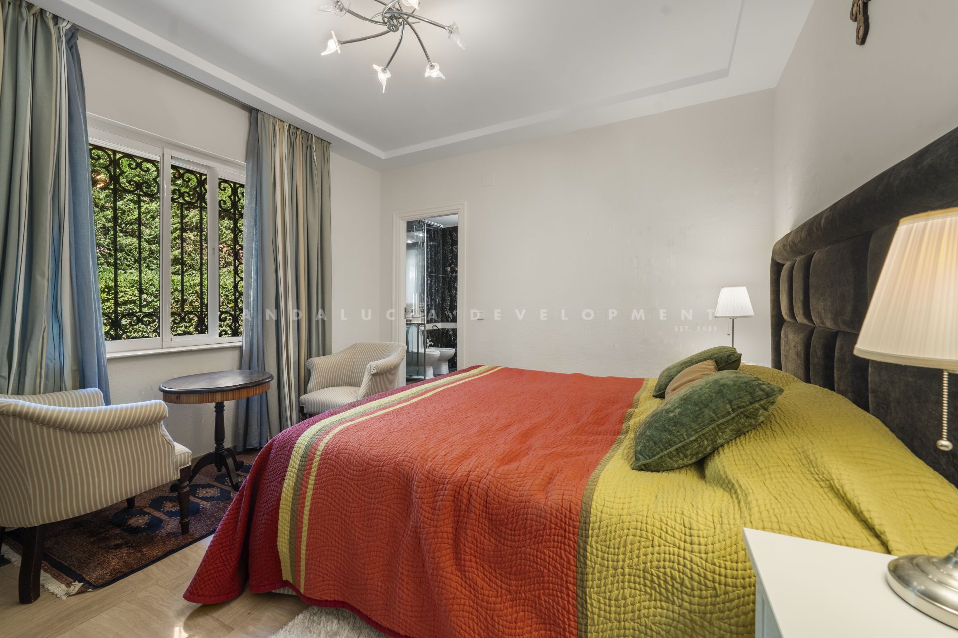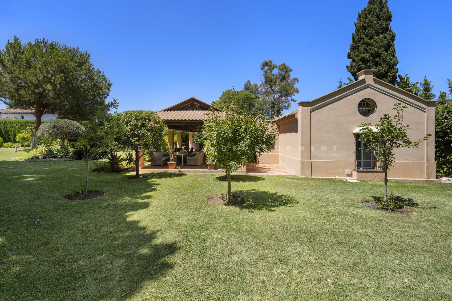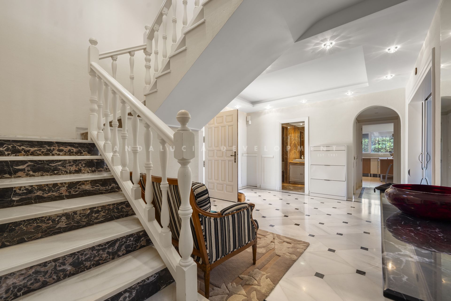 This villa is a grand beachfront estate in Estepona, set on 4,375 m² of manicured grounds. The property includes three elegant buildings, six ensuite bedrooms in the main house, and direct access to one of the finest beaches on the coast. A private gate leads from the gardens and pool straight to the sand, offering unmatched privacy and sea views. Every space in the home opens to lush gardens, terraces, and the shimmering Mediterranean beyond. Inside, light flows through open living areas, a refined dining room, and a spacious kitchen fitted with modern appliances. The design blends natural tones with marble finishes and warm wood. Upstairs, the bedrooms are luxurious and serene, each with marble bathrooms and access to a full-length terrace overlooking the sea. A separate guesthouse and staff apartment add flexibility and comfort for family or visitors. Outdoors, this villa offers space to relax and entertain. The grounds feature a large pool, children’s playground, barbecue area, and fruit trees that fill the air with a gentle citrus scent. A high-end security system and ample parking ensure peace of mind. This is a rare opportunity to own a true beachfront sanctuary that combines privacy, elegance, and timeless Mediterranean living.