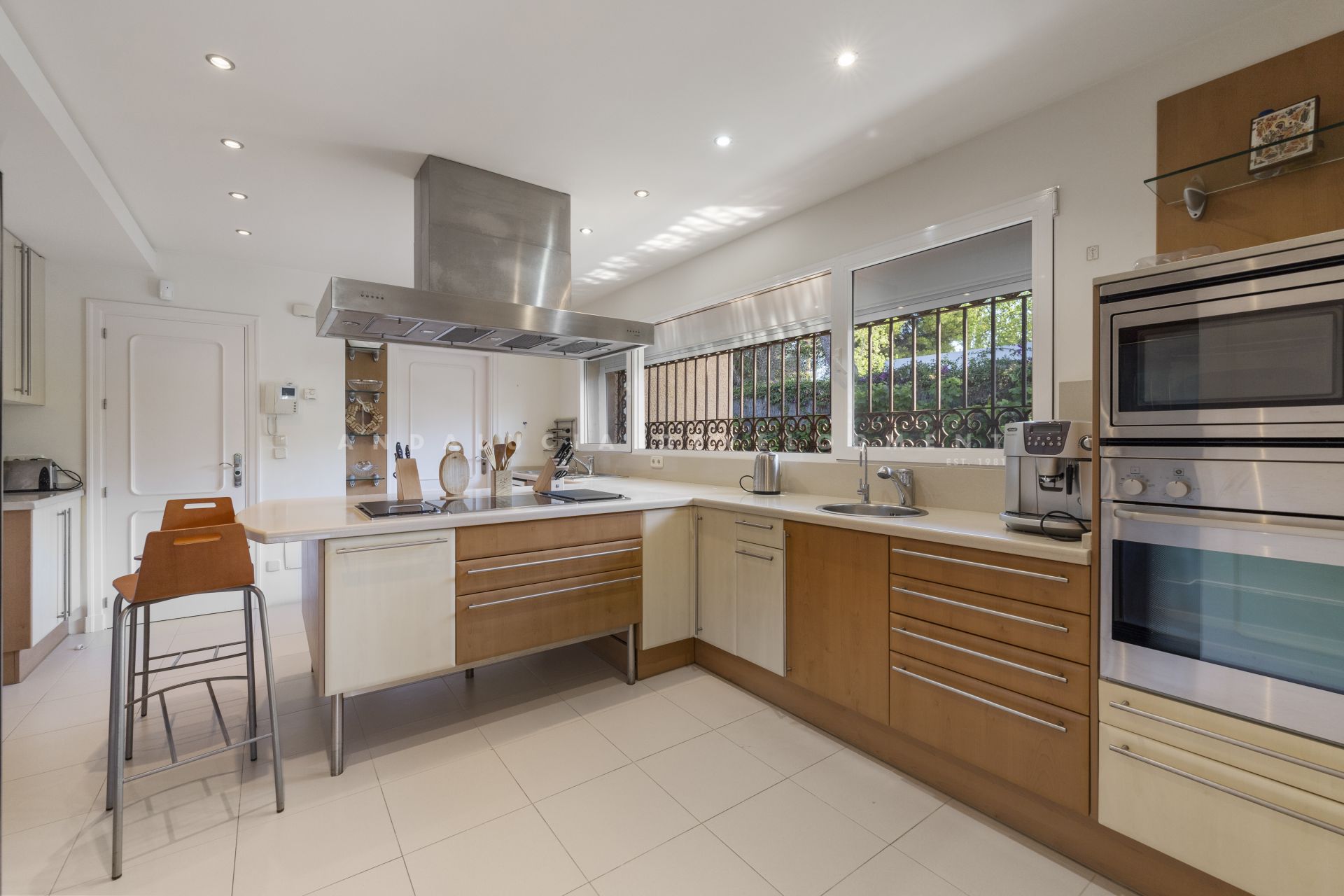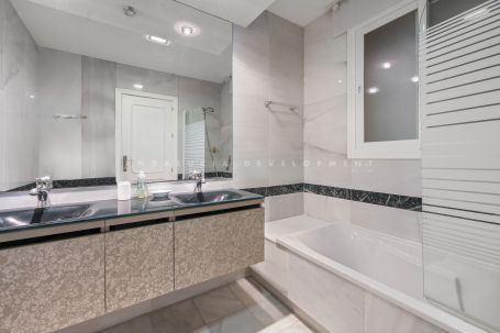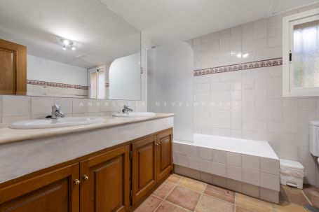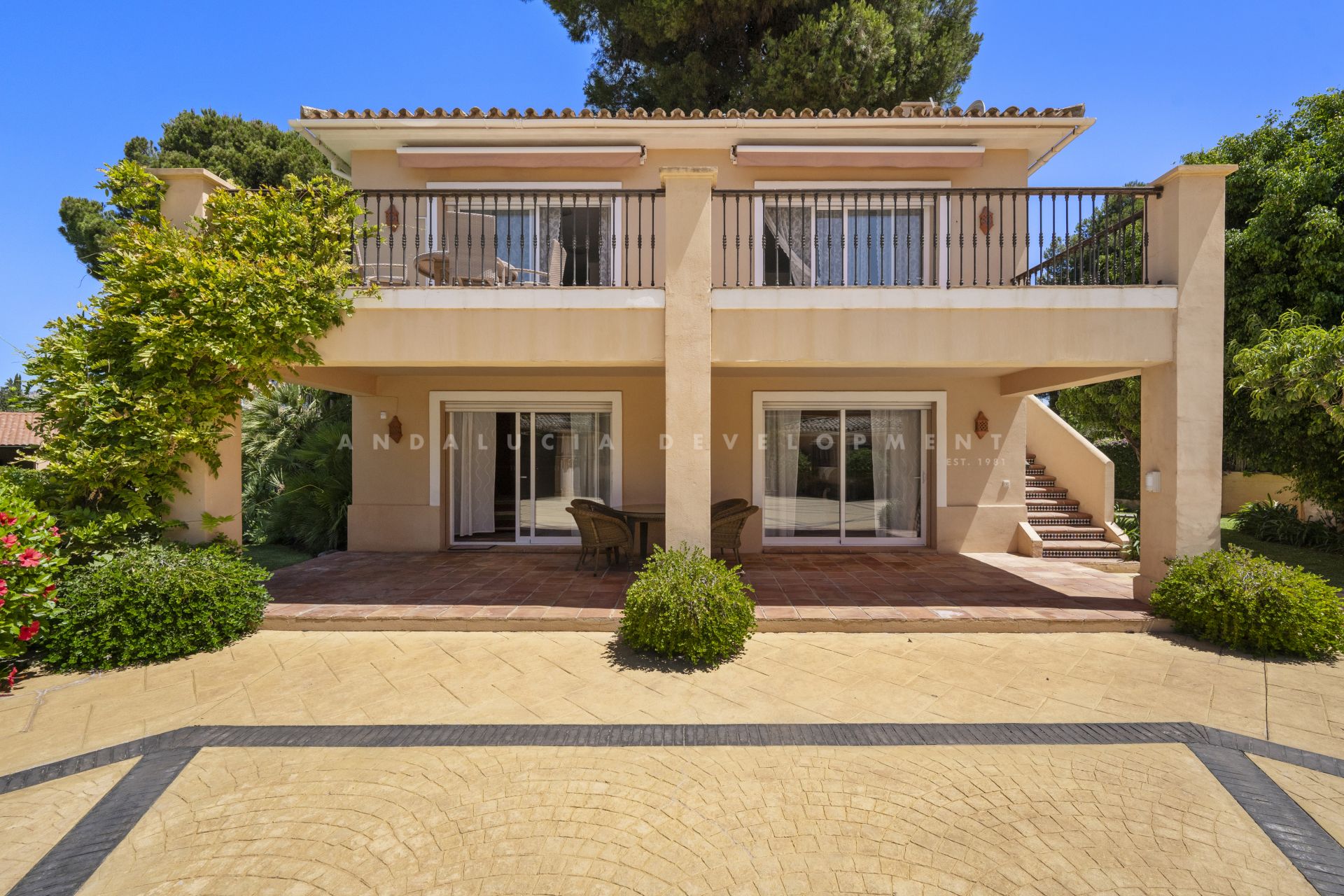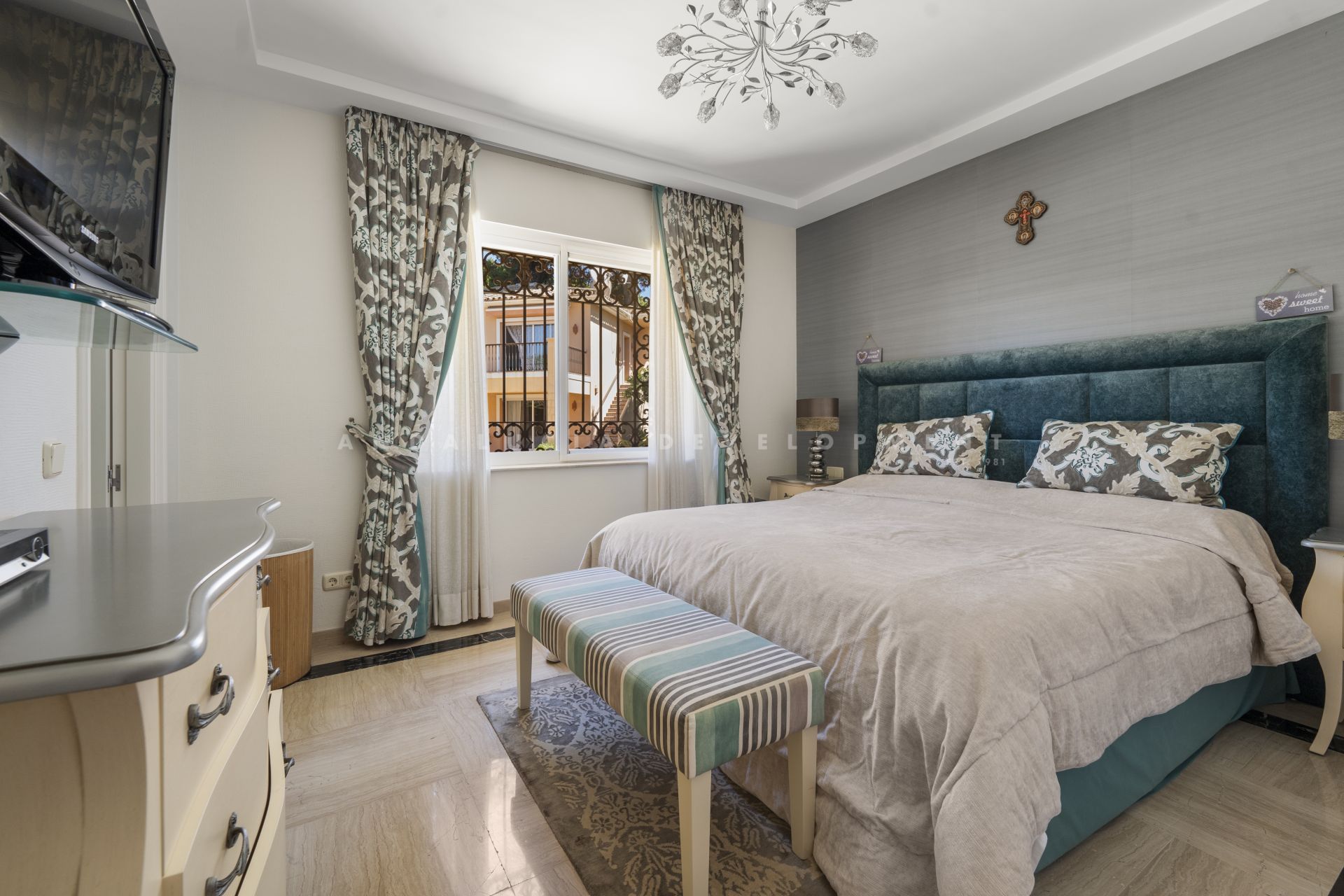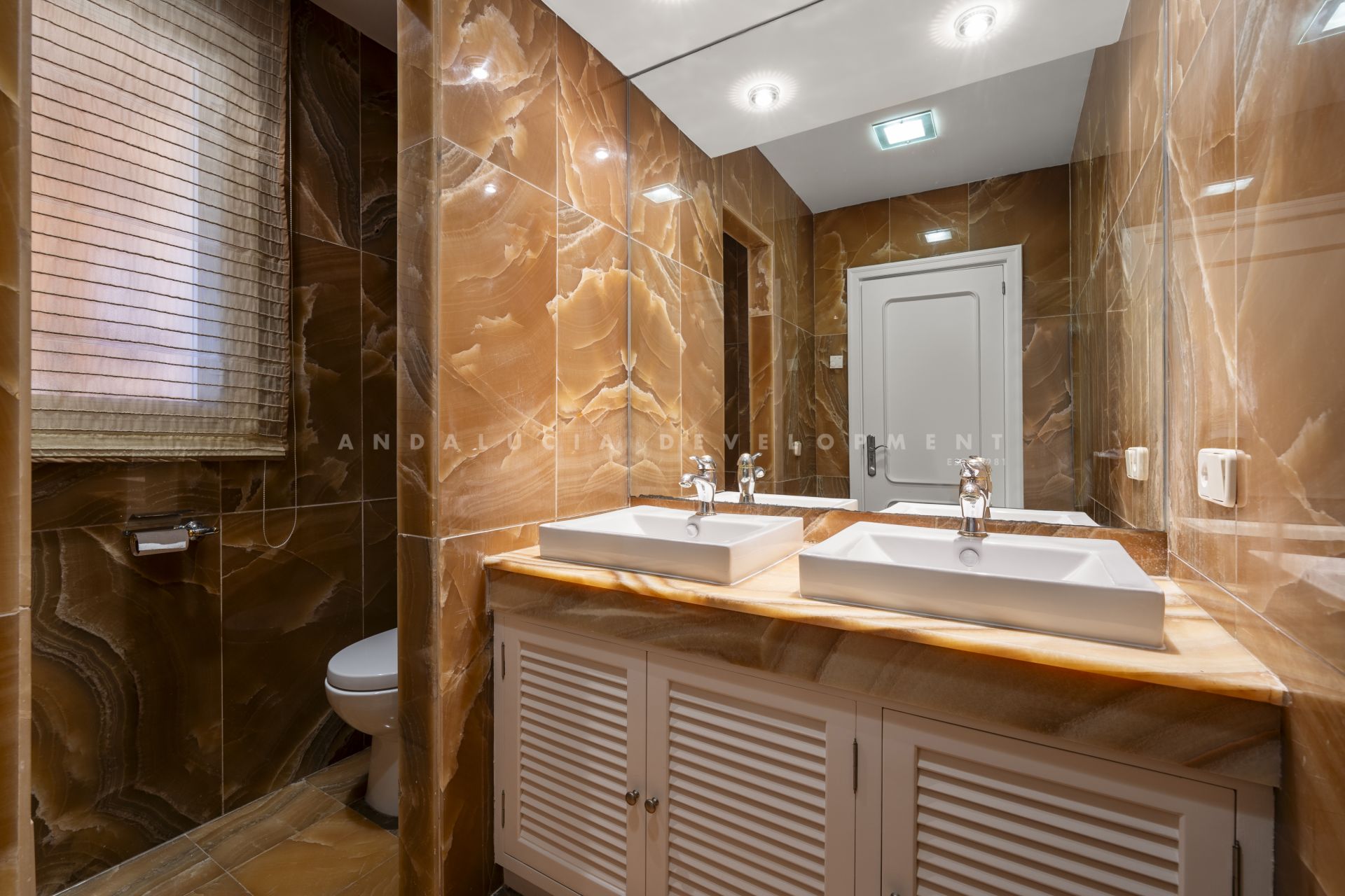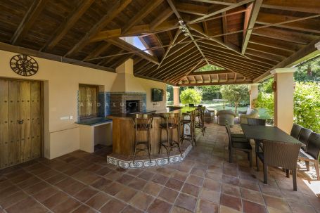 This villa is a grand beachfront estate in Estepona, set on 4,375 m² of manicured grounds. The property includes three elegant buildings, six ensuite bedrooms in the main house, and direct access to one of the finest beaches on the coast. A private gate leads from the gardens and pool straight to the sand, offering unmatched privacy and sea views. Every space in the home opens to lush gardens, terraces, and the shimmering Mediterranean beyond. Inside, light flows through open living areas, a refined dining room, and a spacious kitchen fitted with modern appliances. The design blends natural tones with marble finishes and warm wood. Upstairs, the bedrooms are luxurious and serene, each with marble bathrooms and access to a full-length terrace overlooking the sea. A separate guesthouse and staff apartment add flexibility and comfort for family or visitors. Outdoors, this villa offers space to relax and entertain. The grounds feature a large pool, children’s playground, barbecue area, and fruit trees that fill the air with a gentle citrus scent. A high-end security system and ample parking ensure peace of mind. This is a rare opportunity to own a true beachfront sanctuary that combines privacy, elegance, and timeless Mediterranean living.