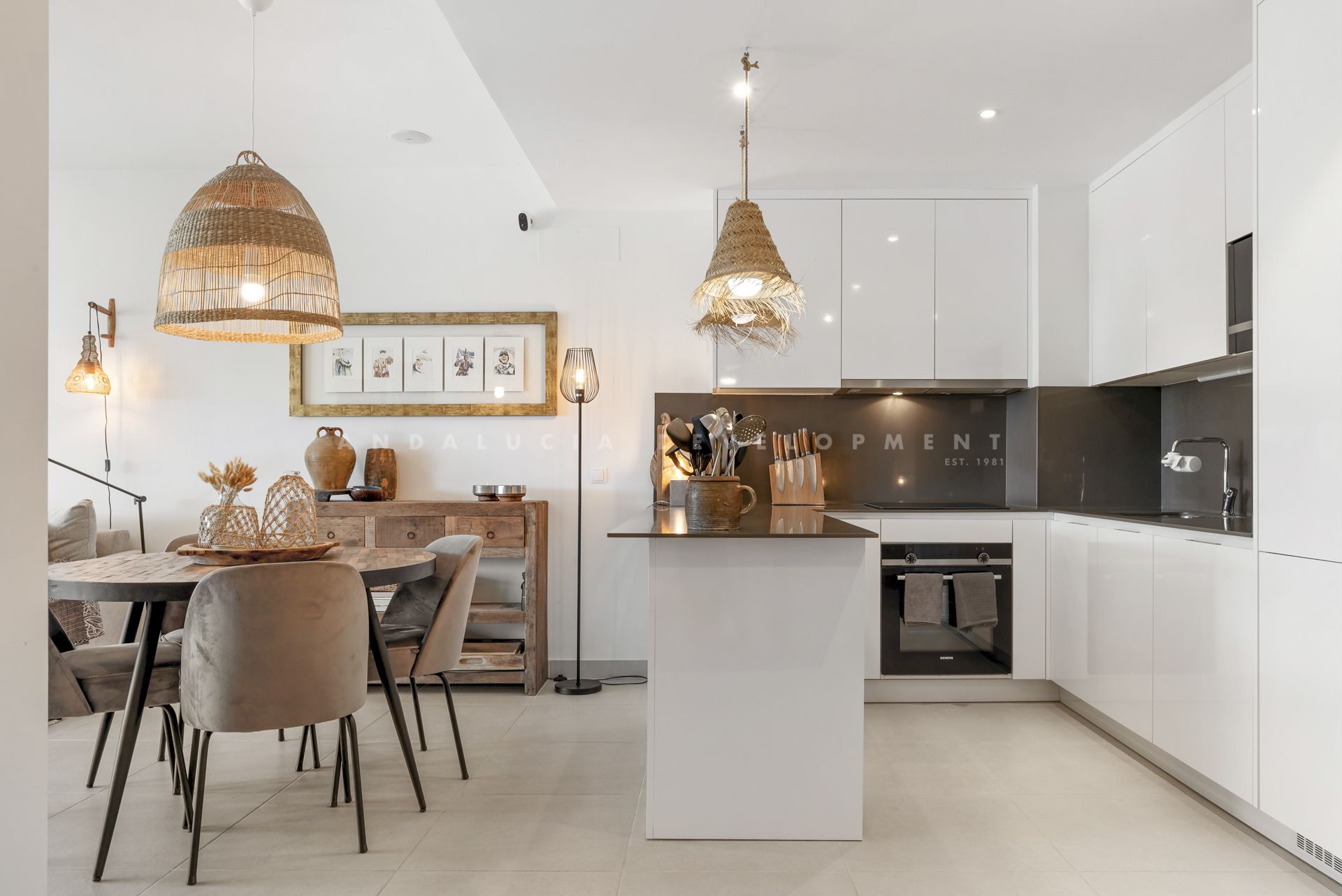 Beautiful and contemporary 2-bedroom ground-floor apartment located in the sought-after Mirador del Golf development, next to Estepona Golf Club. Built in 2021, this property combines modern design, comfort, and privacy in a peaceful setting just minutes from Estepona town, the beach, and all amenities. The apartment enjoys a southwest orientation, offering sunshine throughout the day and pleasant views over the lush gardens, the mountains, and a glimpse of the sea. The interior features a bright open-plan living and dining area with a fully fitted kitchen with Siemens appliances, creating a seamless flow of space and style. The master bedroom with en-suite bathroom and the guest bedroom with separate bathroom both offer comfort and functionality. From both the living area and master bedroom, you step onto a spacious 54 m² terrace enclosed with glass curtains, allowing you to open it fully in summer or close it to create additional living space in cooler months. The terrace leads directly to a private lush garden of almost 90 m², beautifully maintained by the community and included in the community fees. Additional features include a private parking space, storage room, a communal swimming pool, well-kept gardens, and a gym. It’s the perfect blend of villa-style living, with space, light, and a private garden, yet with the convenience, security, and easy maintenance of an exclusive gated community.