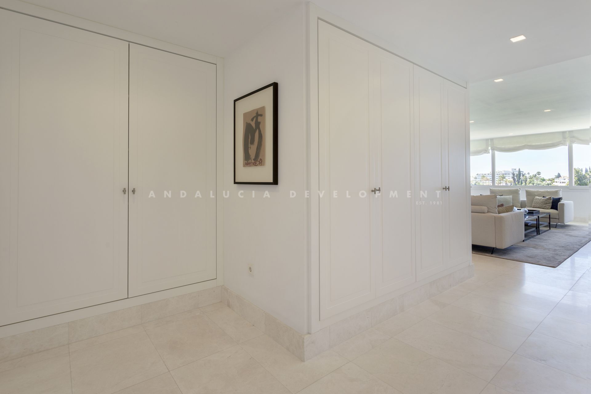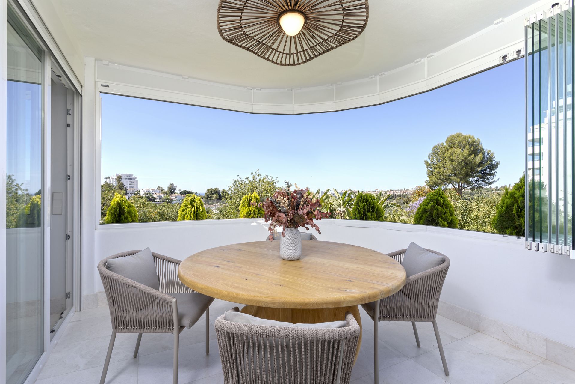 Located in one of Guadalmina Alta’s most established frontline golf communities, this bright and beautifully renovated two-bedroom, two-bathroom apartment offers a comfortable layout, timeless design, and lovely views of the green fairways, with partial sea views adding a special touch. The apartment enjoys a desirable south-facing orientation, ensuring sunlight throughout the day and serene views over the gardens and a golf course. As you enter, you’re welcomed by a hallway with built-in wardrobes that provide generous additional storage, an ideal feature for everyday practicality. The main living and dining area is open and inviting, with large windows that frame the view of the golf course, creating a peaceful and picturesque atmosphere. The kitchen, just off the living area, is both convenient and nicely designed, featuring a breakfast bar and a layout that makes it easy to stay connected with the main living space while remaining functional and discreet. The main bedroom is generously sized and has direct access to the covered terrace, just like the living area, ideal for enjoying the outdoor space year-round. The terrace features a dining area and can be fully enclosed with sliding windows, creating a cozy winter garden perfect for relaxing or entertaining in any season. The bedroom includes an en-suite bathroom with a walk-in shower and double sinks, as well as a spacious wardrobe area conveniently integrated into the bathroom. The second bedroom features built-in wardrobes and is served by a second full bathroom, also with double sinks and a walk-in shower. Practicality meets comfort with a private garage space included in the sale, ensuring secure parking year-round. Additionally, residents benefit from the convenience of ample communal parking within the urbanization. The apartment is part of a secure, low-density complex with a quiet, residential atmosphere, making it ideal as a main home or a lock-up-and-leave holiday base. Its location is hard to beat: just a one-minute walk to the 4-star Barceló Marbella Hotel, perfect for coffee or casual dining, and only five minutes to the Real Club de Golf Guadalmina. As a member, you’ll have access to top-tier facilities including a swimming pool, tennis courts, a restaurant, and, of course, the renowned golf course.